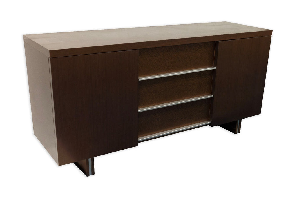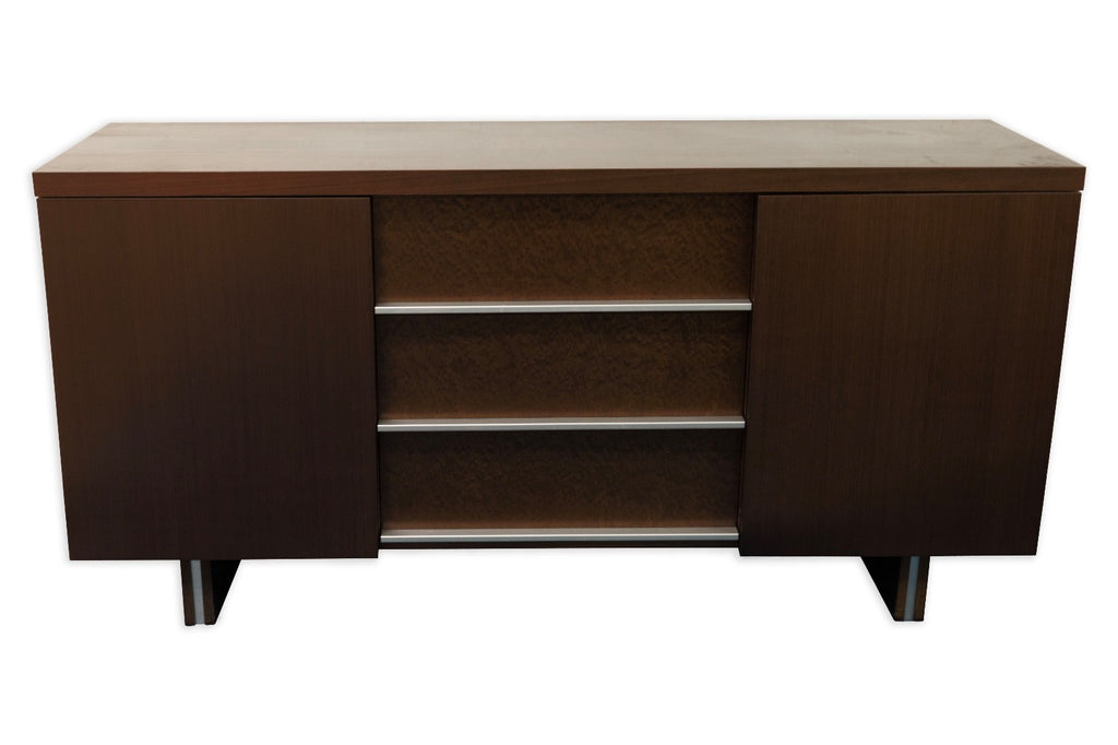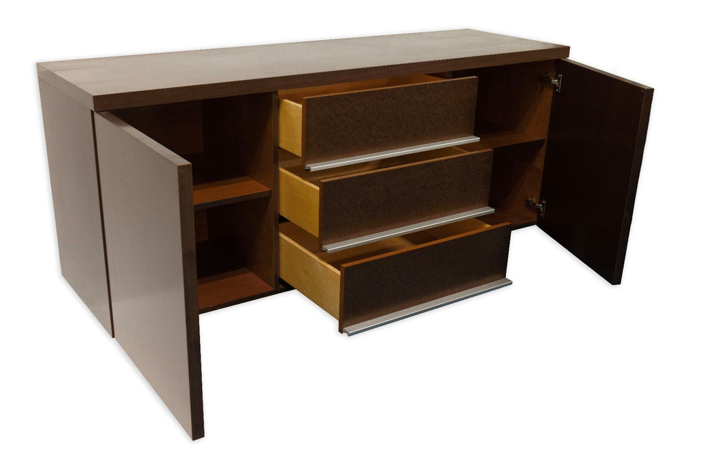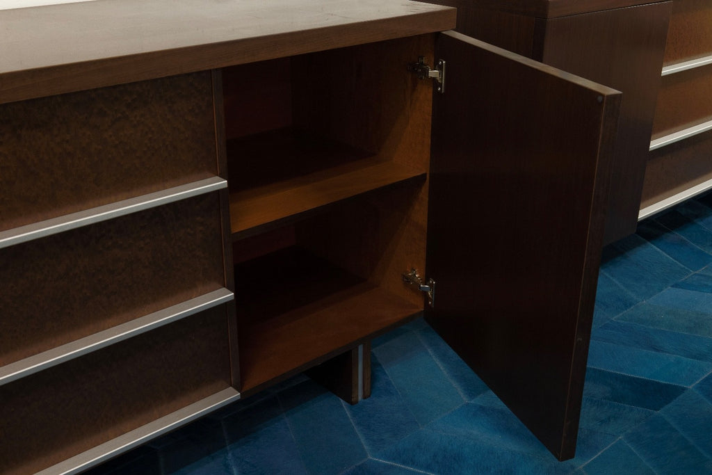 This Excelsior Designs credenza, made in Italy, exemplifies refined modern craftsmanship with a focus on clean geometry and functional elegance. The piece features a rich, dark wood finish with a smooth, minimalist exterior that highlights the precision of its construction. The front opens to reveal integrated drawers and open shelving, accented by subtle metal trim that adds a contemporary contrast to the warm wood tones. Raised on understated tapered legs, the credenza maintains a light, architectural presence while offering ample storage for dining, living, or office use. There are multiple available and can be bought as a pair.The credenza is in good condition, with a small chip to the top as shown above. It measures 33.5 inches in height, 69 inches in width, and 21.25 inches in depth.