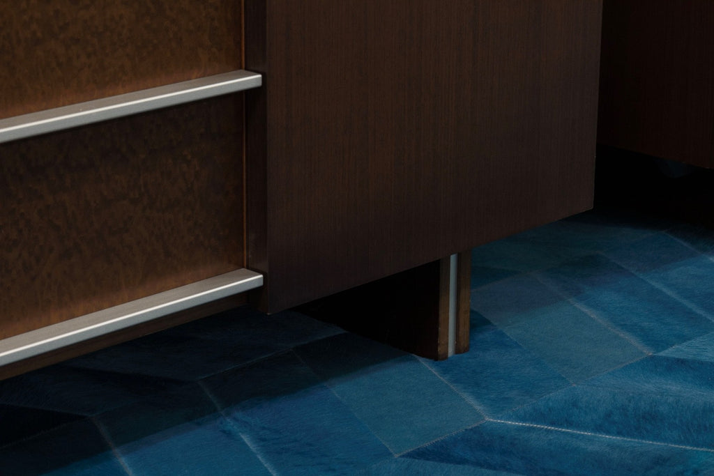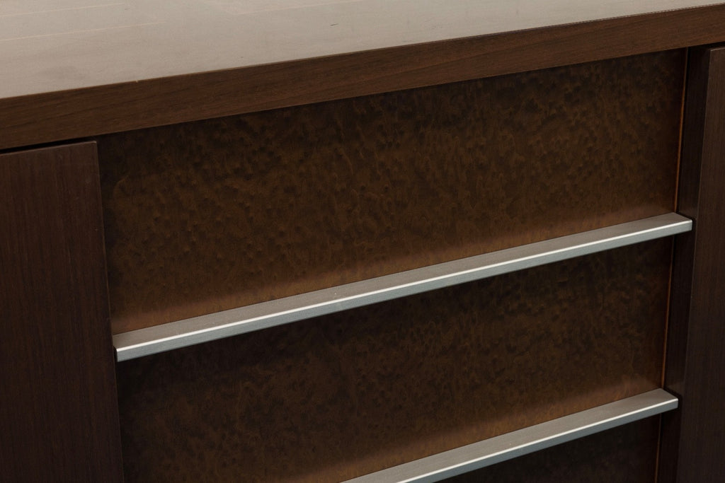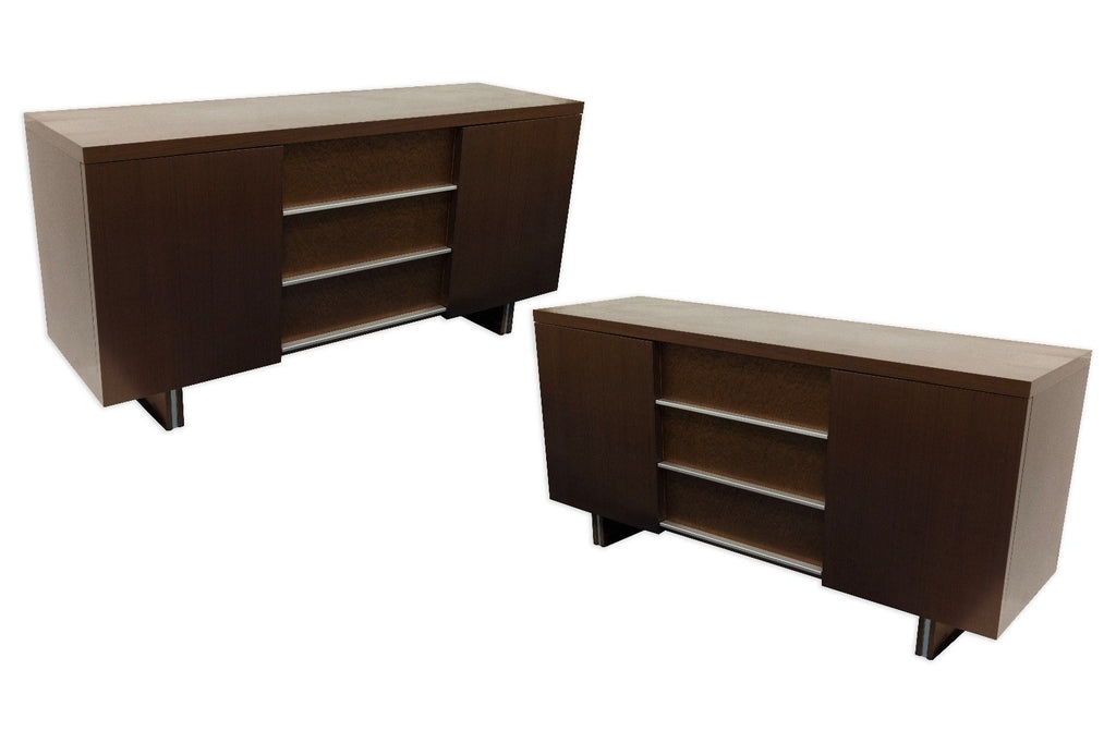 This pair of Excelsior Designs credenzas, made in Italy, exemplifies refined modern craftsmanship with a focus on clean geometry and functional elegance. Each credenza features a rich, dark wood finish with a smooth, minimalist exterior that highlights the precision of its construction. The front opens to reveal integrated drawers and open shelving, accented by subtle metal trim that adds a contemporary contrast to the warm wood tones. Raised on understated tapered legs, the credenzas maintain a light, architectural presence while offering ample storage for dining, living, or office use. The pair are in good condition although one has a small chip to the top as shown above. They measure at 33.5 inches in height, 69 inches in width and 21.25 inches in depth. Can also be purchased separately in a different posting.