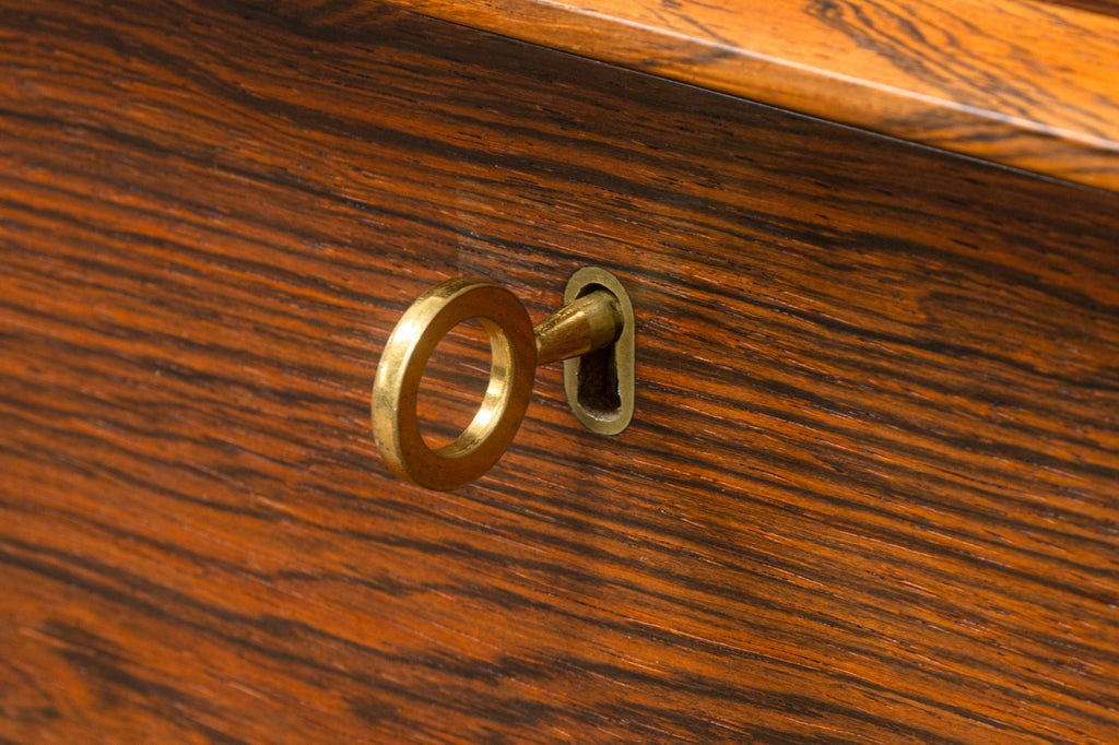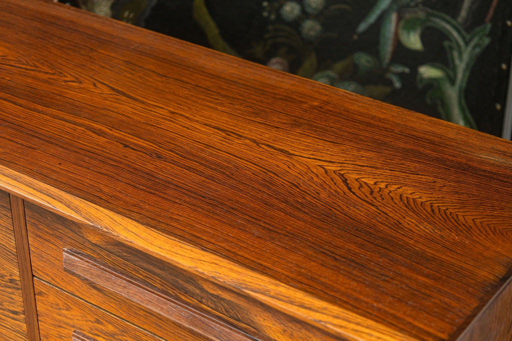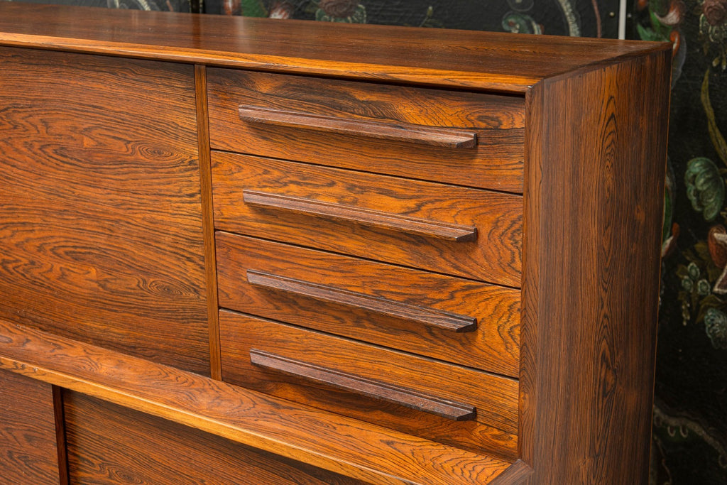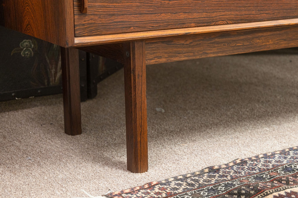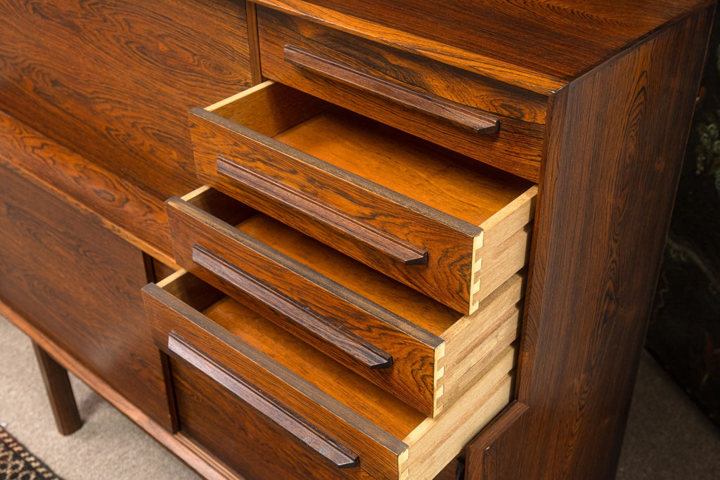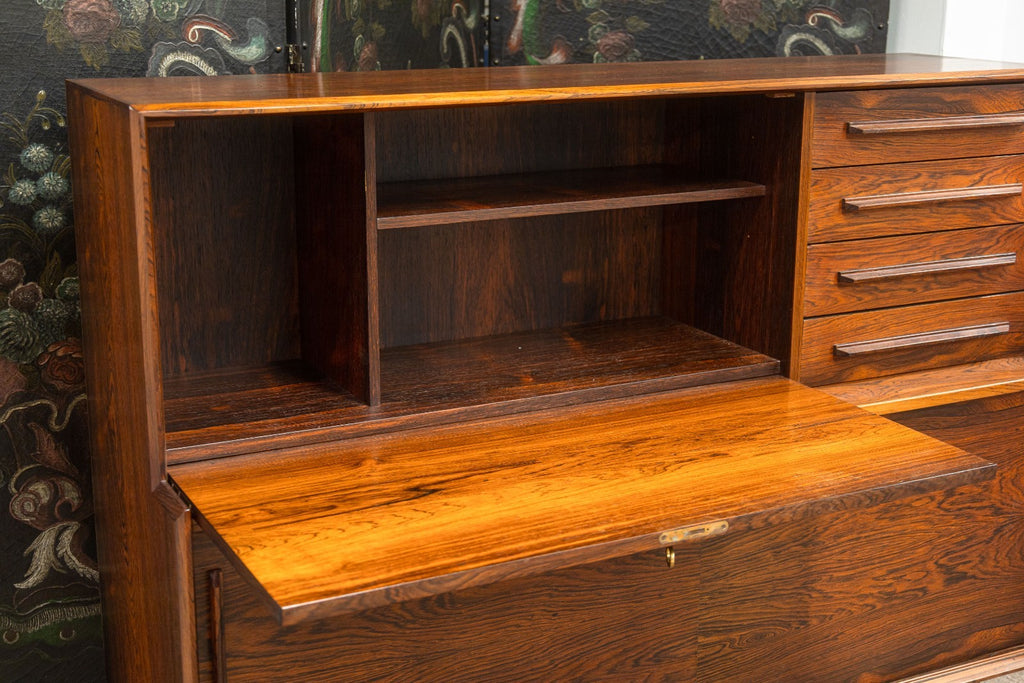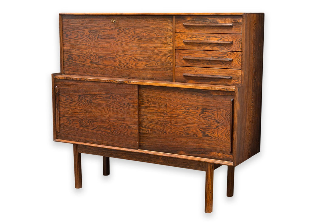 A vintage 1960s Danish secretary desk. This is a beautiful mid-century modern desk featuring a stunning rosewood construction. This desk boasts a classic 1960s Danish style. The freestanding design features a set of 4 drawers on the right, a locking drop down desk and cabinet on the left, and the bottom features two sliding cabinet shelves. This desk is in very good vintage condition. It measures 44 inches tall, 49.5 inches wide, and 16.5 inches deep. The drop down desk measures 15 x 31.5 inches.