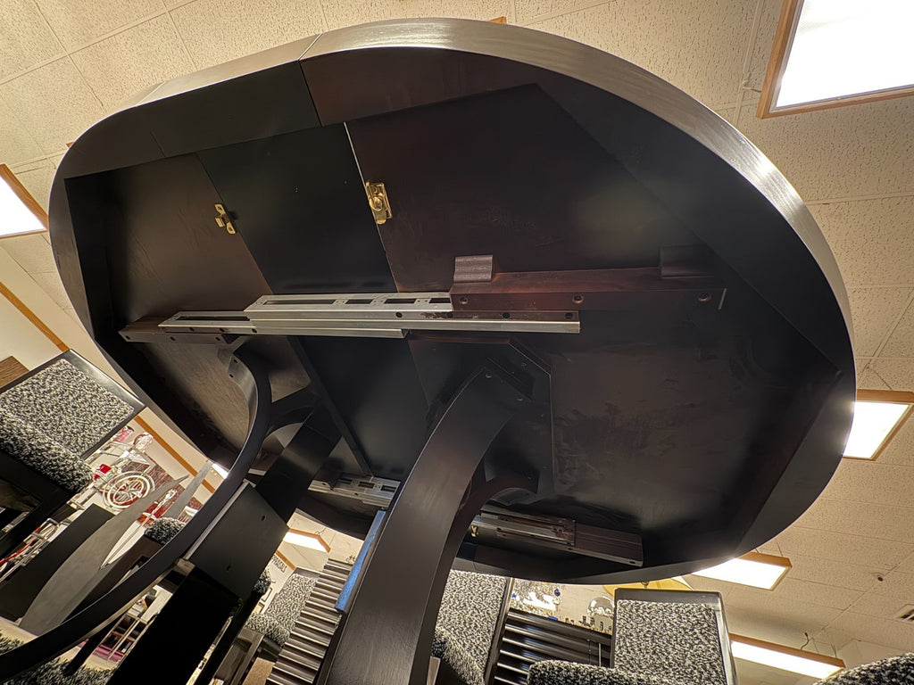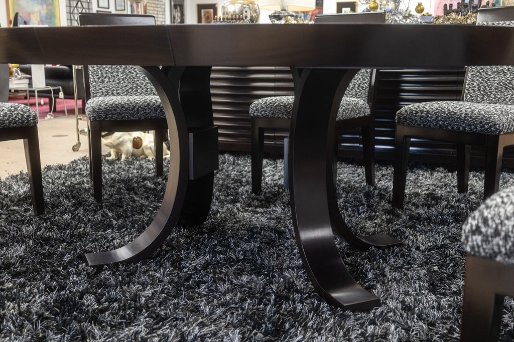 A Kindel Furniture Co Mark table by Dorothy Draper. This is a gorgeous contemporary-made, baroque-style custom made dining table. This table is manufactured by local Michigan company Kindel Furniture, and designed by Dorothy Draper. Dorothy Draper was a pioneer in the design community. She was the very first individual to open an interior design business in the US, all the way back in the year 1923. Through her company, Draper delved into the modern baroque style, and created many shapes and pieces that are still iconic today. The Mark table was first designed by Draper fro the lobby of the Mark Hopkins Hotel in San Francisco. This custom made version of Draper's original design features a cherry wood construction, and a large oval table top with an accenting table leaf. The table features the original Kindel tagging plaque on the underside as pictured. It measures 29.25 inches tall, 60 inches wide, 72 inches long with the leaf, and 60 inches long without it.