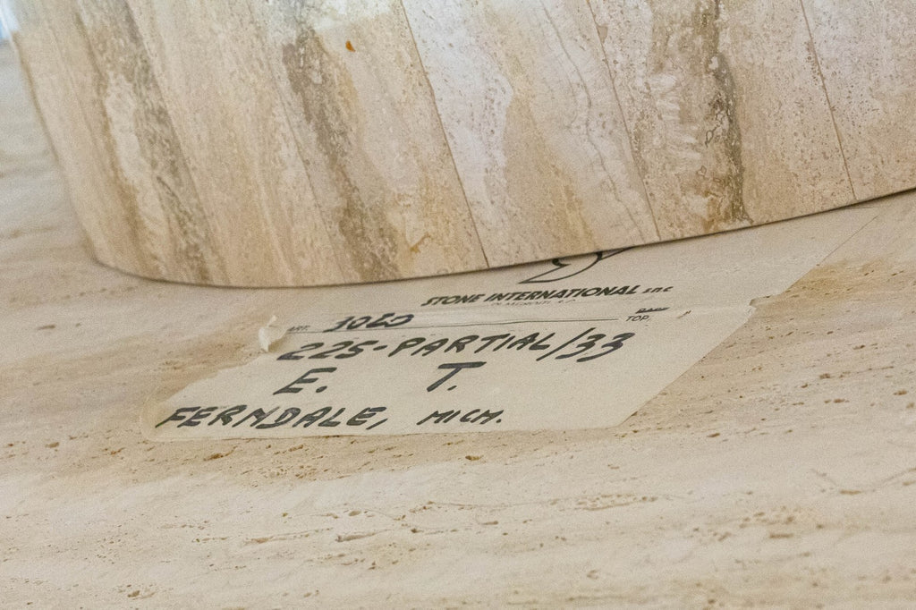 A vintage Italian travertine stone dining table. This is a gorgeous vintage dining table featuring a classic travertine stone construction, popular in the 70s and even hotter now. This table has a large oval table top with rounded edges, and sits atop a matching oval pedestal style base. This table is in very good vintage condition. It measures 28.5 inches tall, 79 inches long, and 47b inches wide.