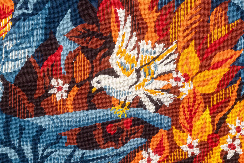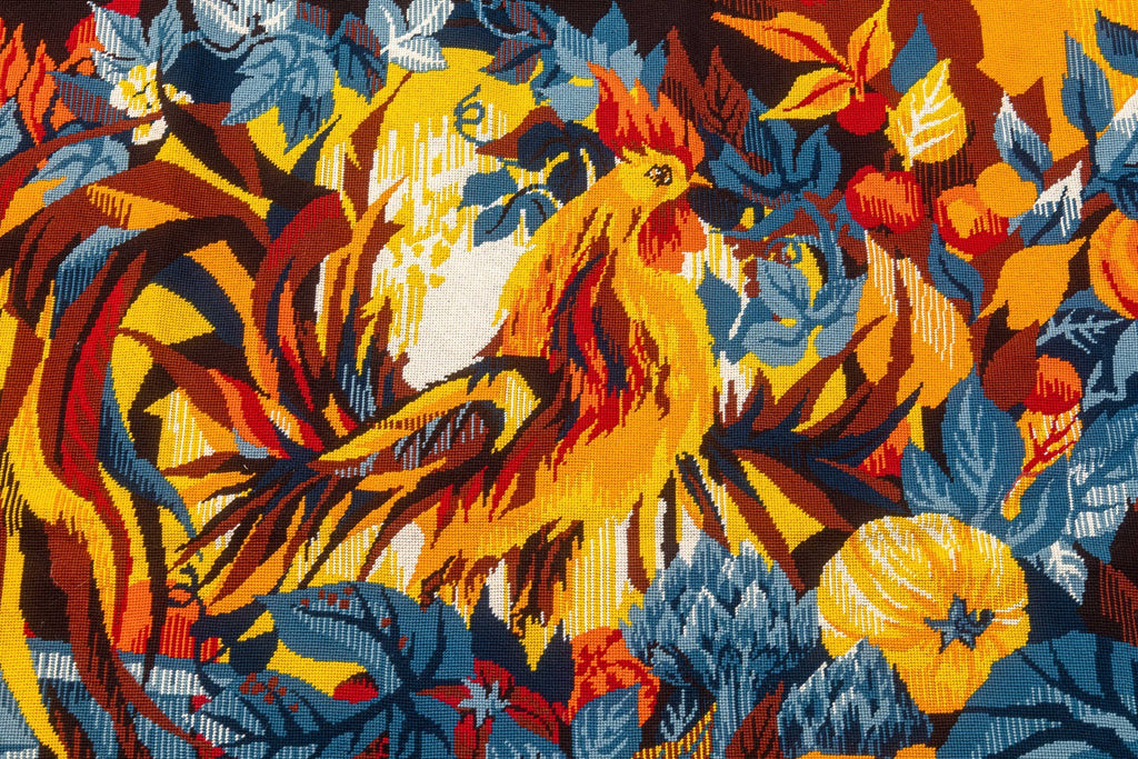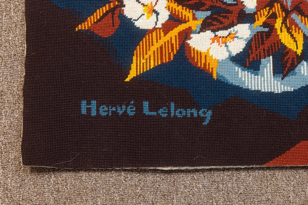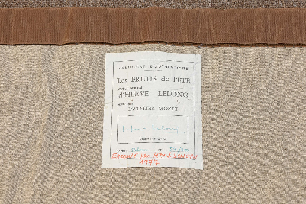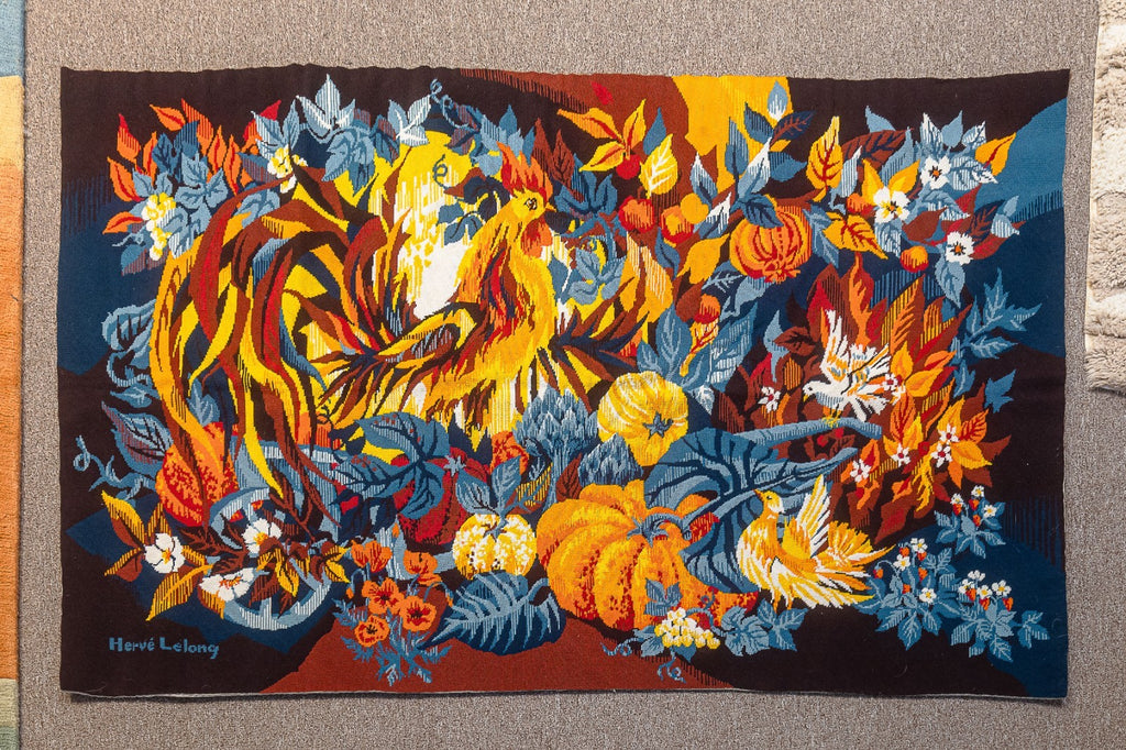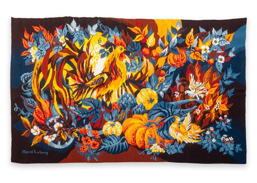 Lelong was known for producing detailed tapestry compositions that combined natural subjects with decorative pattern and color. His work reflects the continued tradition of French textile design in the late 20th century while incorporating modern graphic elements. A signed limited-edition tapestry such as this offers collectors an example of Lelong’s textile work and the revival of decorative wall tapestries during the 1970s.