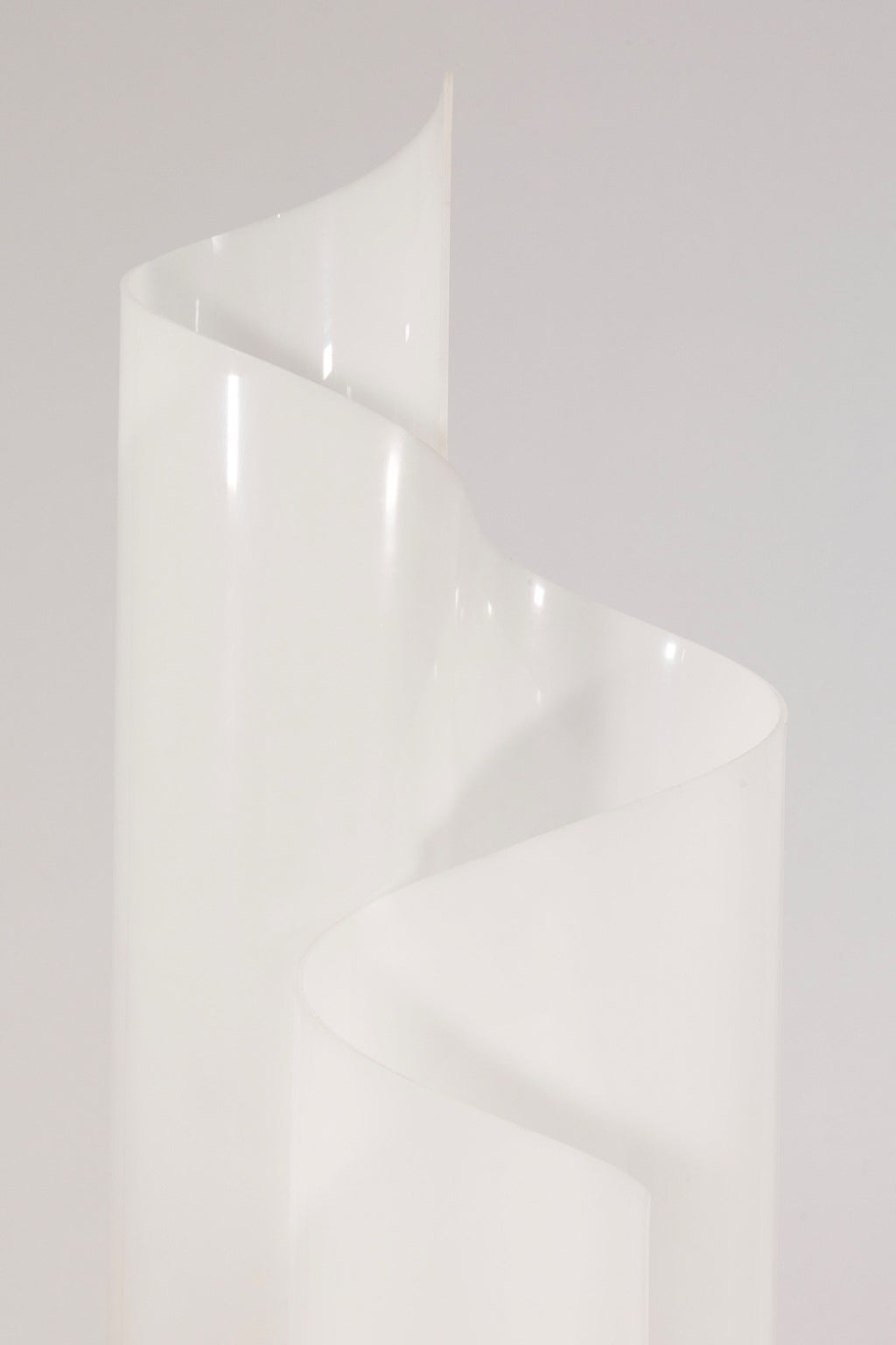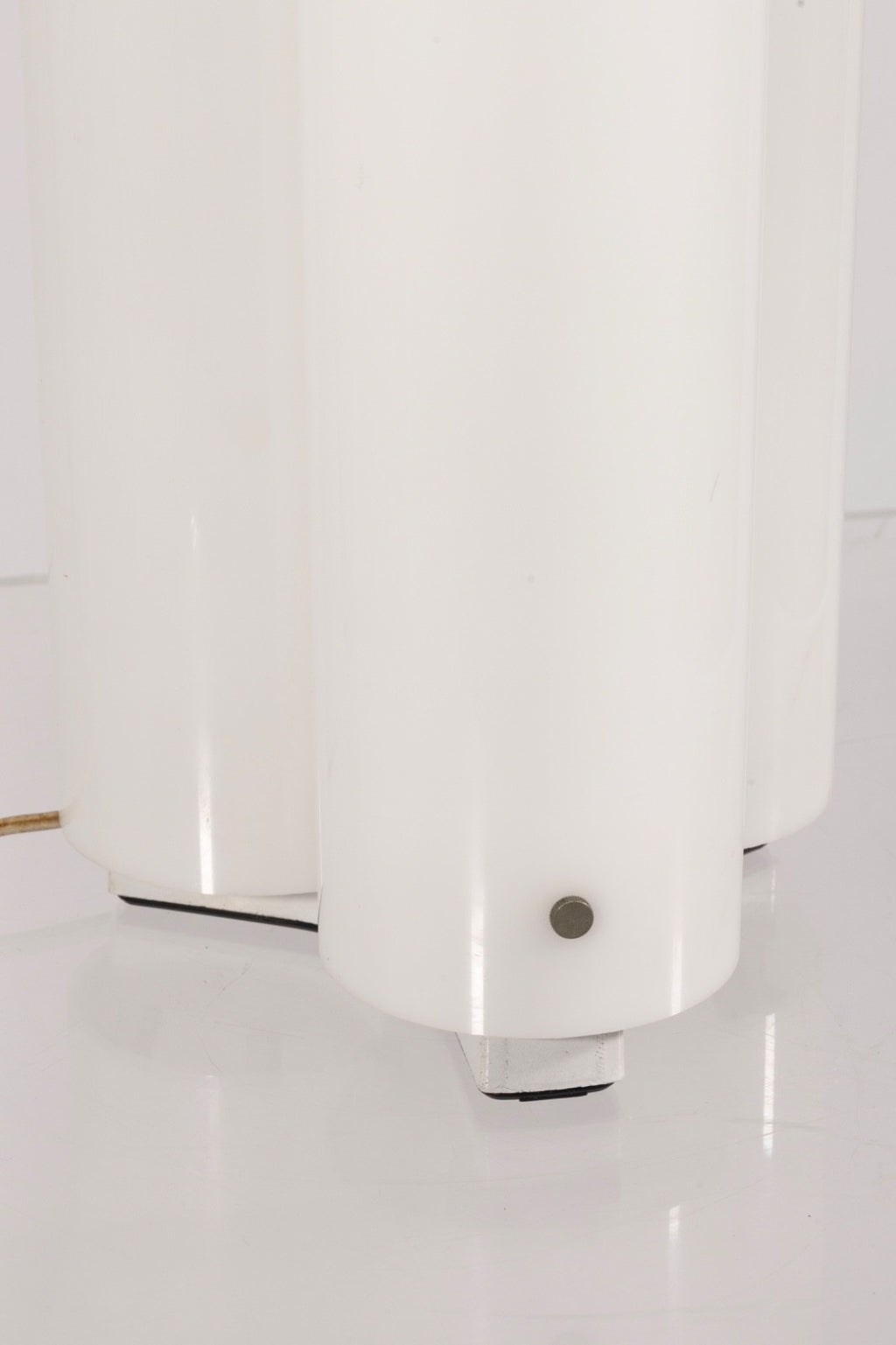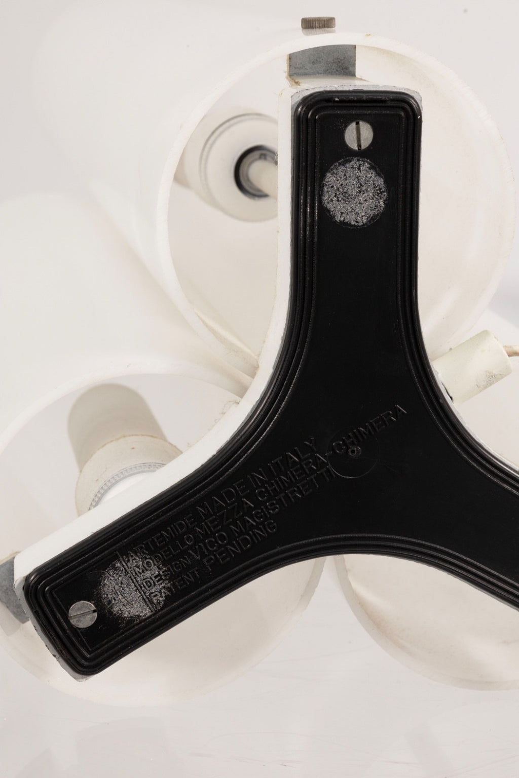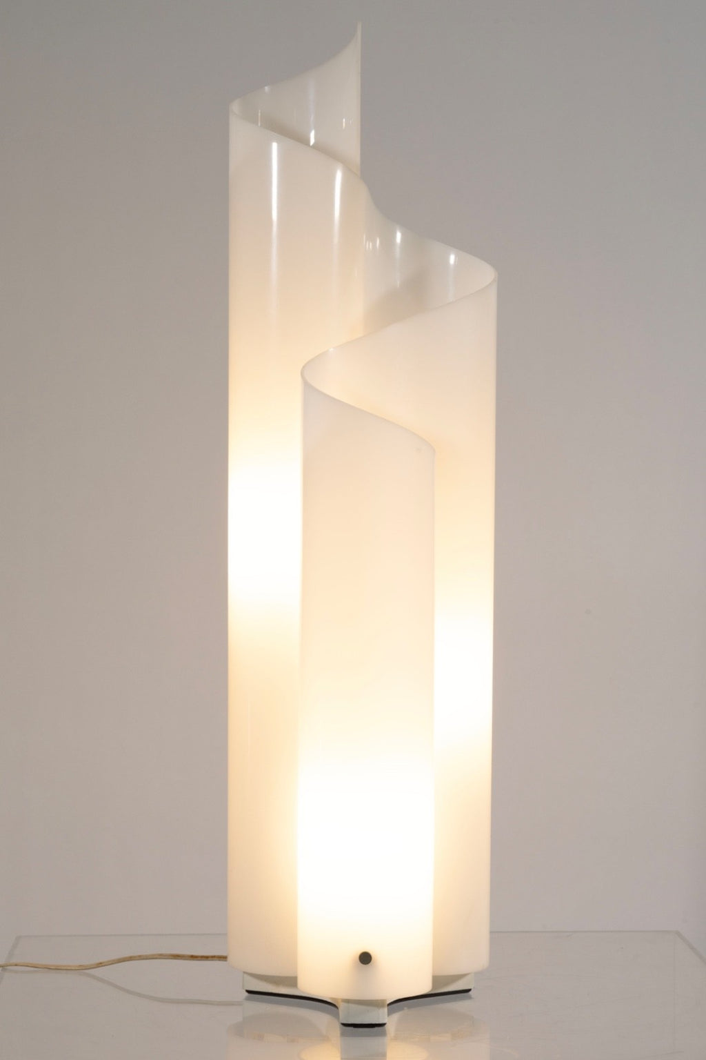 This Artemide "Mezzachimera" table lamp, designed by Vico Magistretti, is an iconic work of Italian modern lighting that seamlessly blends sculptural form with atmospheric illumination. Crafted from white diffused acrylic, the lamp features a fluid, folded silhouette that creates a dynamic sense of movement and visual depth. When illuminated, the diffused acrylic material softly disperses light throughout the form, producing a warm, even glow that highlights its organic contours without glare. The lamp is in good vintage condition, additionally the lamp measures at 31.25 inches in height and has a diameter of 8.5 inches.