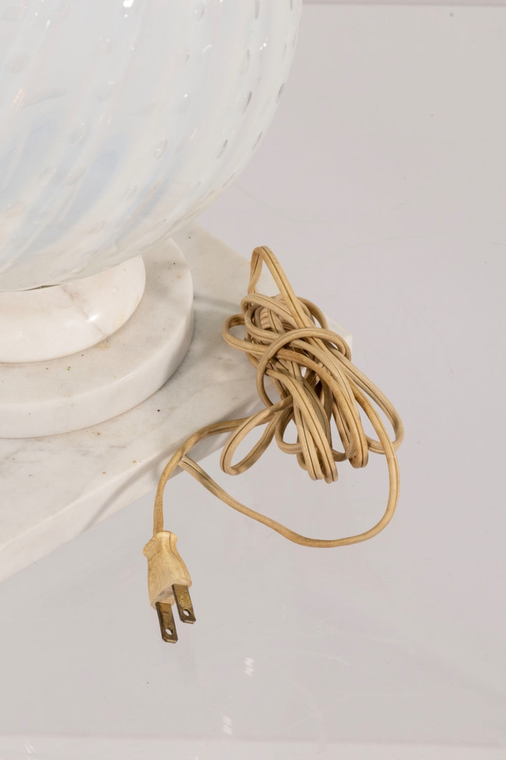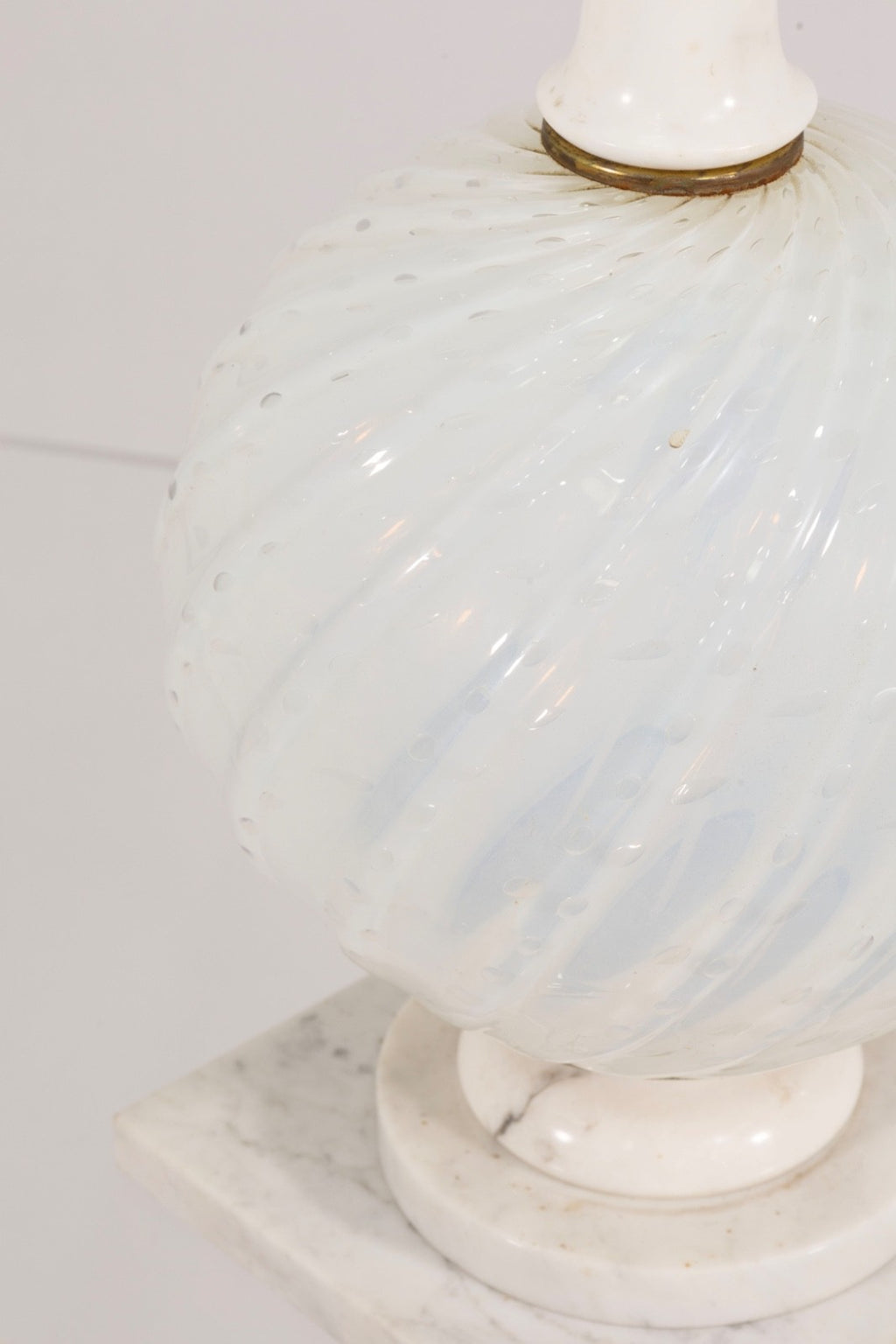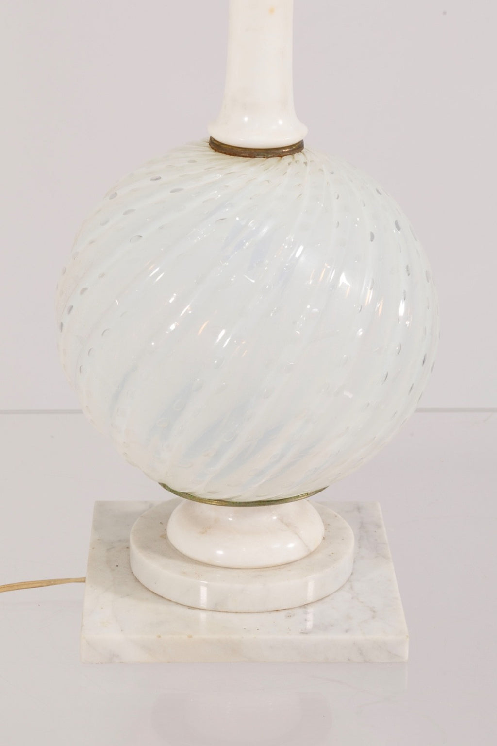This vintage Murano glass and marble table lamp showcases timeless Italian craftsmanship paired with elegant, balanced proportions. The lamp features a hand-blown Murano glass base with a softly rounded spherical form, distinguished by subtle swirling inclusions that add depth and visual texture to the translucent white glass. A slender glass stem rises gracefully from the base, accented with understated brass hardware for a refined touch. The lamp is in good vintage condition and measures at 41.75 inches in height and a diameter of 15 inches.