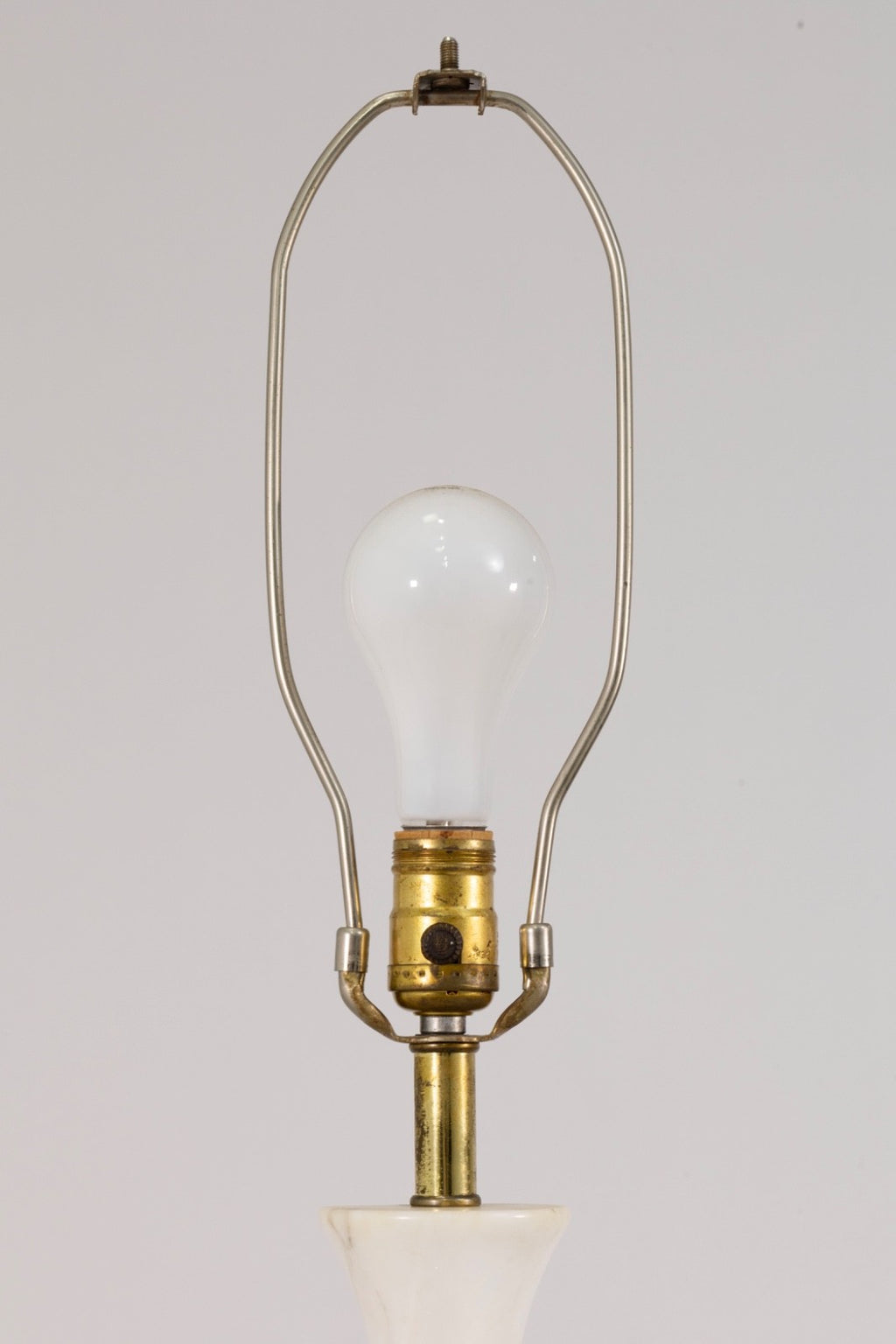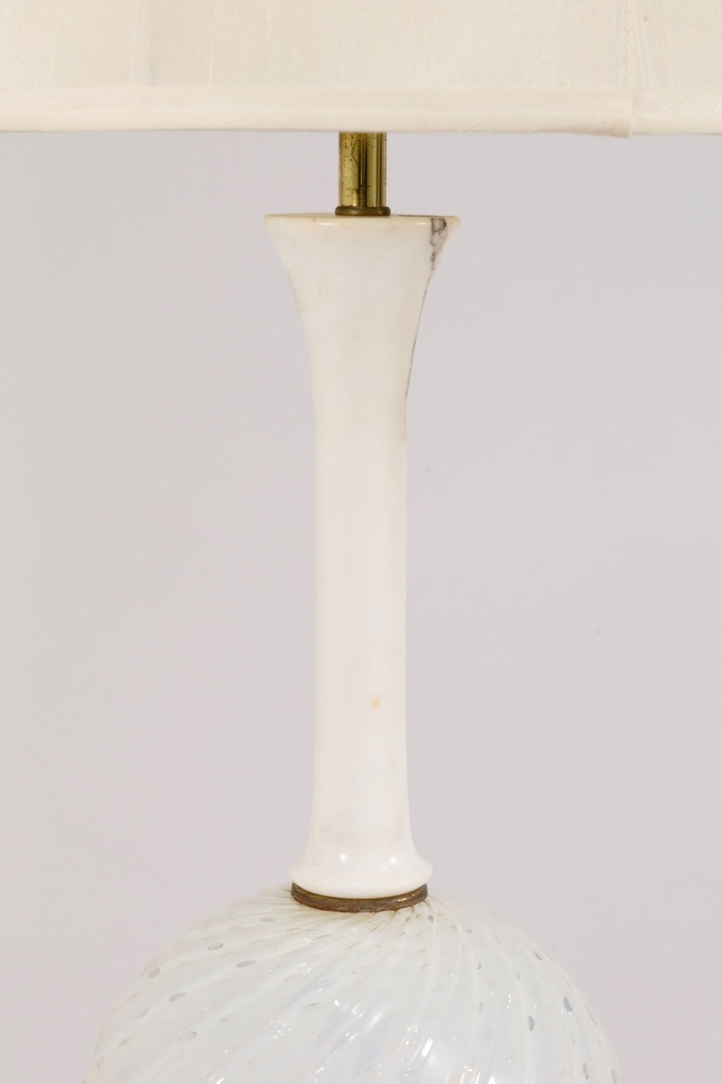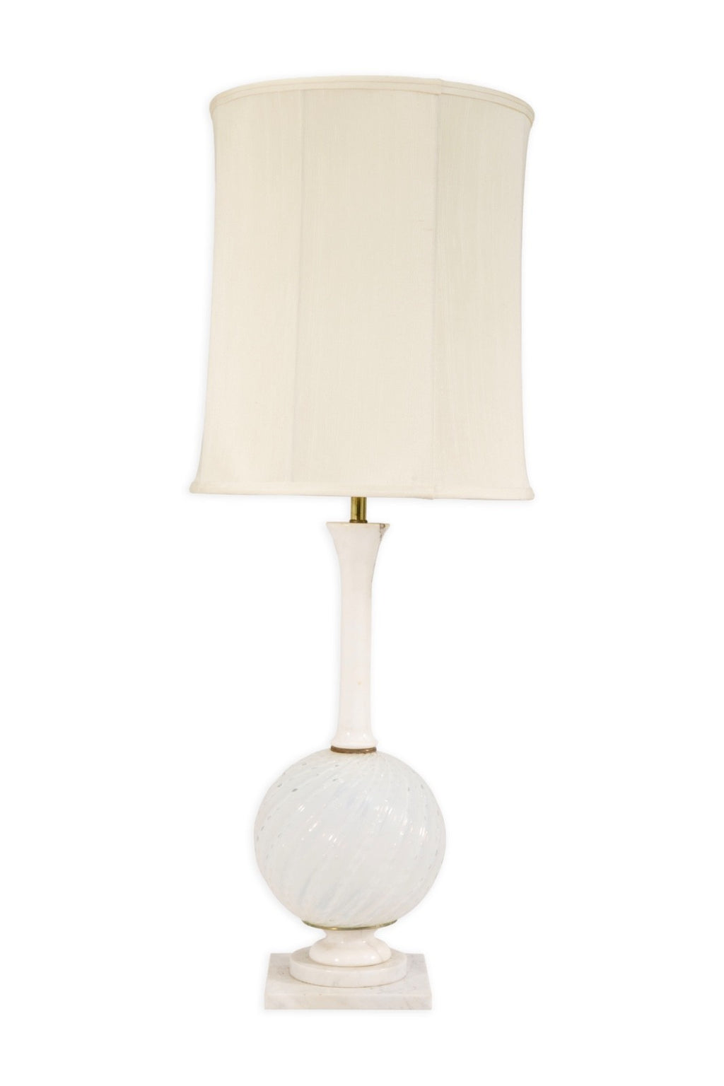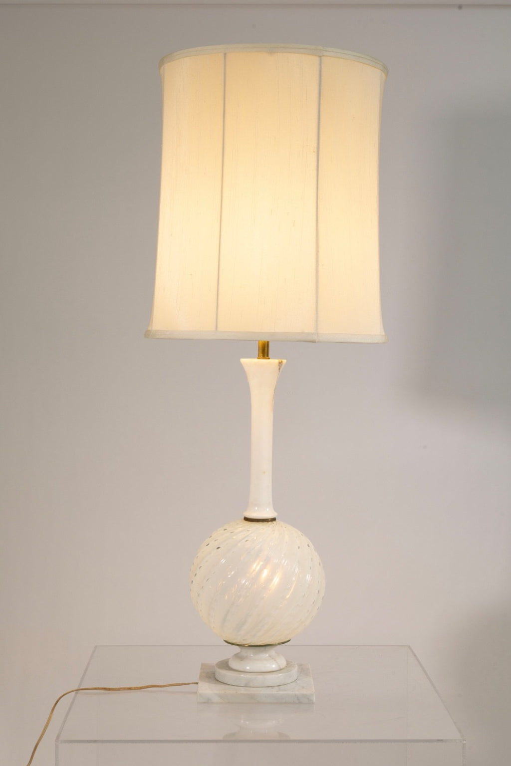 This vintage Murano glass and marble table lamp showcases timeless Italian craftsmanship paired with elegant, balanced proportions. The lamp features a hand-blown Murano glass base with a softly rounded spherical form, distinguished by subtle swirling inclusions that add depth and visual texture to the translucent white glass. A slender glass stem rises gracefully from the base, accented with understated brass hardware for a refined touch. The lamp is in good vintage condition and measures at 41.75 inches in height and a diameter of 15 inches.