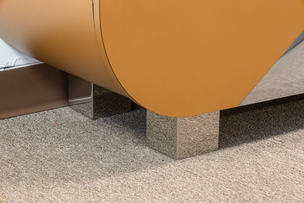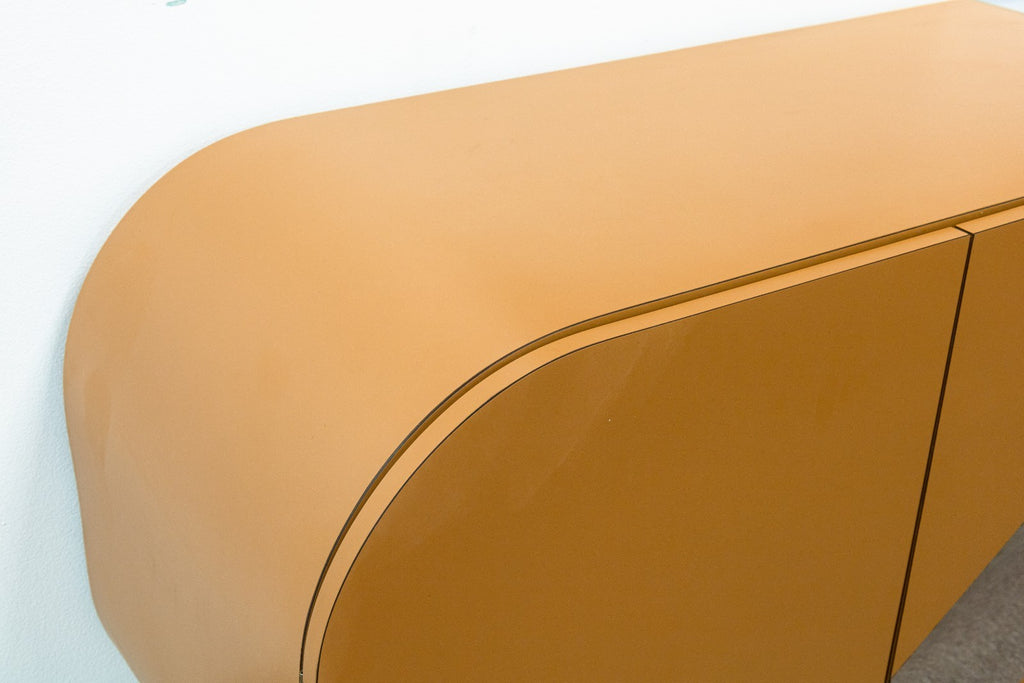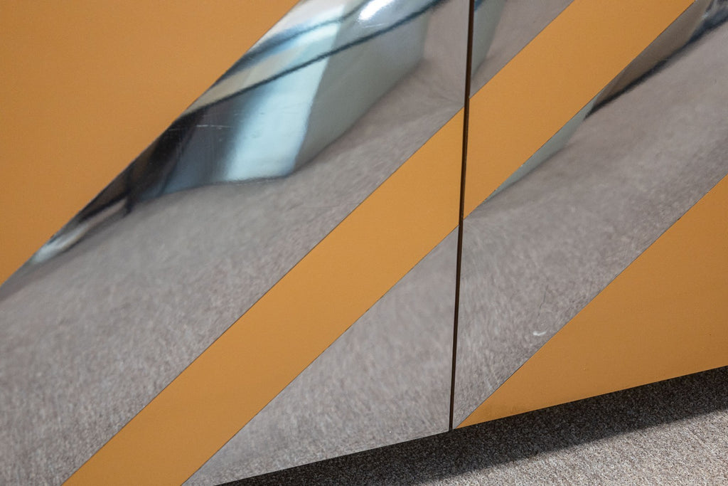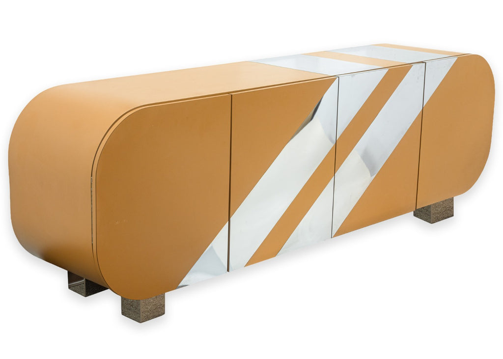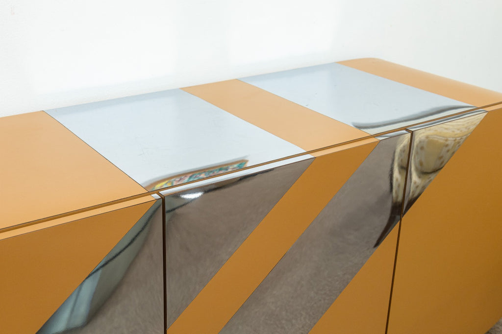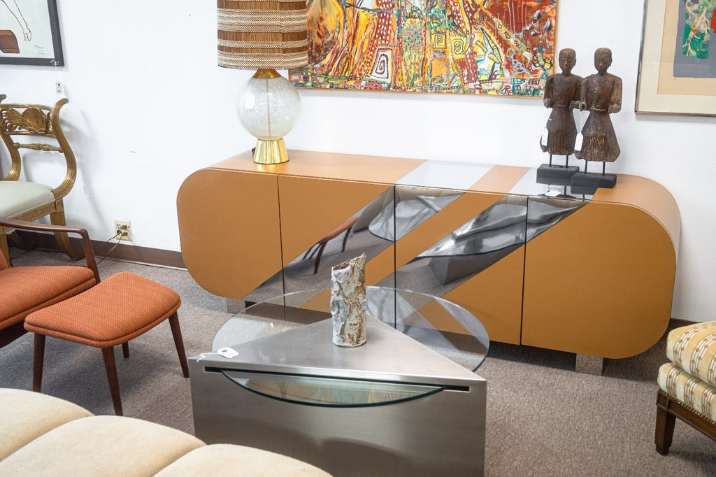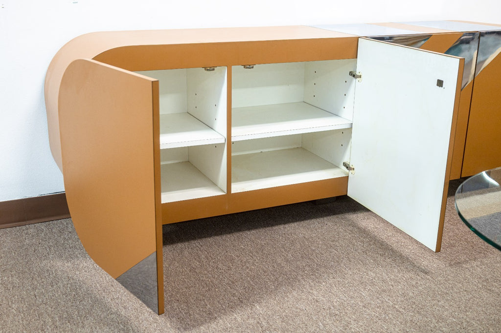 A custom made contemporary sideboard credenza. This wonderfully crafted custom made cabinet features a rounded rectangular shape with squared off legs. It features a full wood body, likely an MDF construction, a beige/orange laminate finish, with chrome accenting stripes moving diagonally across the body and covering the legs. Each of the four doors opens to reveal a set of adjustable shelves with white laminate finishes. This whole cabinet is in good to fair condition overall, with some wear and tear to the finishes as well as missing shelf studs. This piece measures 28 inches tall, 84.25 inches long, and 18.25 inches deep.