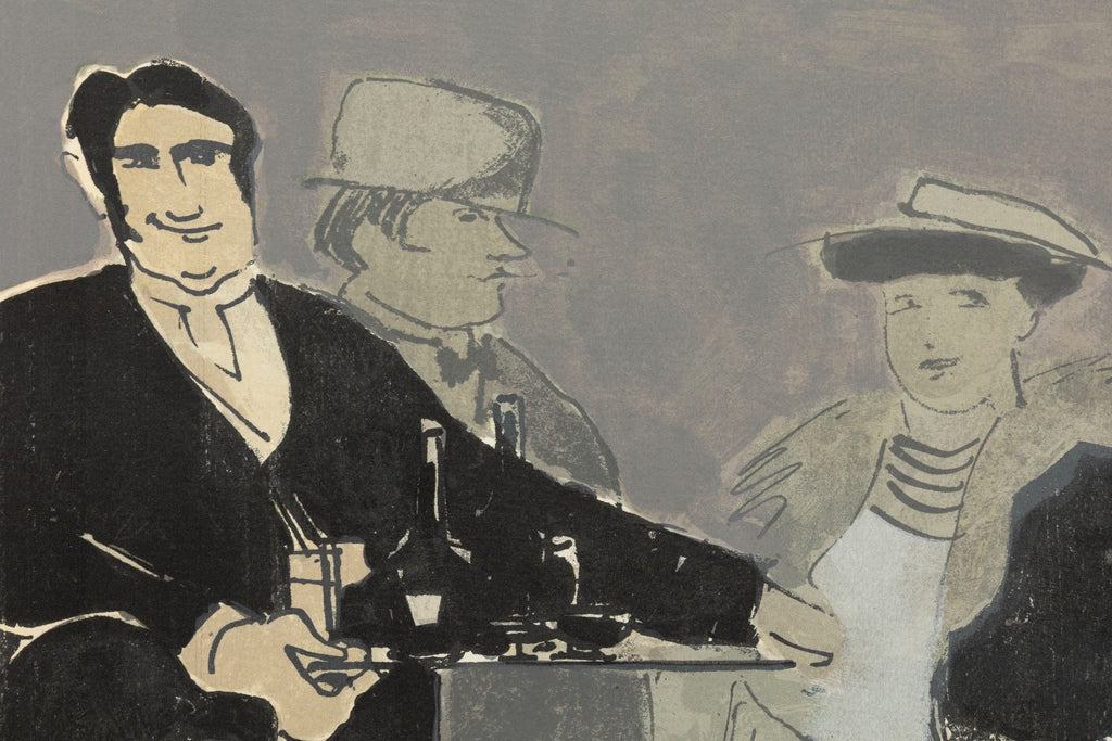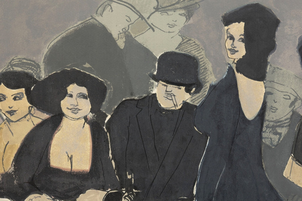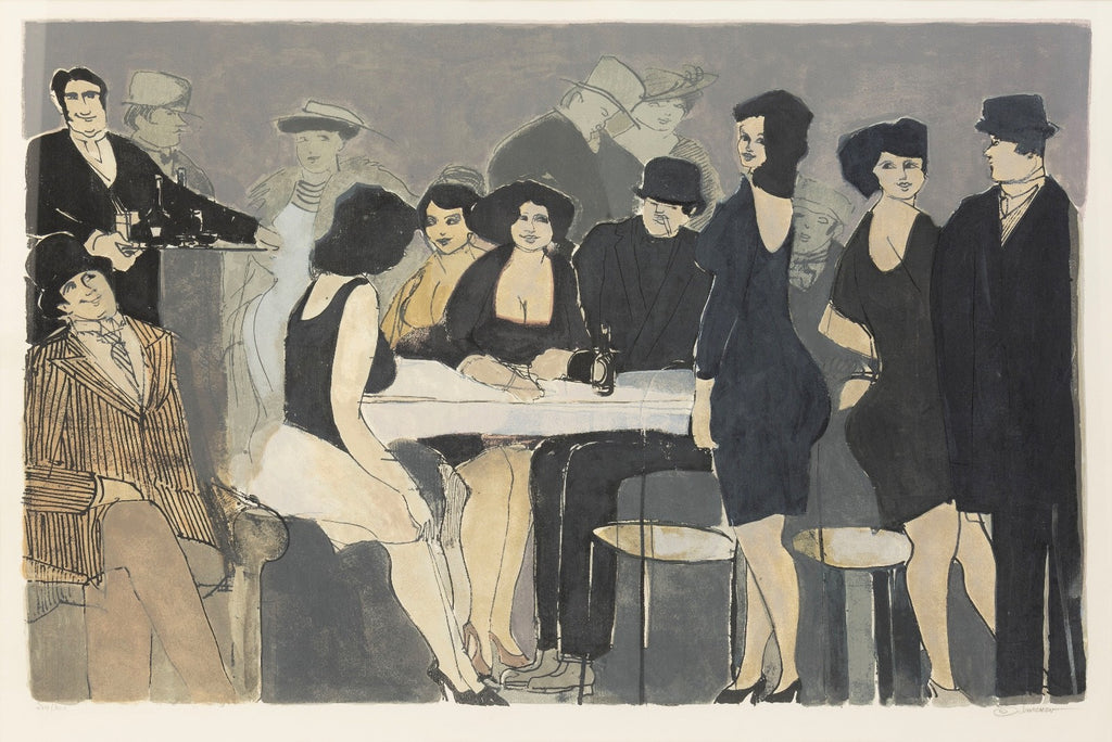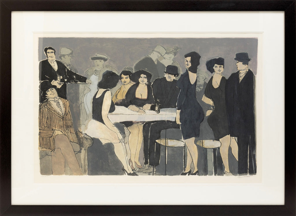 A modern figurative lithograph titled "Simplizissimus II" by David Schneuer. Hand signed in pencil on the lower right with an annotation of 230/300 on the lower left. The composition depicts a stylized café or cabaret scene rendered in a restrained, graphic palette. Elongated figures dressed in early 20th-century attire gather around a central table, their simplified forms and expressive postures evoking the social satire and urban elegance associated with European modernism. Subtle washes of gray, black, and muted earth tones create atmosphere and depth while emphasizing line and gesture. This work reflects Schneuer’s refined draftsmanship and his engagement with modern figurative tradition and narrative composition. Dimensions: 38"h x 51.5"w x .75"d (framed). In very good condition.