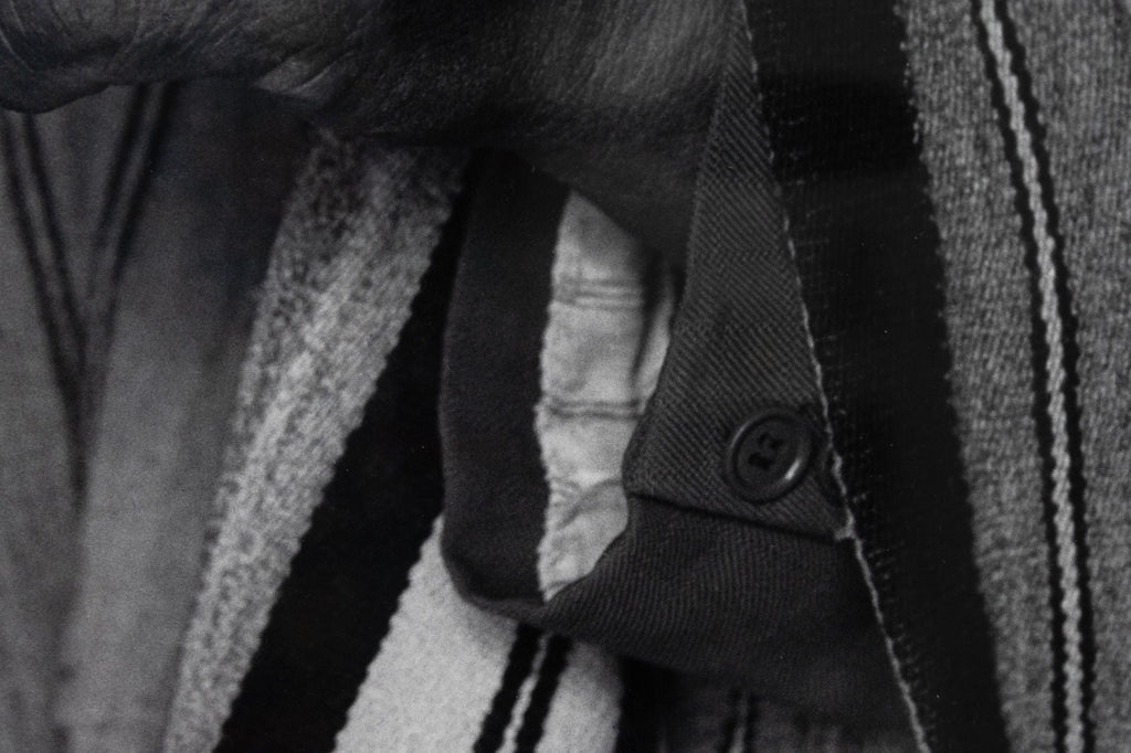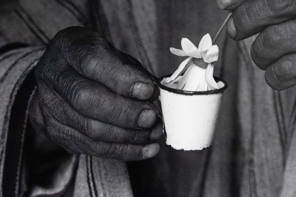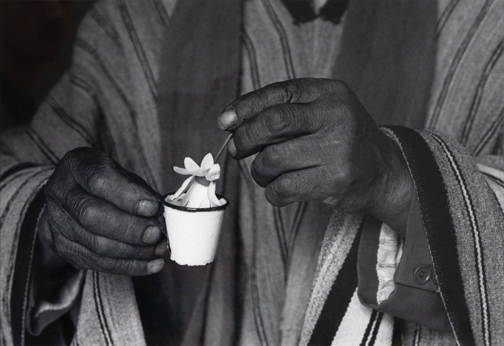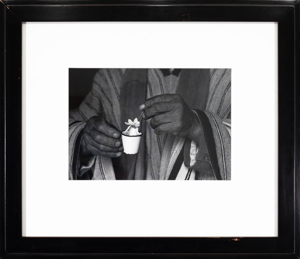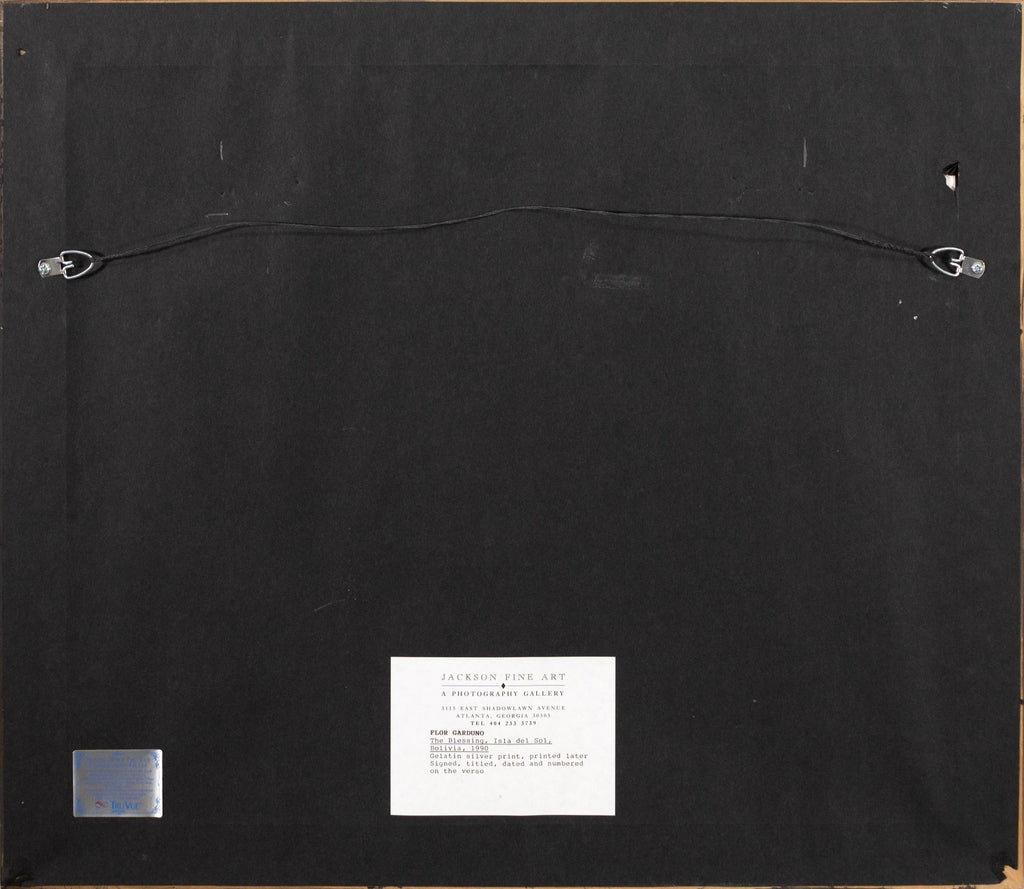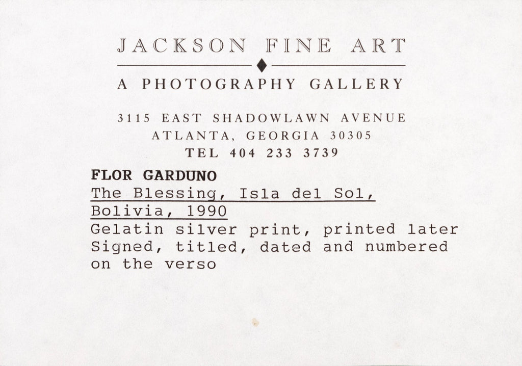 An intimate and symbolic gelatin silver print titled "The Blessing, Isla del Sol, Bolivia, 1990" by celebrated Mexican photographer Flor Garduno. Signed, titled, dated and numbered on verso. The photograph captures a pair of weathered hands delicately holding a small enamel cup cradling a single white flower. The close-up composition, set against the textured stripes of traditional Andean clothing, isolates the gesture and elevates it to a moment of quiet reverence. Taken on the Isla del Sol, Bolivia, the image reflects Garduno's signature ability to merge cultural specificity with universal themes of ritual, offering, and spiritual grace. The work radiates both tactile realism and poetic depth, hallmarks of Garduno's internationally acclaimed practice.