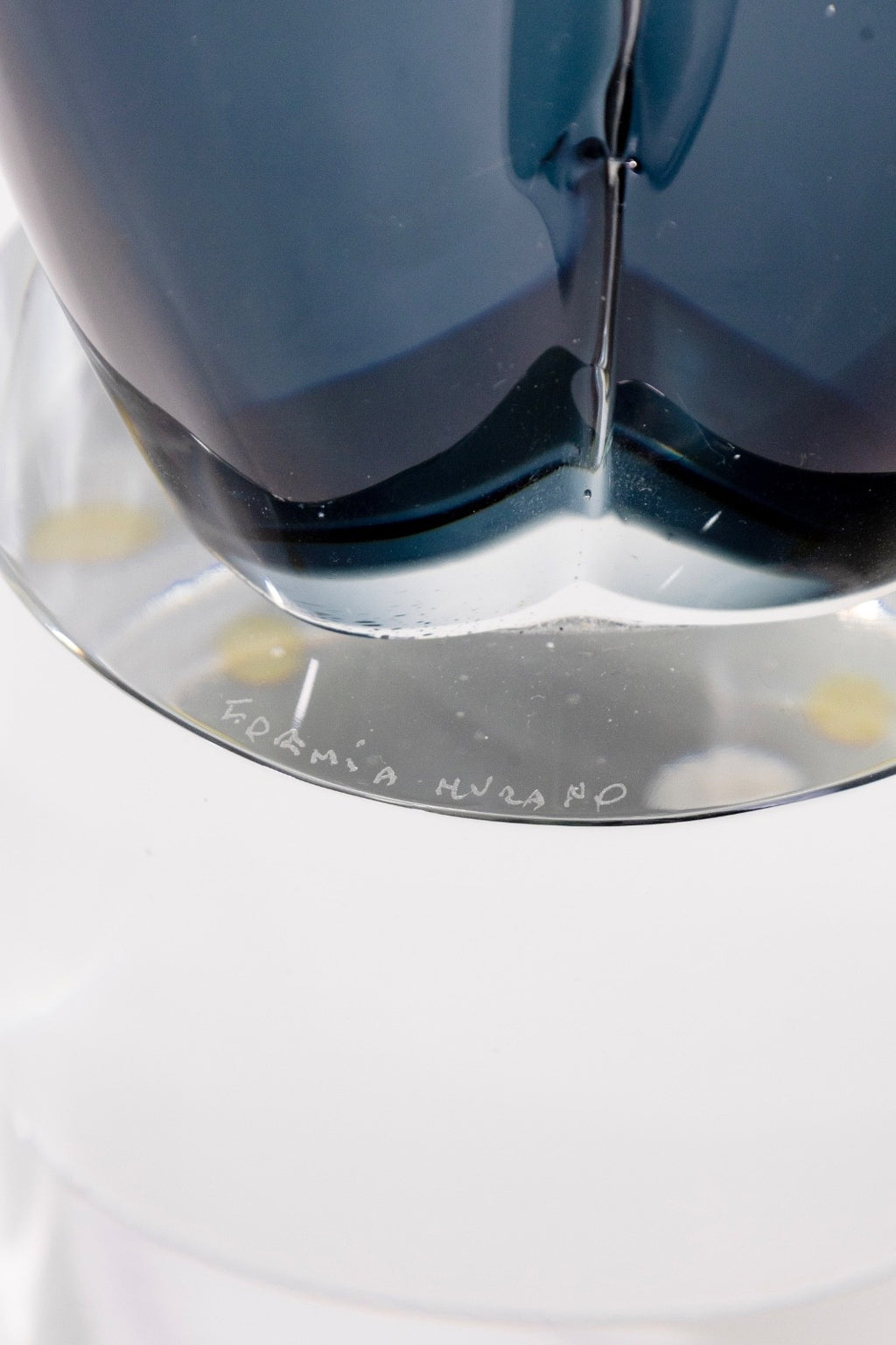 The figure’s elegant contours and smooth transitions of color showcase the technical mastery and fluid artistry synonymous with Murano glassmaking. Set atop a clear cylindrical glass base, this piece embodies both classical form and modern sensuality, highlighting the renowned craftsmanship of Formia’s Venetian studio.