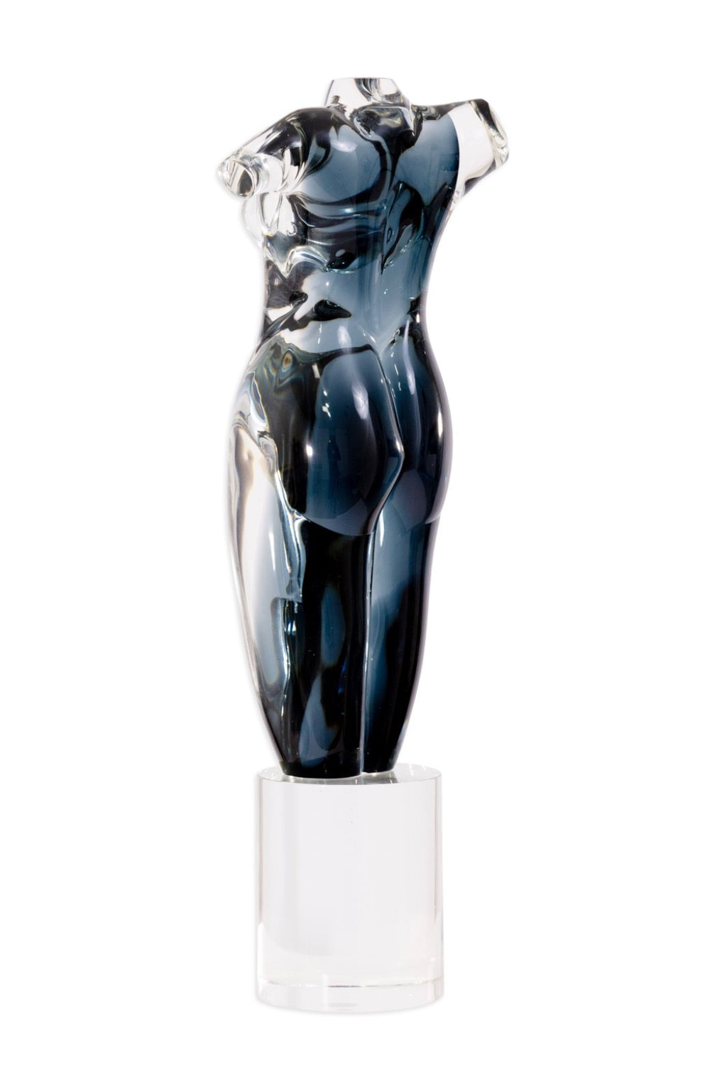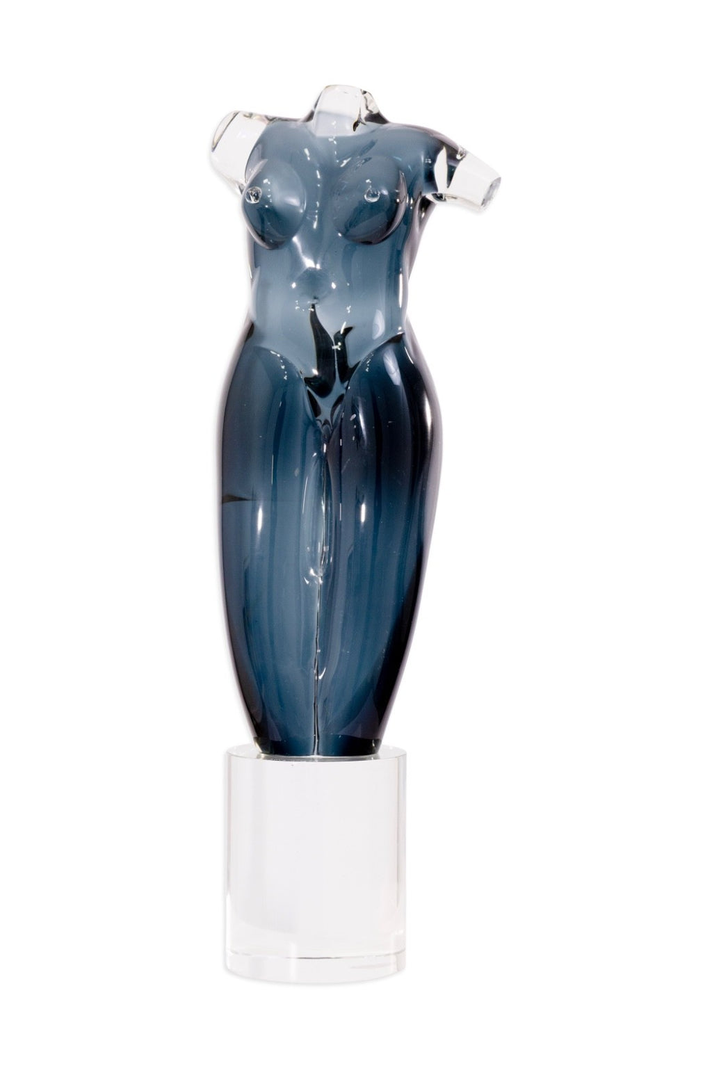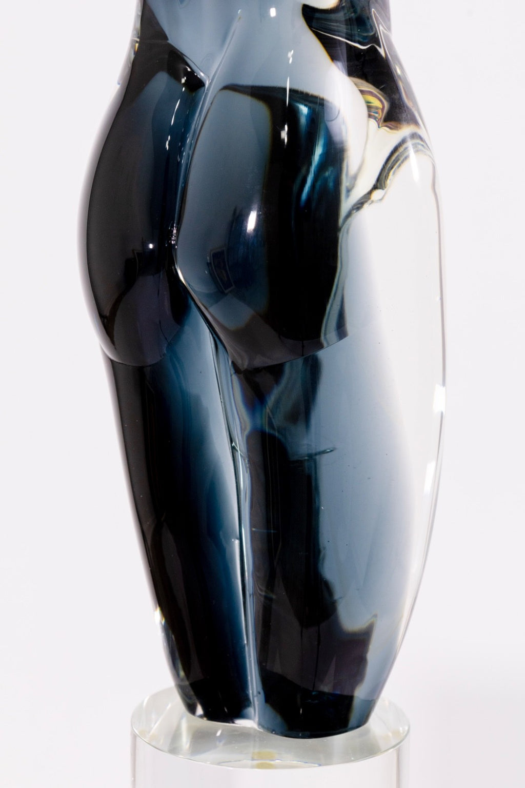 A stunning Murano glass sculpture by Formia, depicting a stylized female torso rendered in a rich smokey blue hue. Circa 1980s. Signed along the lower edge. Dimensions: 22.25"h x 4.5"w x 4.5"d. In very good condition.