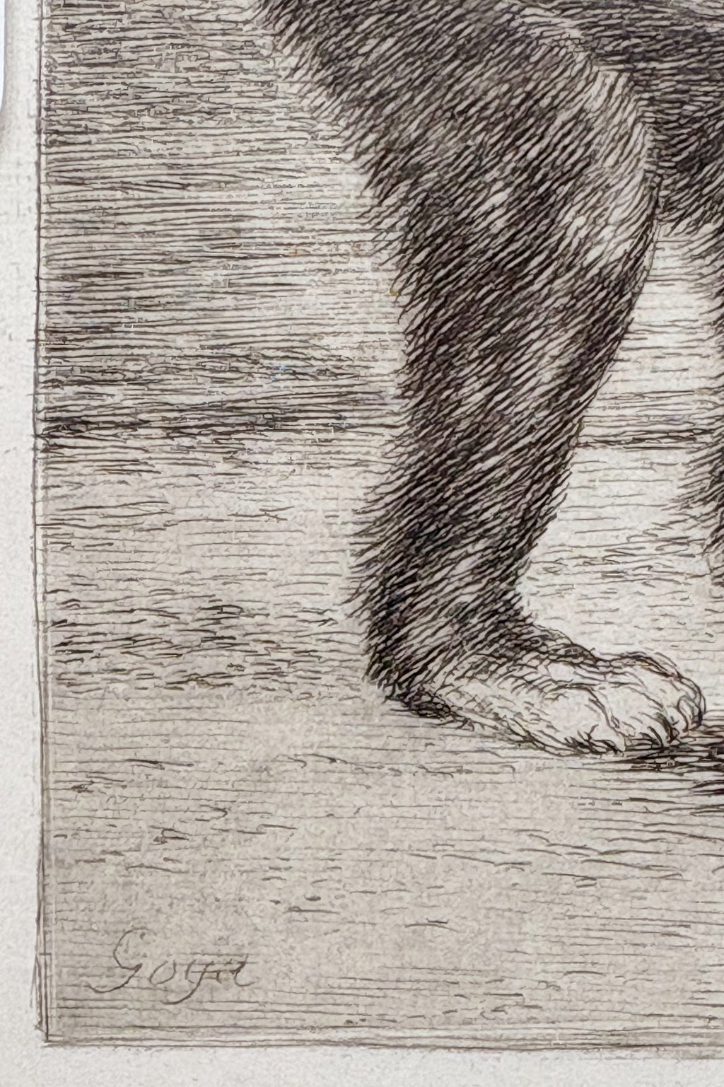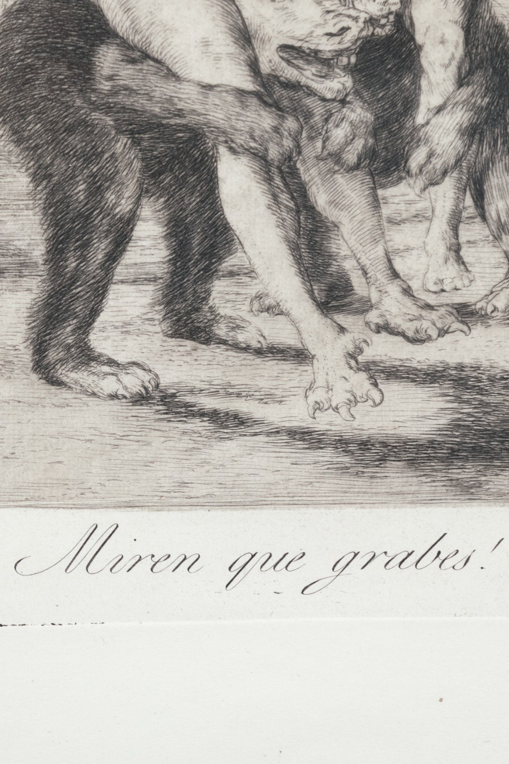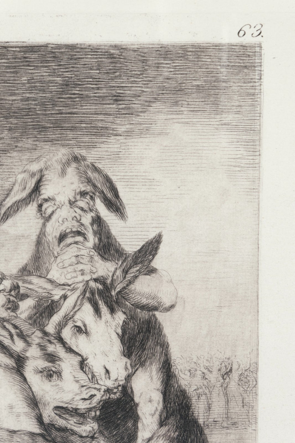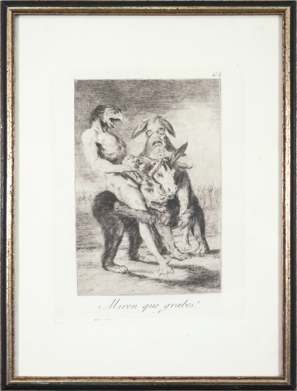 A fine impression of plate 63 from Francisco Goya's groundbreaking satirical series "Los Caprichos (The Caprices)", first published in 1799. This edition, dated 1868 on the verso label, represents the third edition of the celebrated suite. The work, titled "Miren que grabes! (Look how serious they are!)", depicts donkey-headed figures in human form - a biting satire of arrogance, authority, and the follies of societal pretensions. Through his masterful command of etching and aquatint, Goya infuses the grotesque scene with both humor and menace, underscoring his enduring critique of human vice and hypocrisy. Los Caprichos remains one of Goya's most influential works, widely studied for its innovative printmaking and fearless social commentary. Impressions from the early editions, such as this, are highly collectible and continue to resonate for their bold modernity. From a private collection. Dimensions: 13"h x 10"w x .25"d (framed). In very good condition. Full condition reports are available upon request.