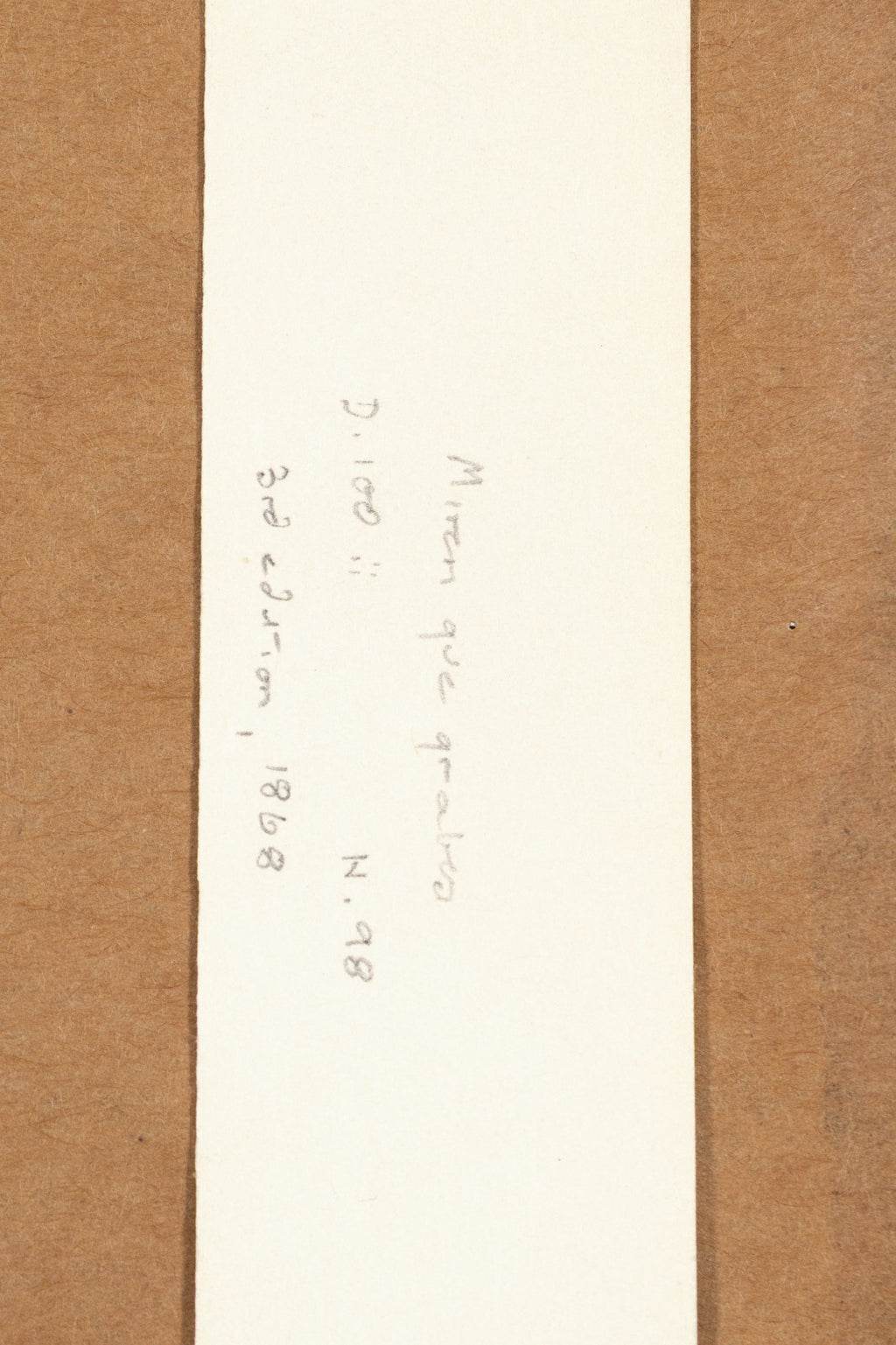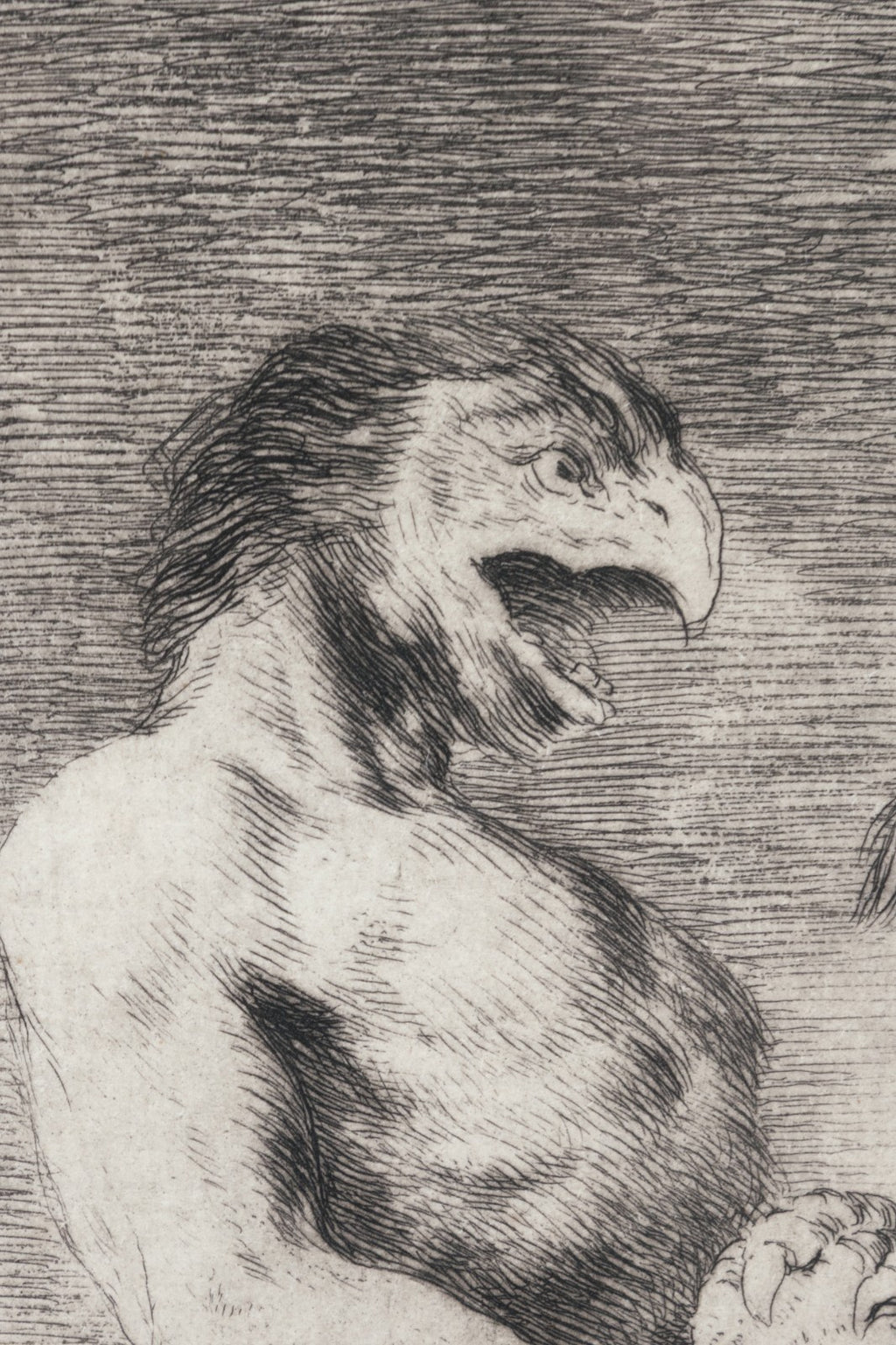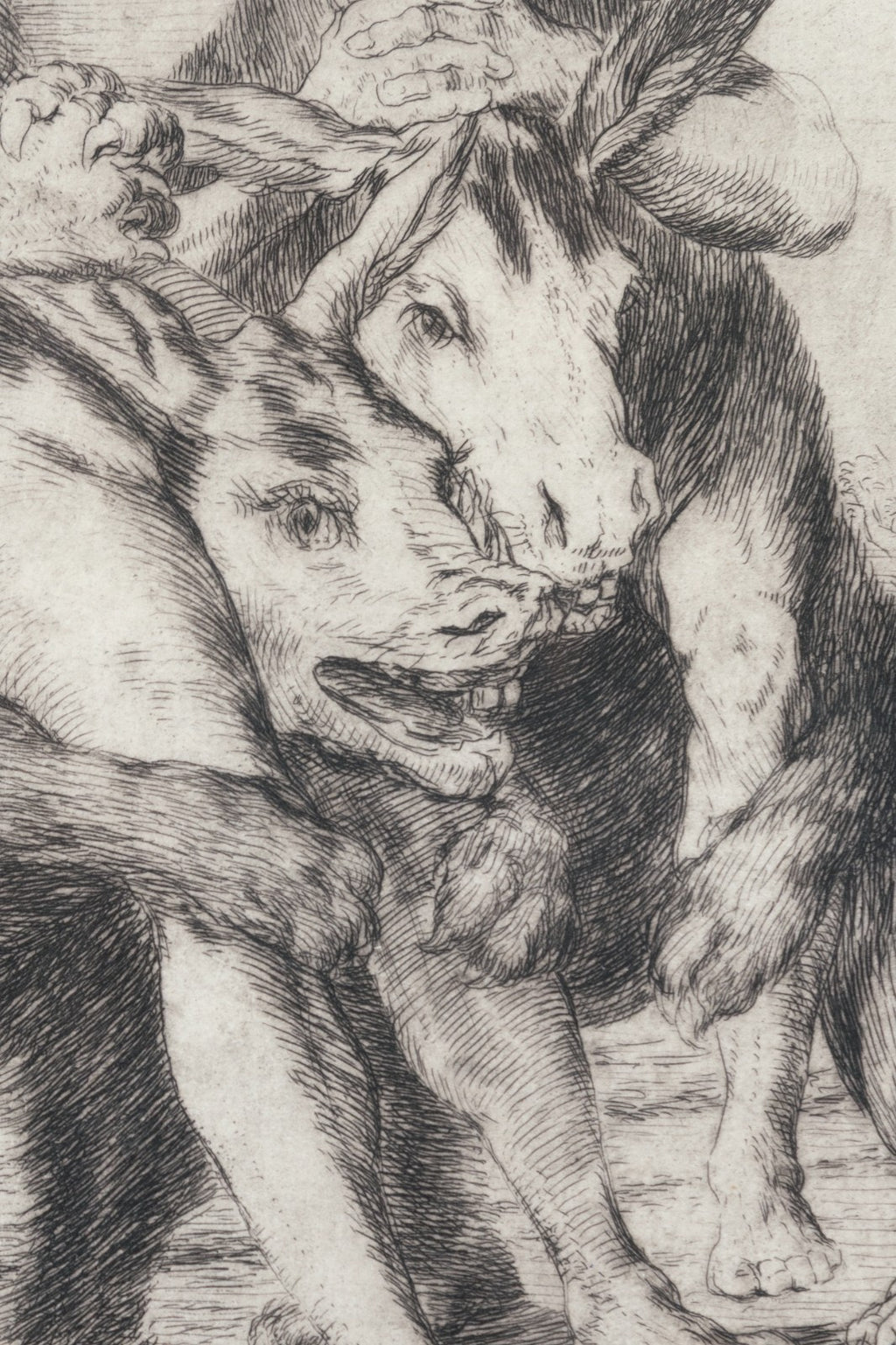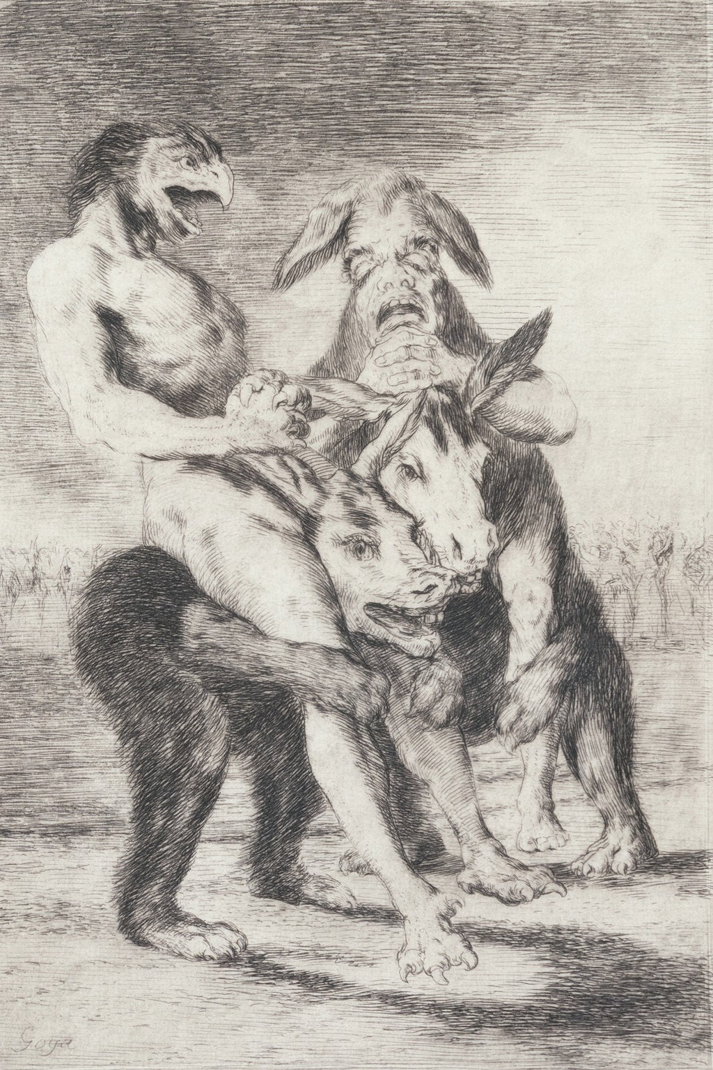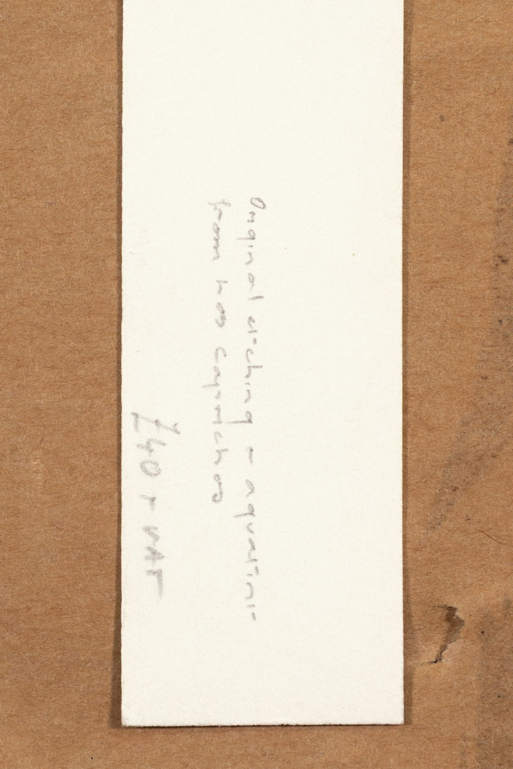 A fine impression of plate 63 from Francisco Goya's groundbreaking satirical series "Los Caprichos (The Caprices)", first published in 1799. This edition, dated 1868 on the verso label, represents the third edition of the celebrated suite. The work, titled "Miren que grabes! (Look how serious they are!)", depicts donkey-headed figures in human form - a biting satire of arrogance, authority, and the follies of societal pretensions. Through his masterful command of etching and aquatint, Goya infuses the grotesque scene with both humor and menace, underscoring his enduring critique of human vice and hypocrisy. Los Caprichos remains one of Goya's most influential works, widely studied for its innovative printmaking and fearless social commentary. Impressions from the early editions, such as this, are highly collectible and continue to resonate for their bold modernity. From a private collection. Dimensions: 13"h x 10"w x .25"d (framed). In very good condition. Full condition reports are available upon request.
