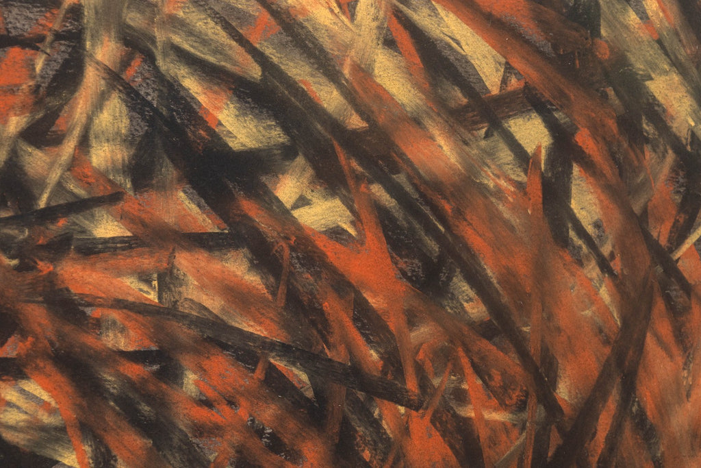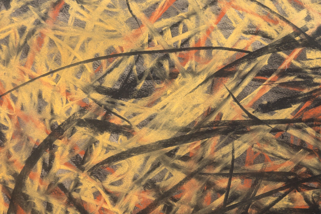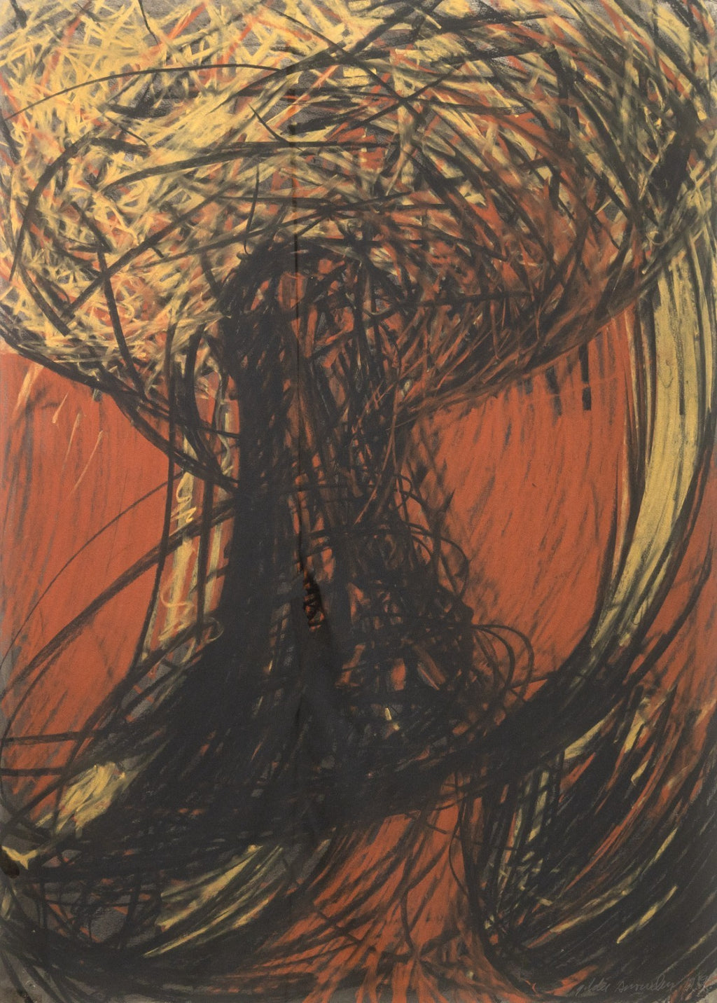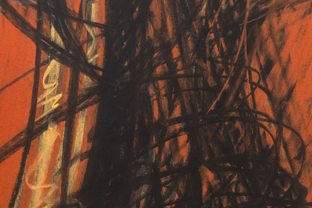 This drawing showcases Gilda Snowden's signature expressive abstraction. Executed in bold strokes of charcoal and layered with vibrant pastel, the composition swirls with kinetic energy, forming a vortex-like structure that dominates the paper. The interplay of earthy rust tones with flashes of golden yellow and deep black creates both tension and rhythm, exemplifying Snowden's ability to channel emotional intensity through gestural mark-making. This work reflects Snowden's celebrated exploration of personal narrative, memory, and cultural identity through abstraction, firmly situating her within the lineage of influential Detroit artists of the late 20th century.