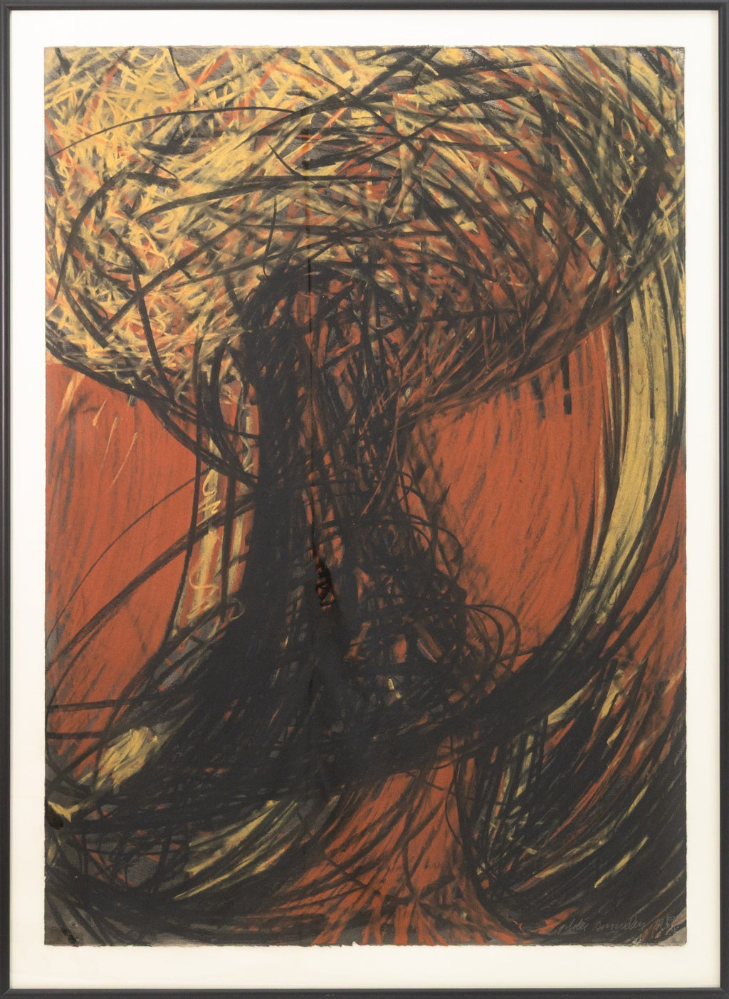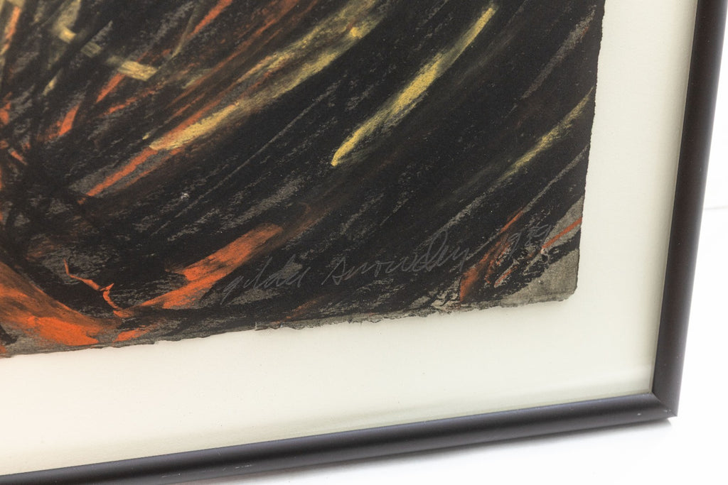 A contemporary mixed-media pastel and charcoal drawing on paper from the "Tornado Series" by Detroit artist Gilda Snowden. Hand signed on the lower right and dated 1989. From a private collection; acquired directly from the artist. Dimensions: 46.25"h x 34"w x 1.5"d (framed). In very good condition.