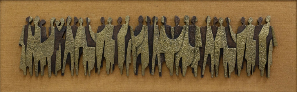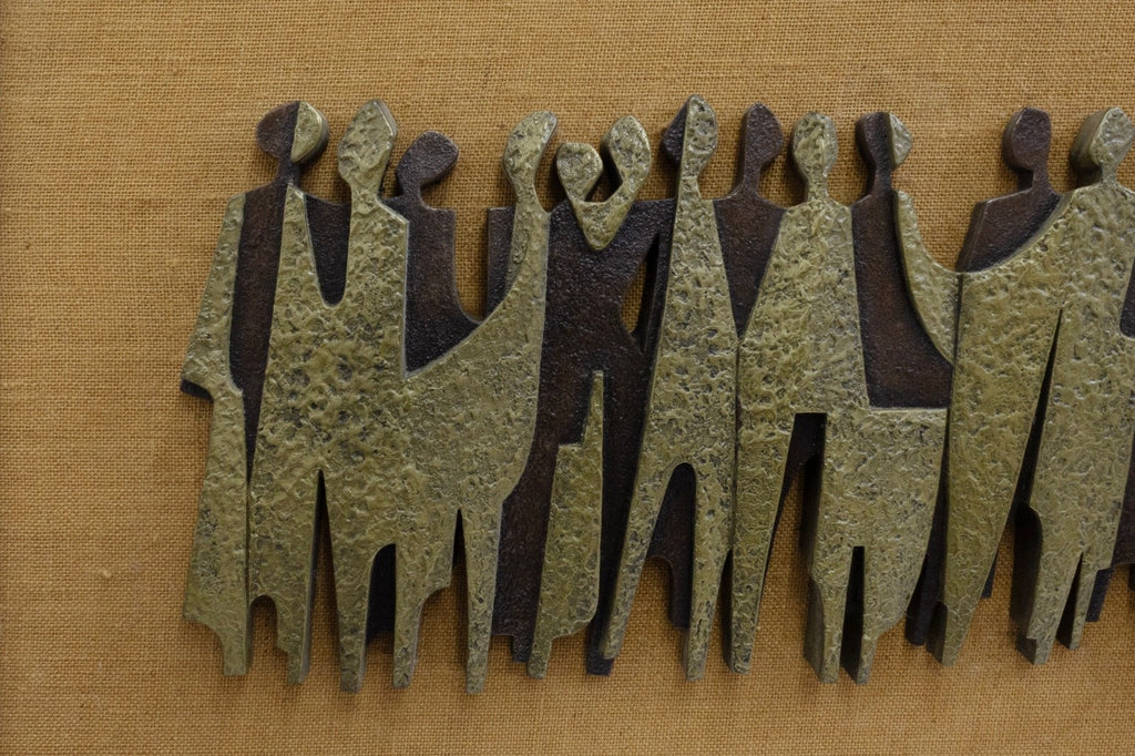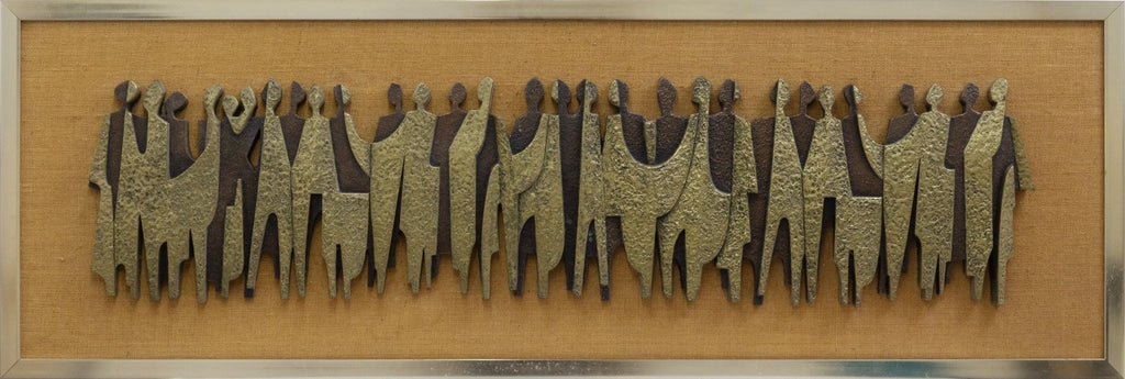 This sculptural wall relief presents a rhythmic procession of abstracted human figures, their textured forms simplified into elongated silhouettes with subtle variations of gesture and stance. The figures are arranged side by side in a continuous frieze, evoking unity, community, and collective identity. The sculpture’s Brutalist aesthetic is reinforced through the raw, tactile surfaces of the bronze, contrasting against the warm fabric backing and sleek frame. It  reflects Schoeman's ability to merge social commentary with striking modern design, making it both a visually powerful artwork and a rare collectible from his oeuvre.