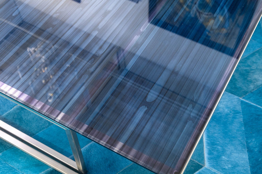 A Kubos coffee table by Glassisimo. This wonderful contemporary coffee table is a two piece nesting style table. It features two square tables, each with stainless steel frames and tempered glass table tops. The smaller table features a clear glass, while the larger table features a unique blue/purple teardrop like design throughout the glass. This simple and geometric pair of tables is a perfect touch for a contemporary space needing a pop of color. Both tables are in very good condition. The larger table measures 15 inches tall, and 43.25 x 43.25 inches wide, while the smaller table measures 12 inches tall, and 41.25 x 41.25 inches wide.