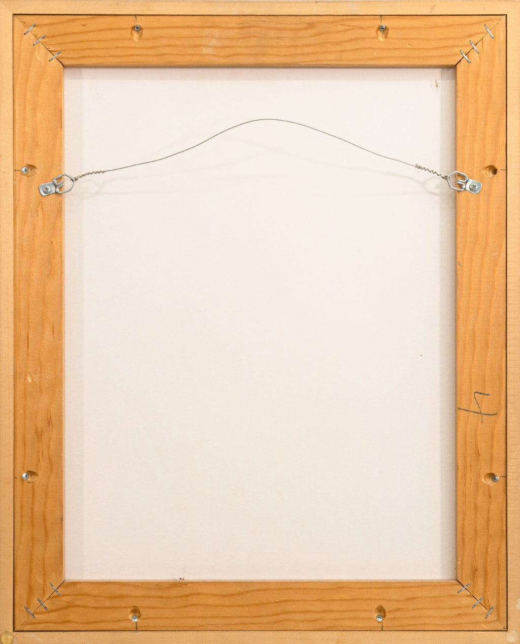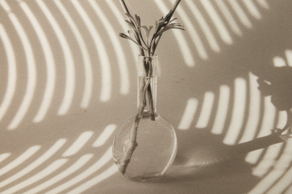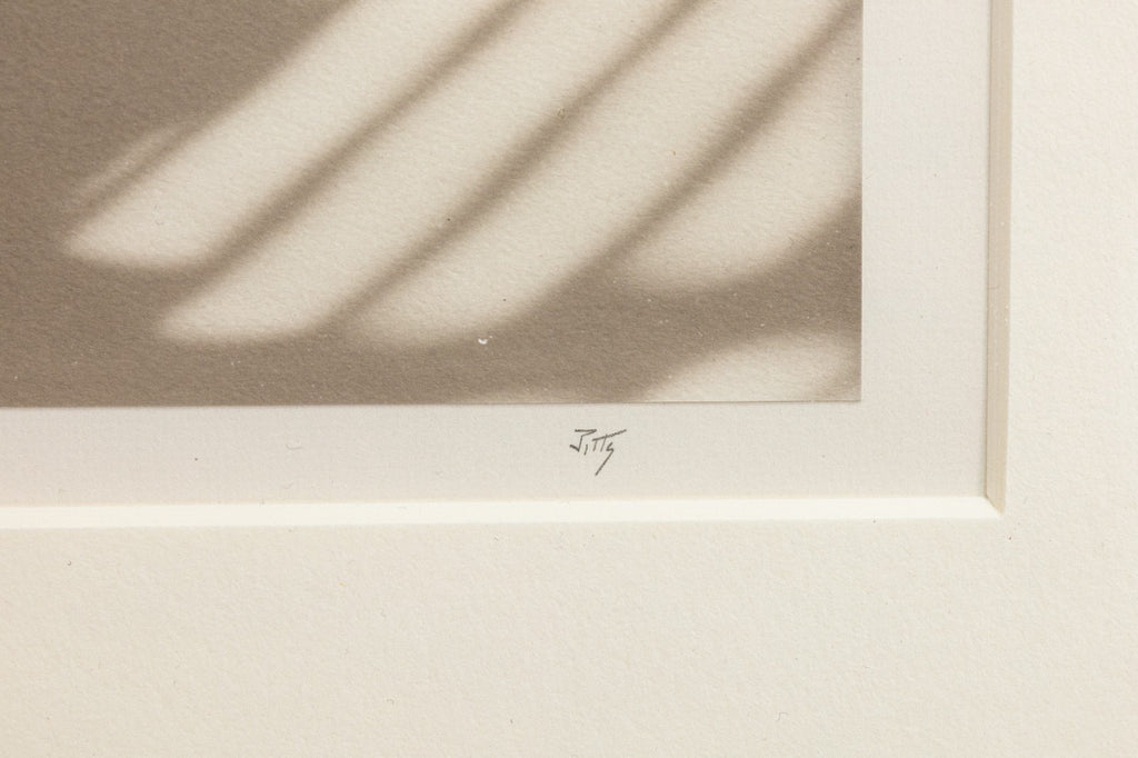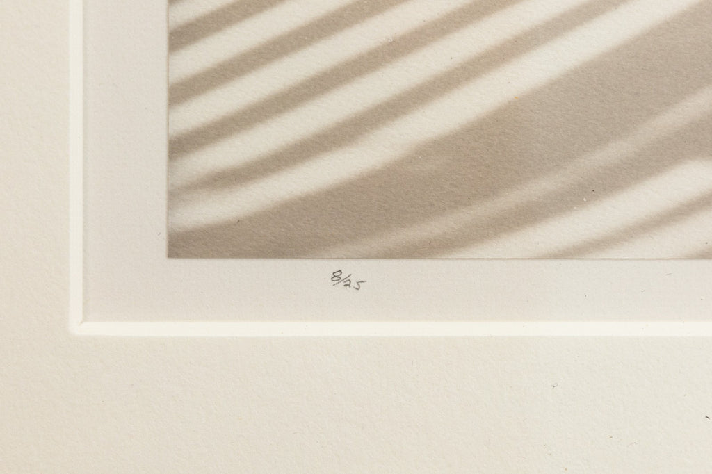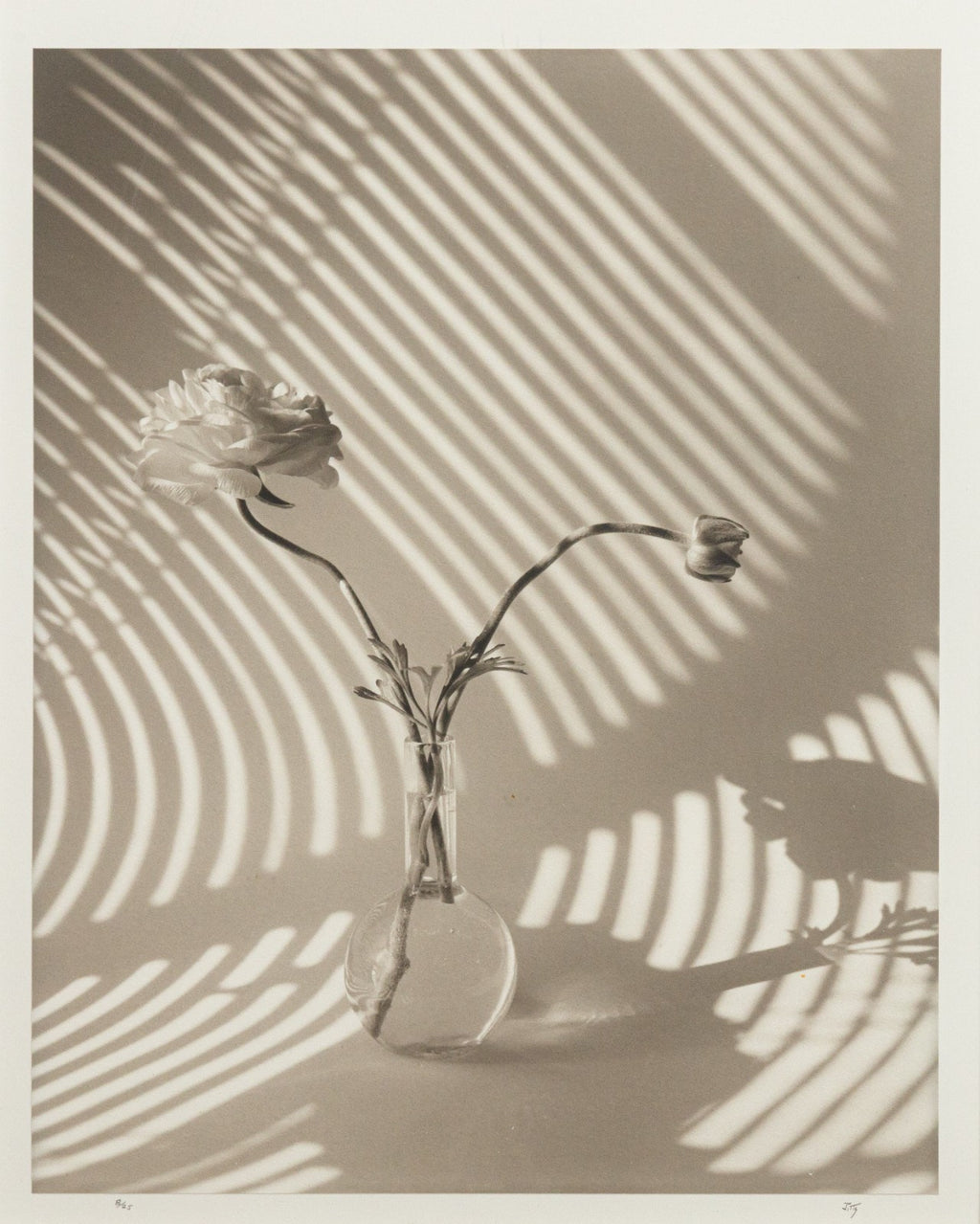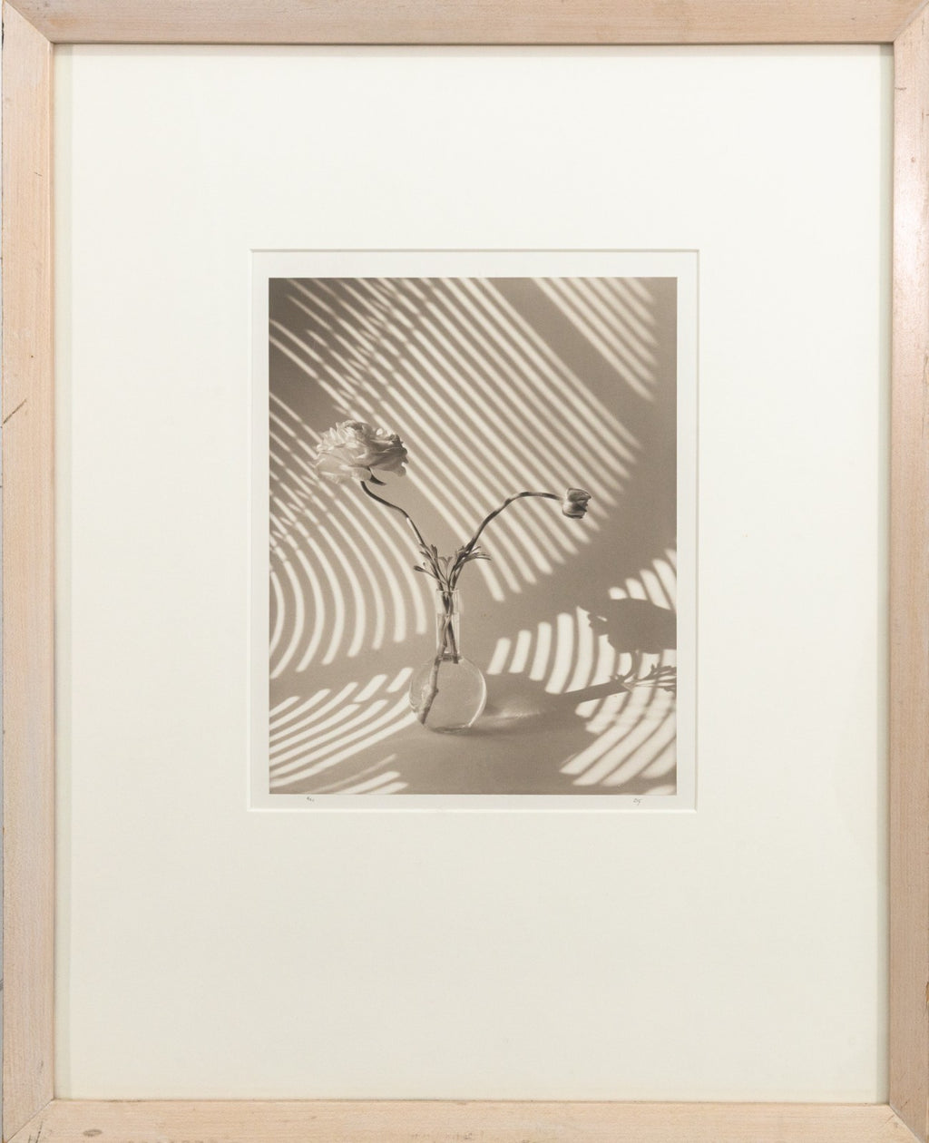 A contemporary palladium print titled "Two Ranunculus On Curved, Striped Background" by American photographer James Ware Pitts. Hand signed in pencil on the lower right with an annotation of 8/25 on the lower left. Published in 1994. This elegant still life showcases two ranunculus stems in a round glass vase, dramatically illuminated by sweeping curved bands of shadow and light. Executed with the refined tonal depth of the palladium process, the work achieves a timeless, sculptural quality that emphasizes the interplay between natural delicacy and abstract geometry. A striking example of Pitts' mastery of photographic composition. From a private collection. Dimensions: 21.25"h x 17.25"w x 1.5"d (framed). In very good condition. Full condition reports are available upon request.