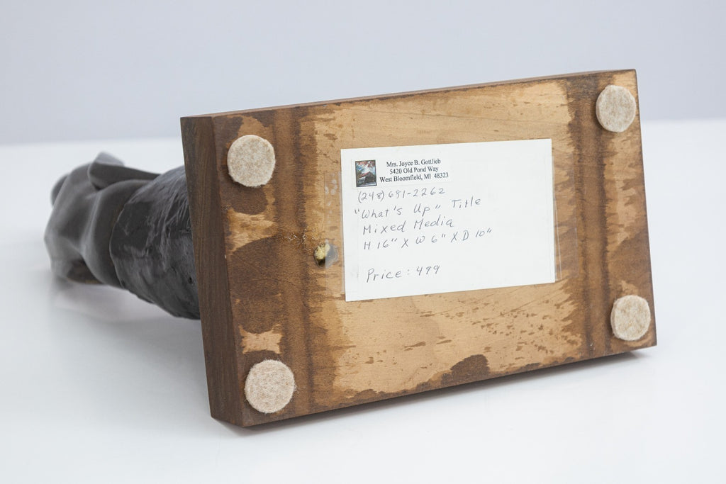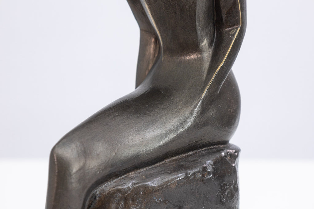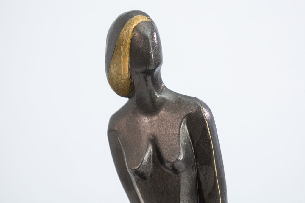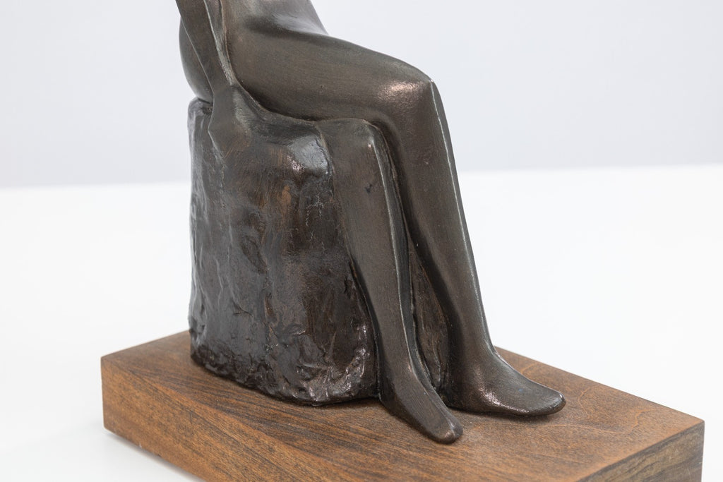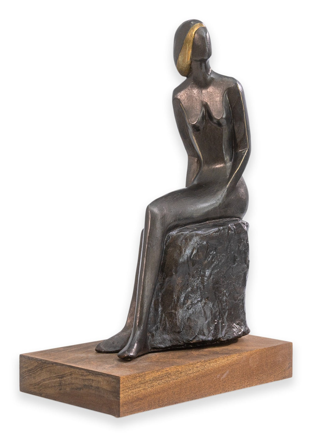 A contemporary mixed media resin sculpture by Joyce Gottlieb, Untitled (Seated Lady), circa 1990, portrays a stylized female figure poised gracefully atop a textured block. The elongated form and simplified contours highlight the artist’s modernist approach to the human figure, while the bronze-like finish with a gold accent on the hair adds depth and refinement. Resting on a wooden base, the work embodies both serenity and sophistication, exemplifying Gottlieb’s ability to merge abstraction with timeless figuration. Direct from the artist's collection. Dimensions: 15"h x 10"w x 6"d. In very good condition.