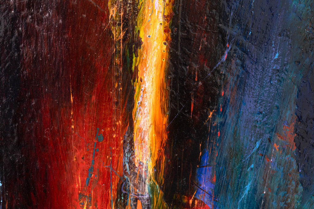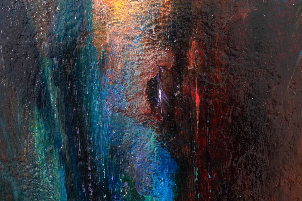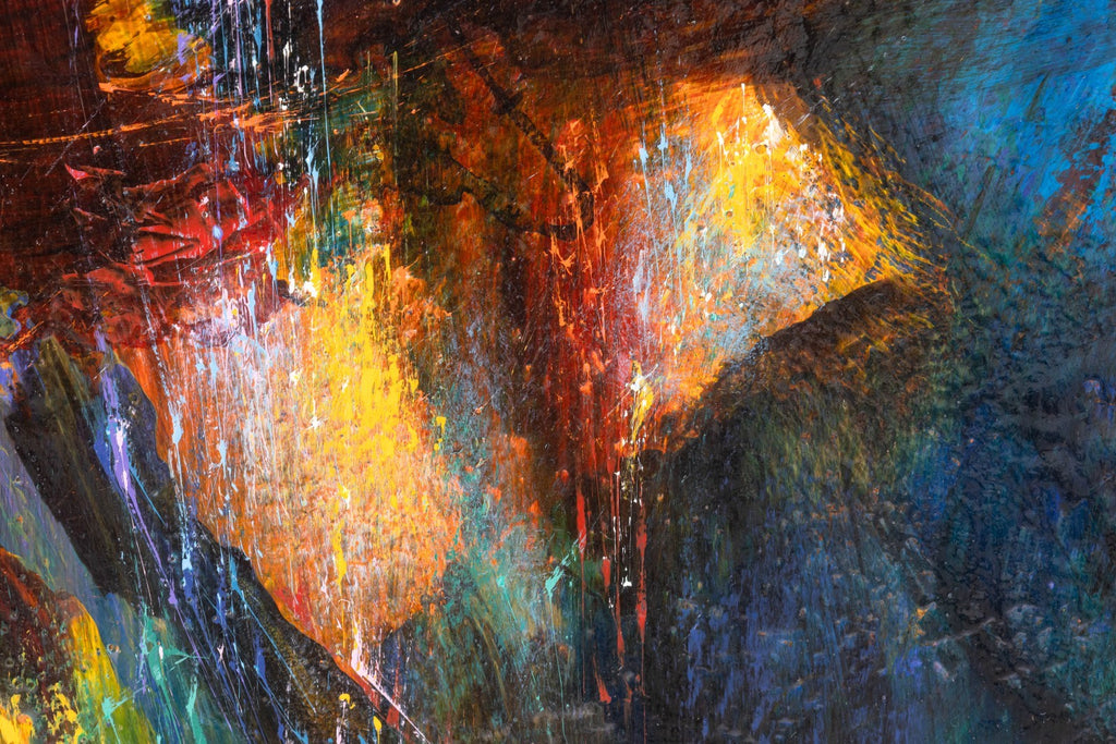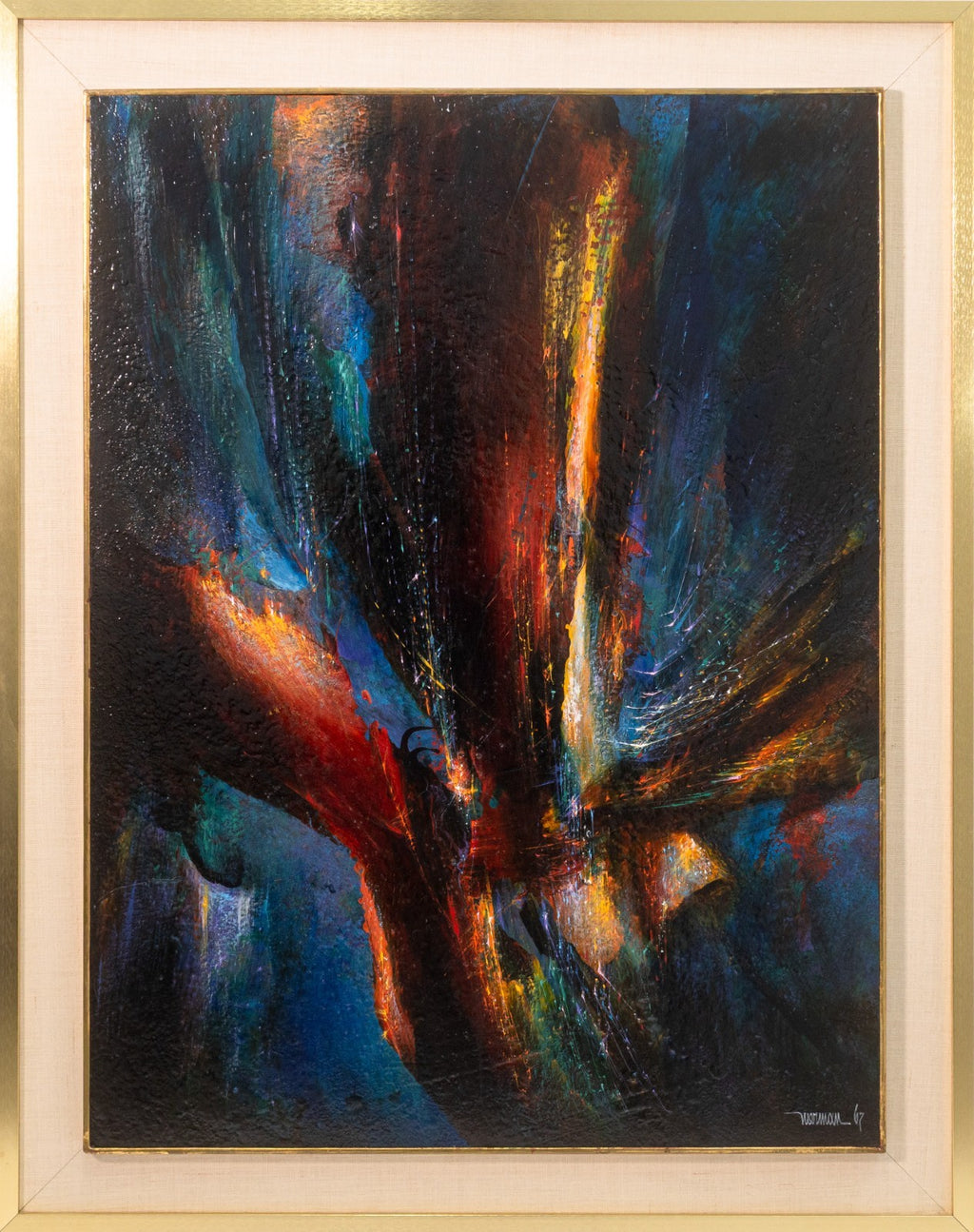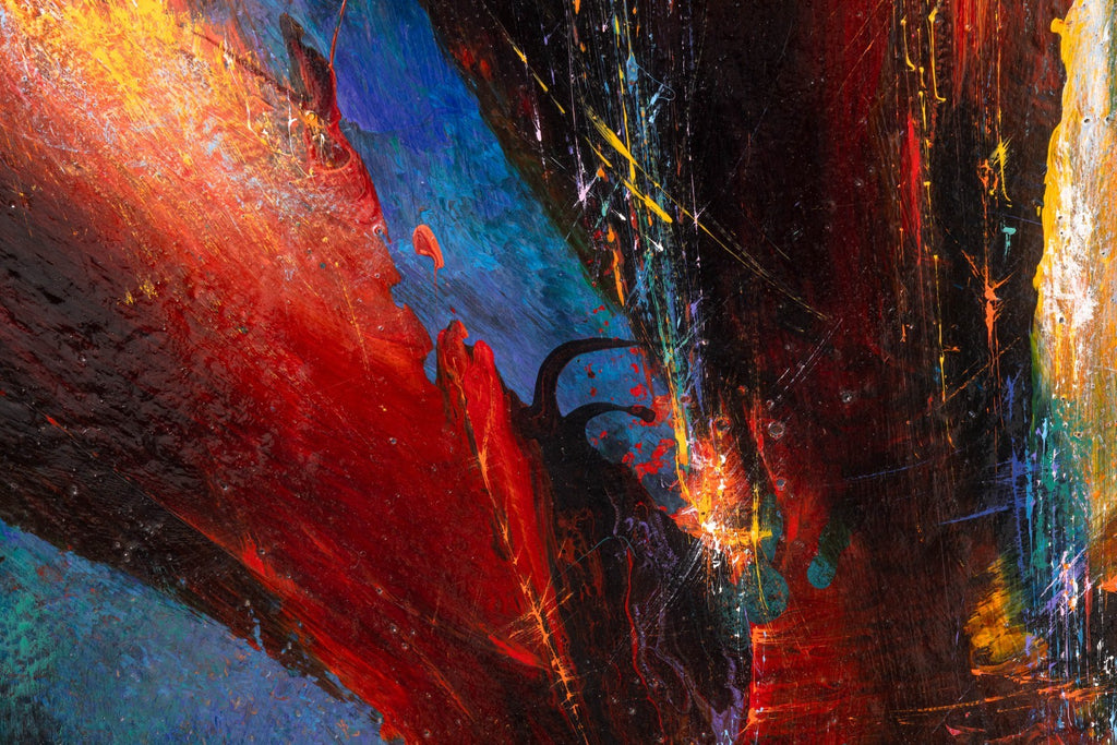 This composition embodies the artist’s celebrated exploration of cosmic energy, light, and movement. Painted in acrylic on board, the work features radiant bursts of red, gold, and blue emerging from a dark, atmospheric ground, creating a sense of dynamic motion and depth. The textured surface enhances the impression of luminous energy, evoking both musical rhythm and elemental forces.