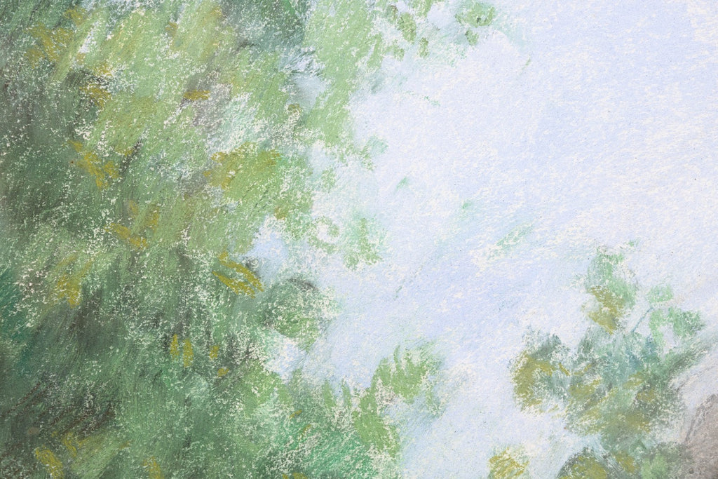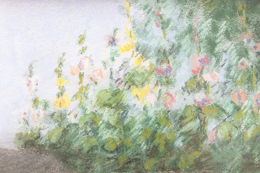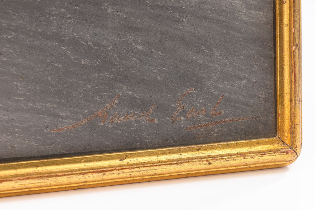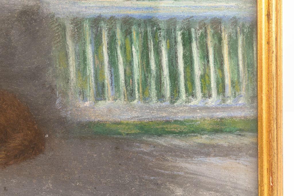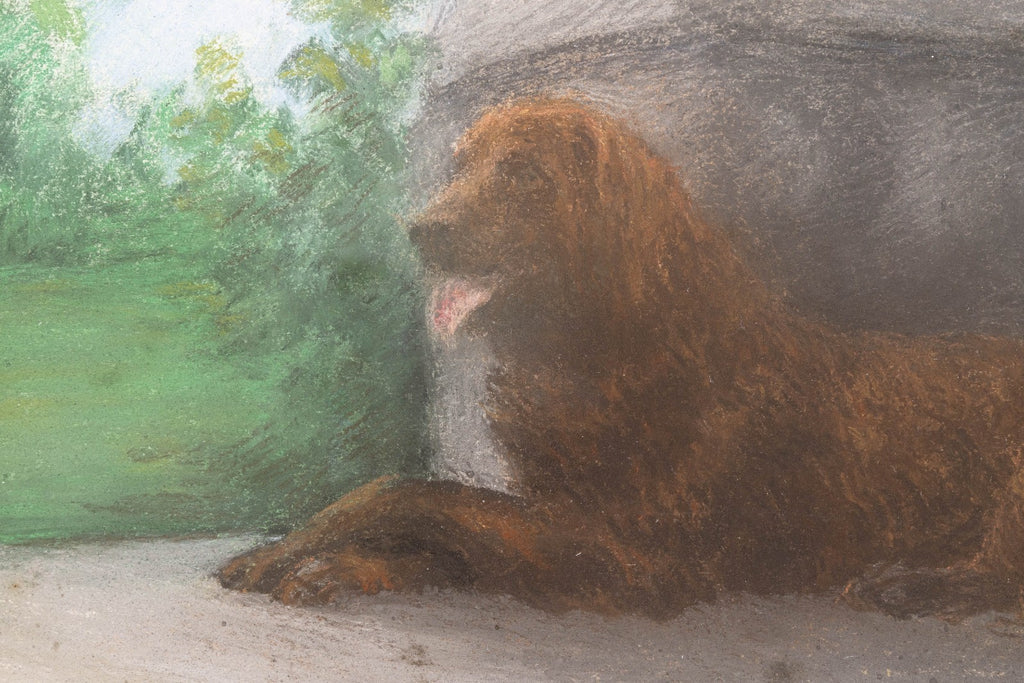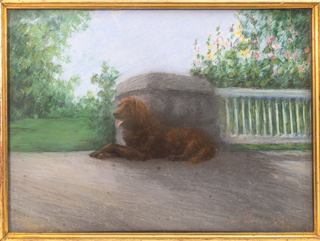 This illustration by captures a reclining dog resting in a sunlit outdoor setting. The composition balances naturalism and atmosphere, with the dog rendered in warm brown tones against a soft backdrop of garden greenery, flowering plants, and architectural stone and railing details. Earl’s sensitive handling of pastel highlights her ability to convey both texture and temperament, bringing vitality and presence to the animal subject. A fine example of Earl’s legacy as one of the foremost animal artists of her generation.