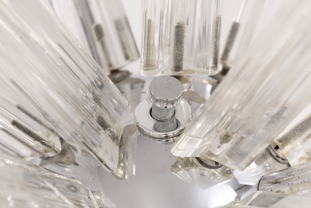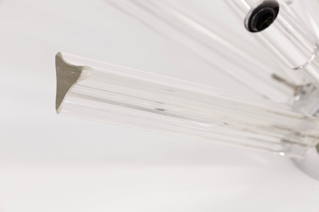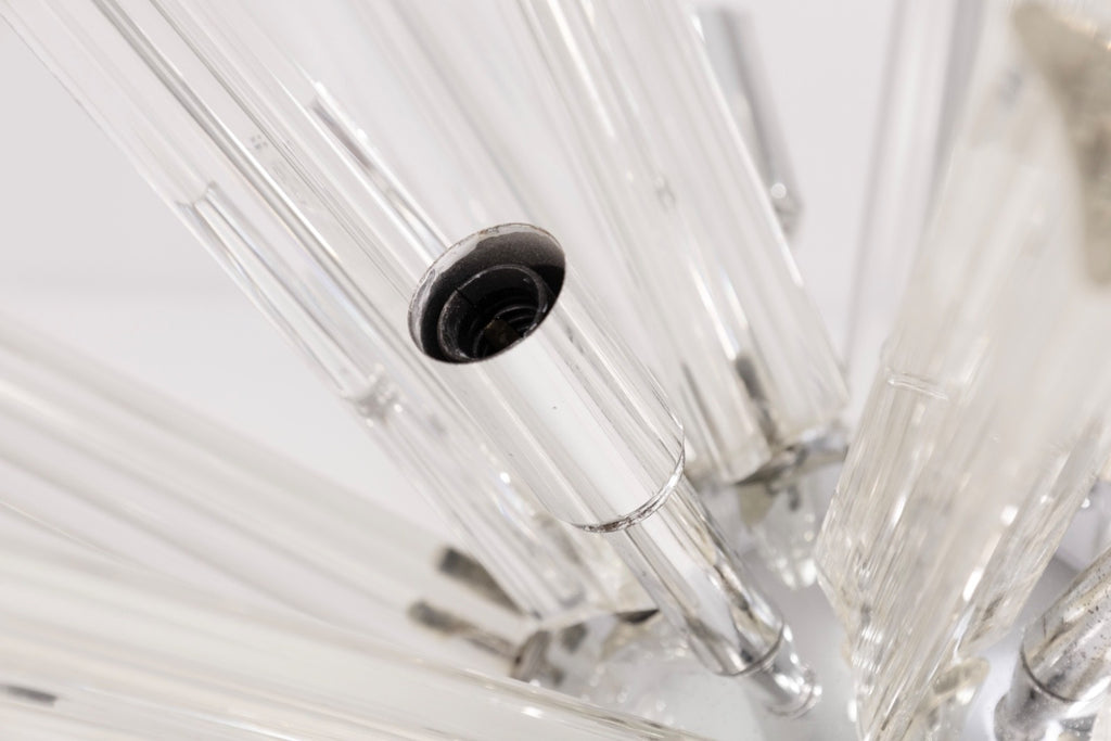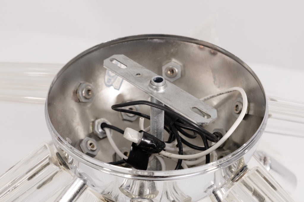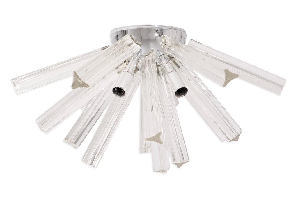 This striking Mid Century Modernist ceiling light features an array of hand-blown Murano glass rods radiating from a polished chrome base. Each glass element is crafted with precision, showcasing the clarity and artistry characteristic of Murano glassmaking. The sculptural form evokes a dynamic, starburst effect, blending elegance with modernist flair. A stunning statement piece that adds sophistication and visual interest to any interior space. The chandelier is in good condition and measures at 10.75 inches in height and has a diameter of 20.5 inches.