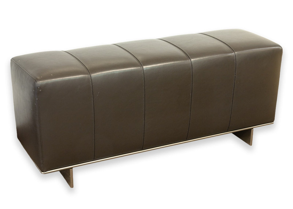 A Minotti Freeman designed by Rodolfo Dordoni. This lovely little accent bench features a simple, modern design. It is upholstered with Nappa Visione Extra leather and supported by a brushed metal frame. The Minotti tagging can be seen engraved into the underside of the frame. It also features bracketing which allows it to be attached to other Freeman seating systems. This bench is in good overall condition. It measures 19 inches tall, 44 inches long, and 14 inches wide.