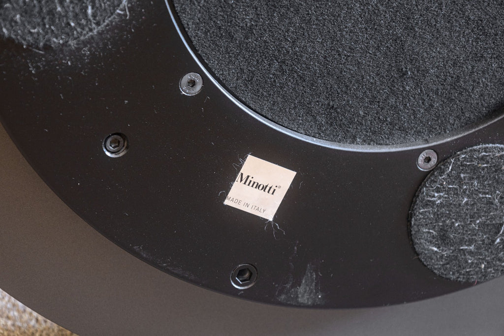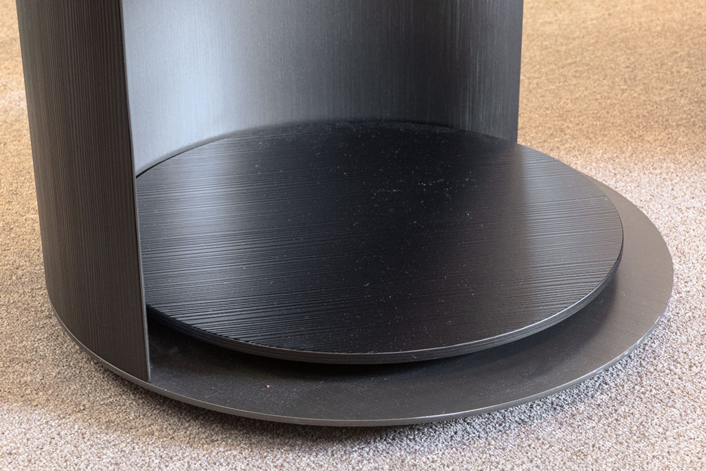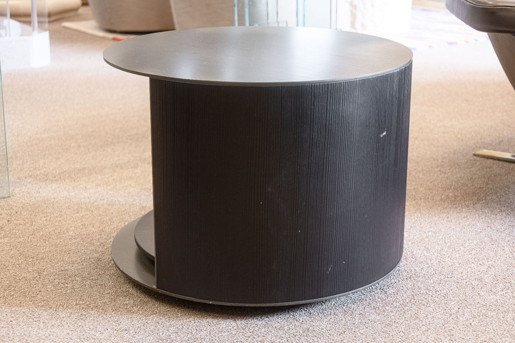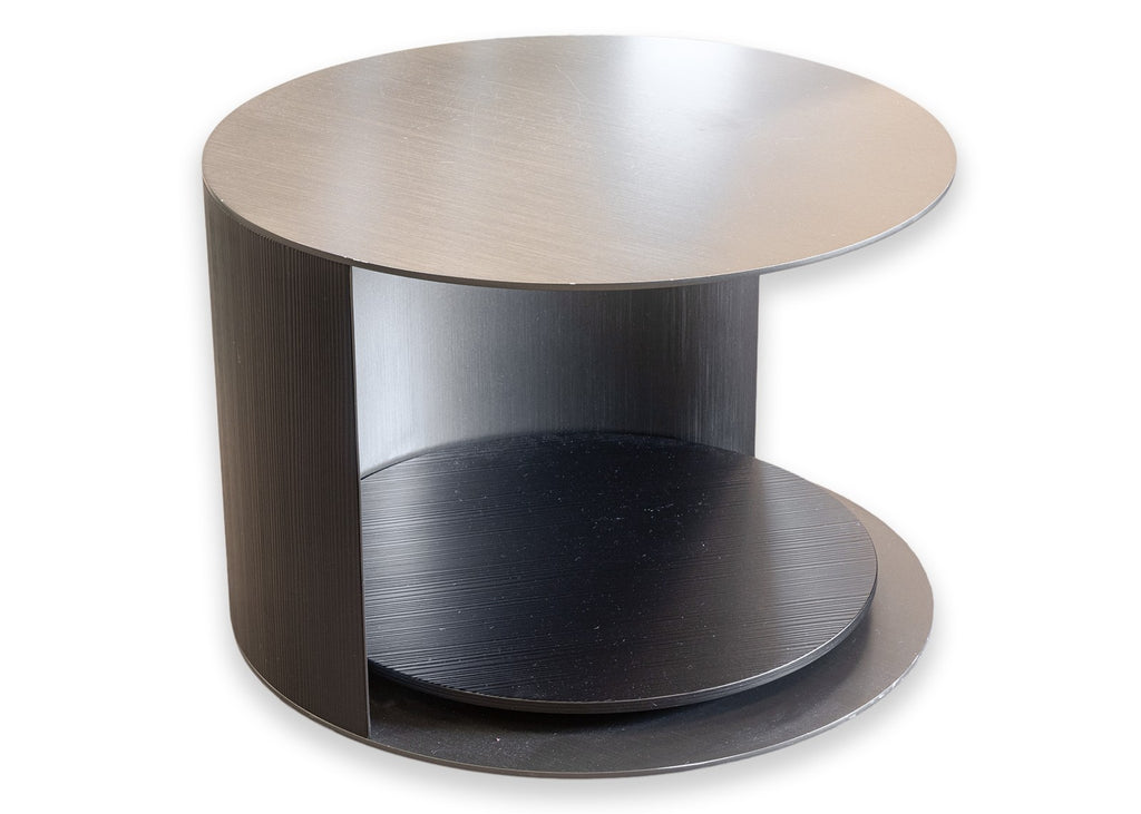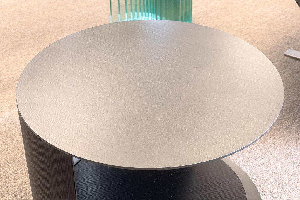 A Minotti Richer side end table by Rodolfo Dordoni. This table features a minimal contemporary modern design. It features a two tier design, constructed with a mix of satin finished aluminum and brushed larch wood. The lower secondary tier includes a unique wood face platform which rotates in a lazy suzan fashion for display and ease access. This table can be used as a side end table, or even as a small coffee table. It is in very good condition. It measures 17.25 inches tall, and has a 23.5 inch diameter.