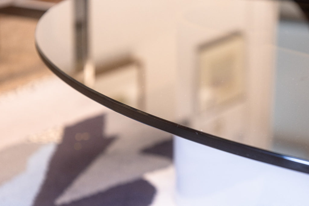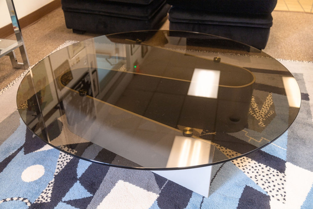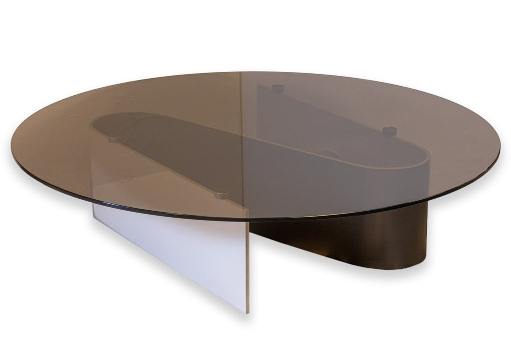 A Minotti x Rodolfo Dordoni Bender coffee table. This Italian coffee table has a chic modern design. The frame is a satin finished piece of steel, sculpted into a waving form. The top of the frame rests a large round smoked glass tabletop. This coffee table is in very good condition. It measures 11 inches tall, and has a diameter of 47.25 inches wide.