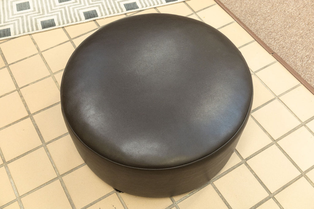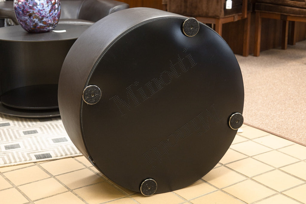 A Minotti Davis ottoman by Rodolfo Dordoni. The Davis ottoman is a lovely little contemporary footstool/ottoman featuring a circular shape with minimal stitching. It is upholstered in a very soft, high quality dark brown leather, and sits on four round flat chrome feet. The Minotti name can be seen dimpled into the underside. It is in good overall condition, but has some scuffing to the exterior. It measures 13 inches tall, and has a diameter of 27 inches.