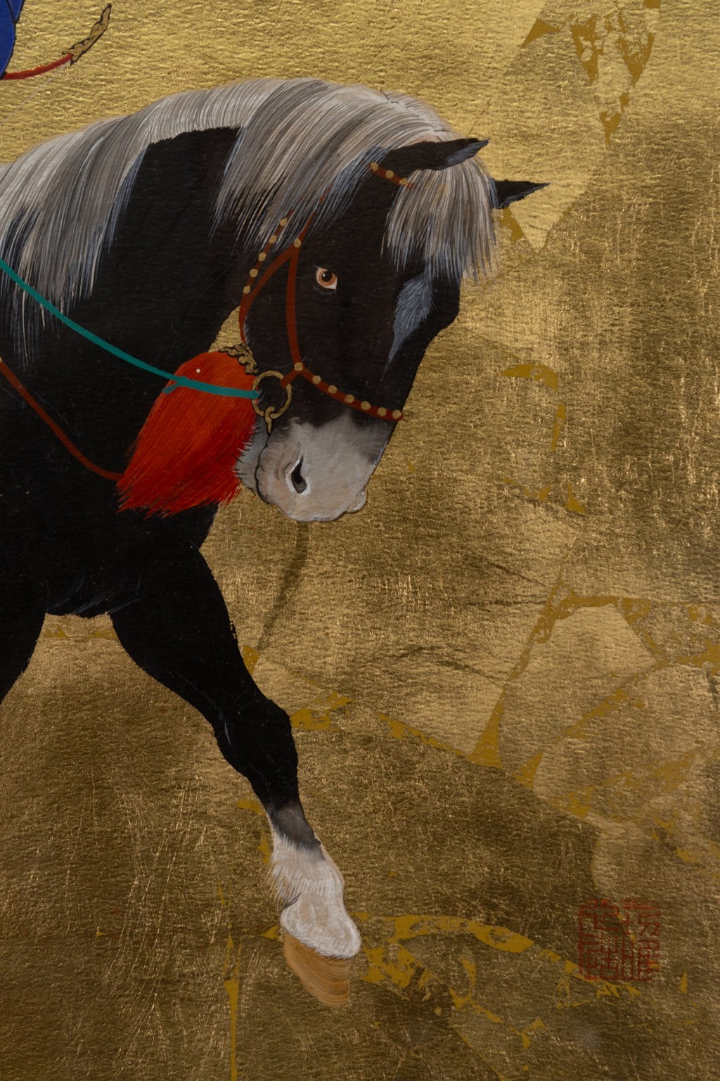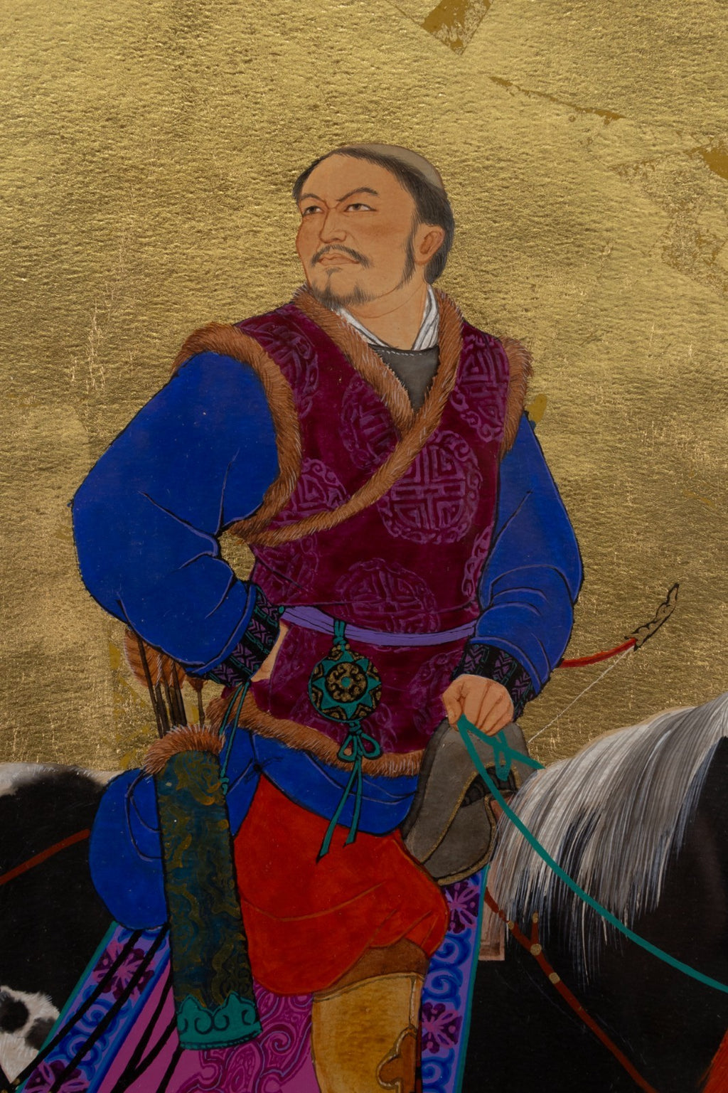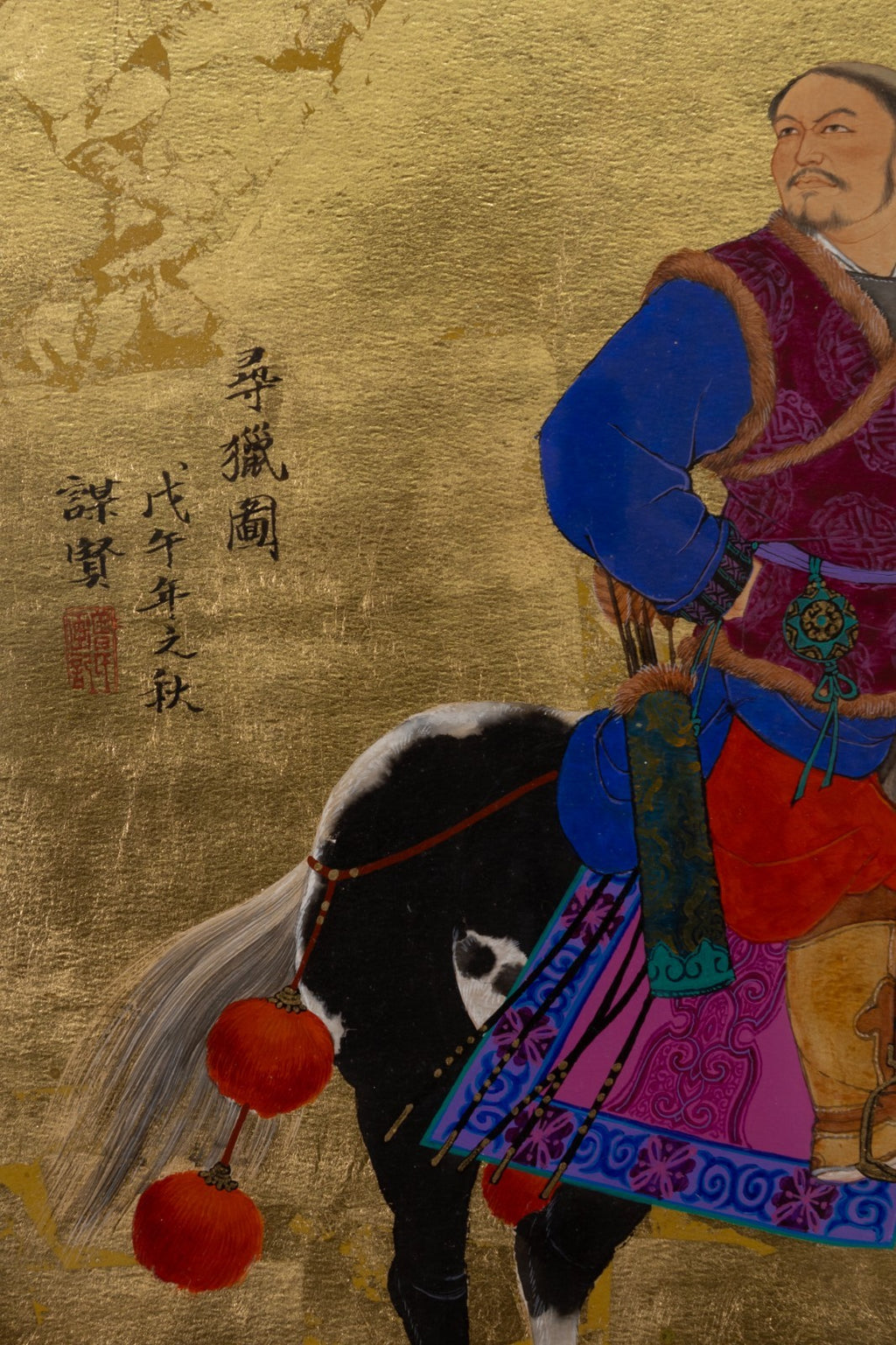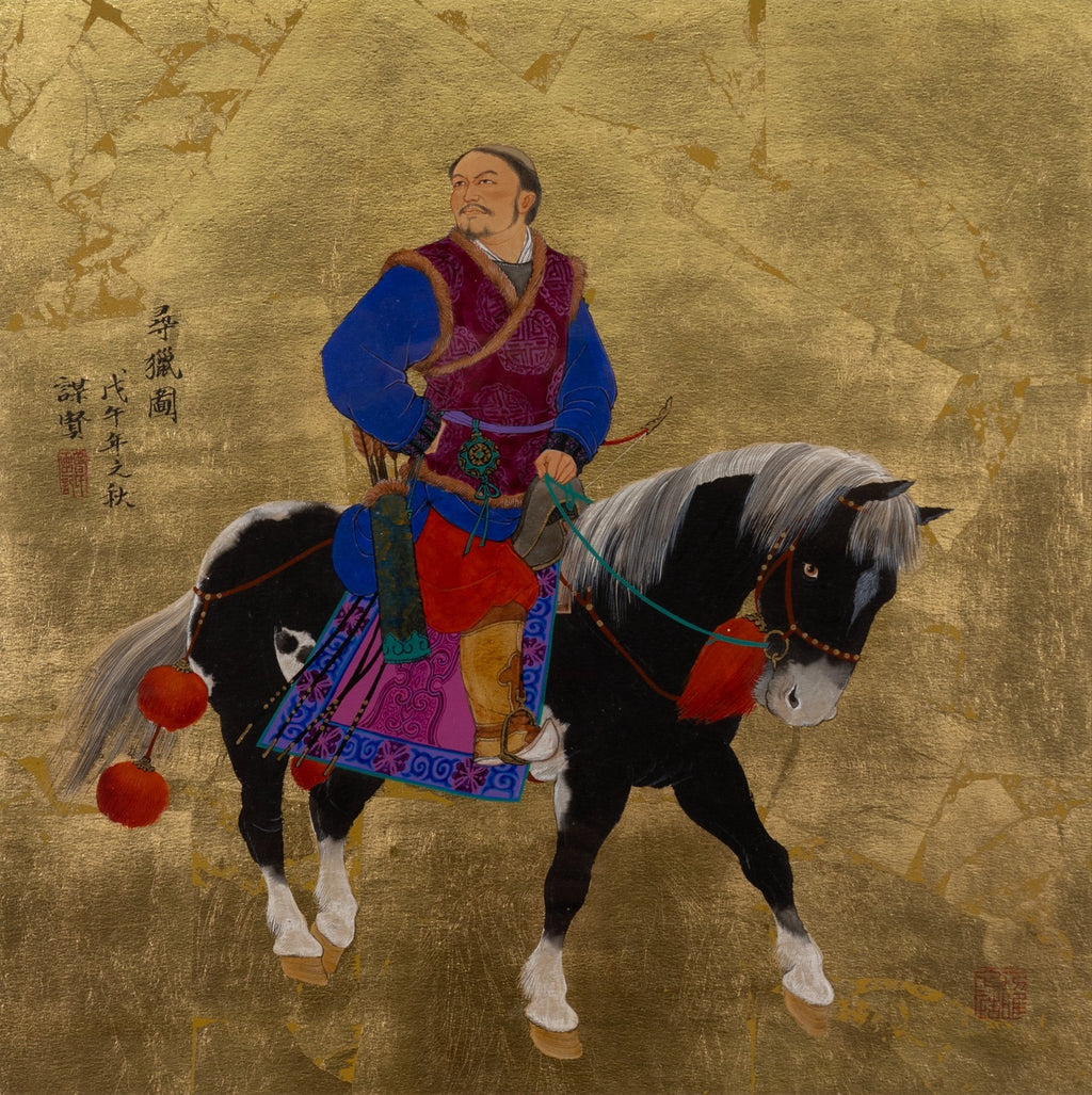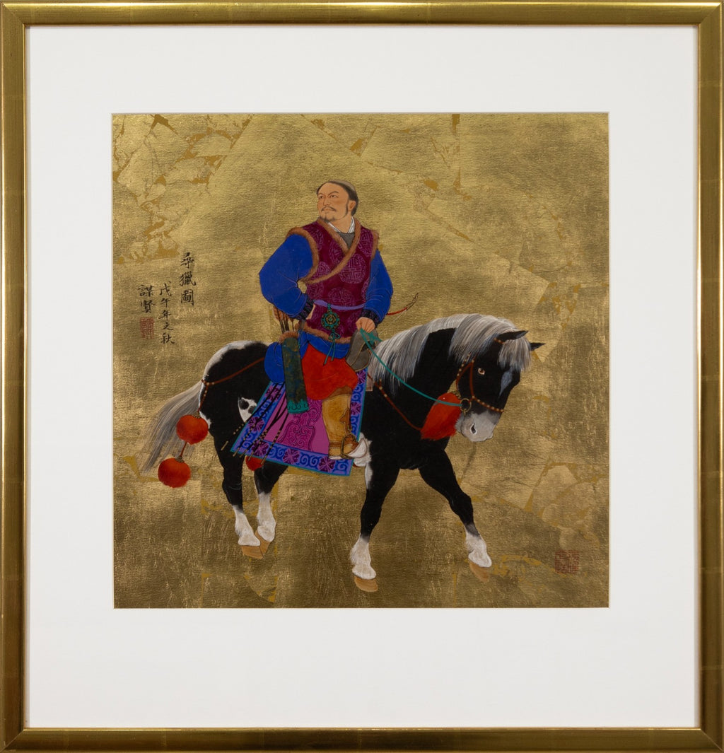 A dynamic oil and gold leaf titled "Looking for Something to Hunt" by contemporary Chinese artist Mou-sien Tseng. Titled, dated 1978, and signed on verso. A serene yet purposeful hunting scene, rendered with meticulous detail and traditional refinement. Against a shimmering gold leaf background, a mounted rider clad in rich garments guides his horse while drawing a bow, accompanied by an attendant leading a second elaborately adorned horse. At their side, a hunting dog stands alert, adding to the narrative of anticipation. The vibrant textiles, intricate tack, and lifelike expressions contrast beautifully with the luminous golden ground, emphasizing both elegance and cultural heritage. This work exemplifies Tseng's acclaimed fusion of classical Chinese storytelling with contemporary artistry. From a private collection. Dimensions: 23"h x 22"w x 1.5"d. In very good condition. Full condition reports are available upon request.