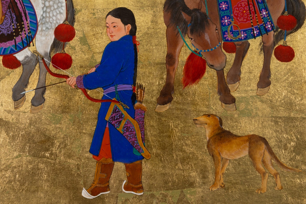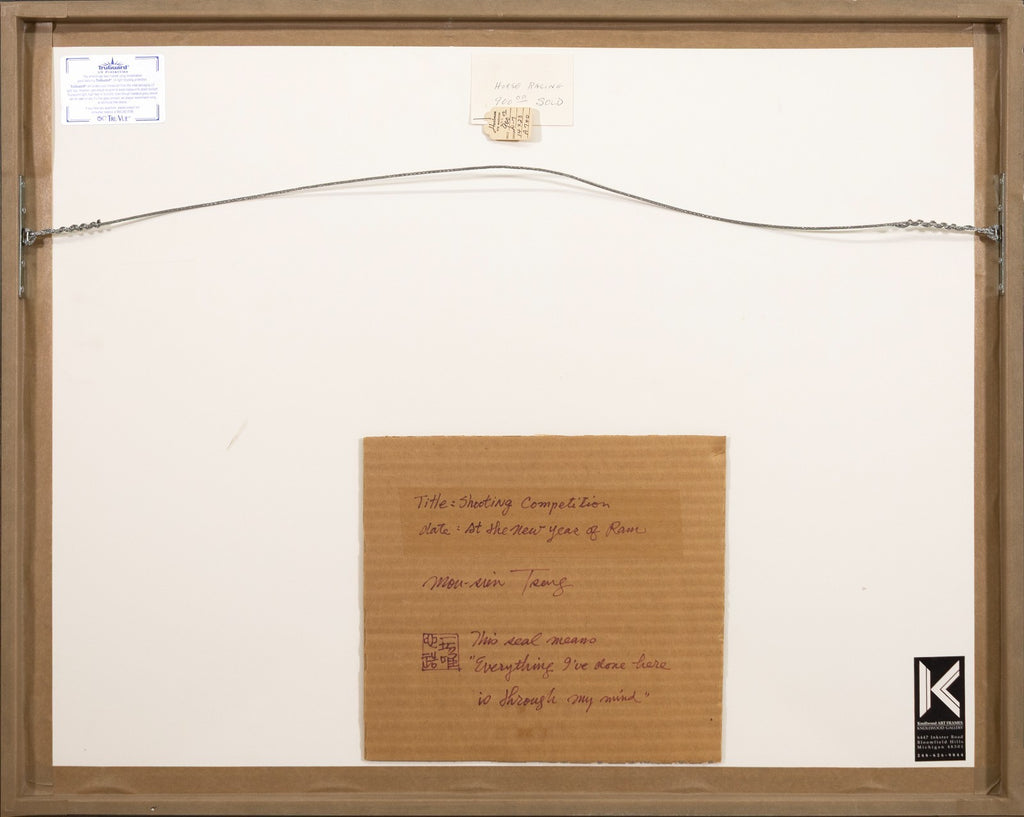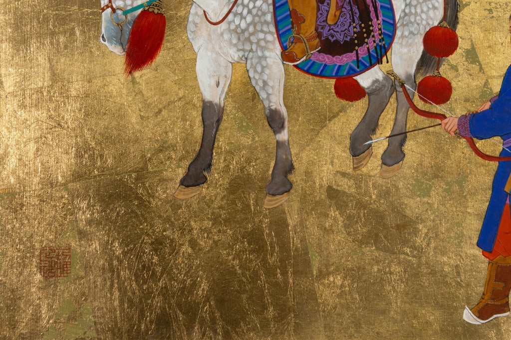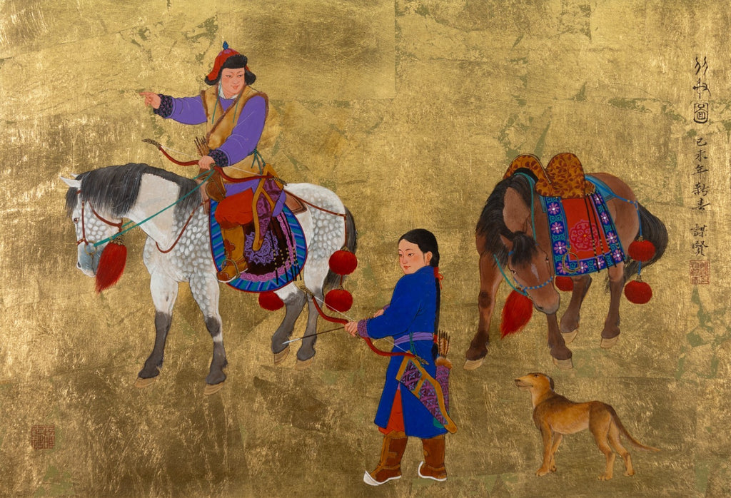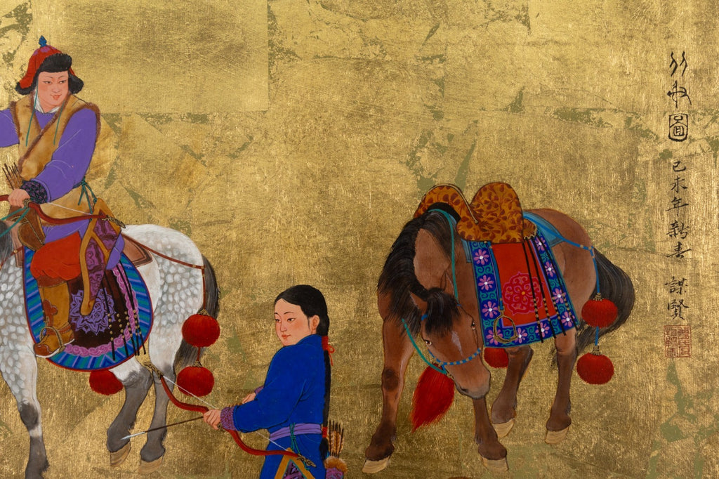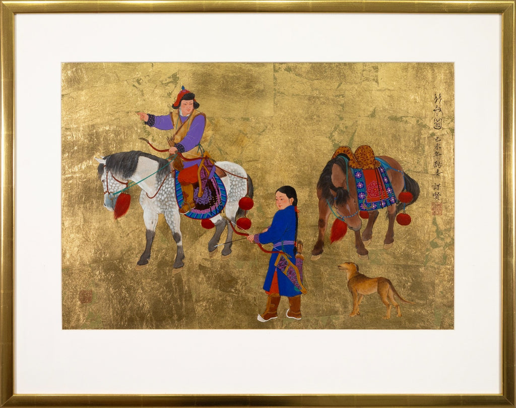 A dynamic oil and gold leaf titled "Shooting Competition" by contemporary Chinese artist Mou-sien Tseng. Titled, dated 1979, and signed on verso. A mounted archer, dressed in ornate garments, prepares his bow while a young attendant leads a second richly adorned horse, accompanied by a dog. The figures and animals are meticulously rendered, their colorful attire and tack set against a resplendent background of gold leaf that enhances the sense of pageantry and timelessness. This work exemplifies Tseng's celebrated ability to blend classical Chinese themes and techniques with modern artistic vision, resulting in a composition that is both historically evocative and strikingly contemporary. From a private collection. Dimensions: 23.25"h x 29"w x 1.5"d. In very good condition. Full condition reports are available upon request.