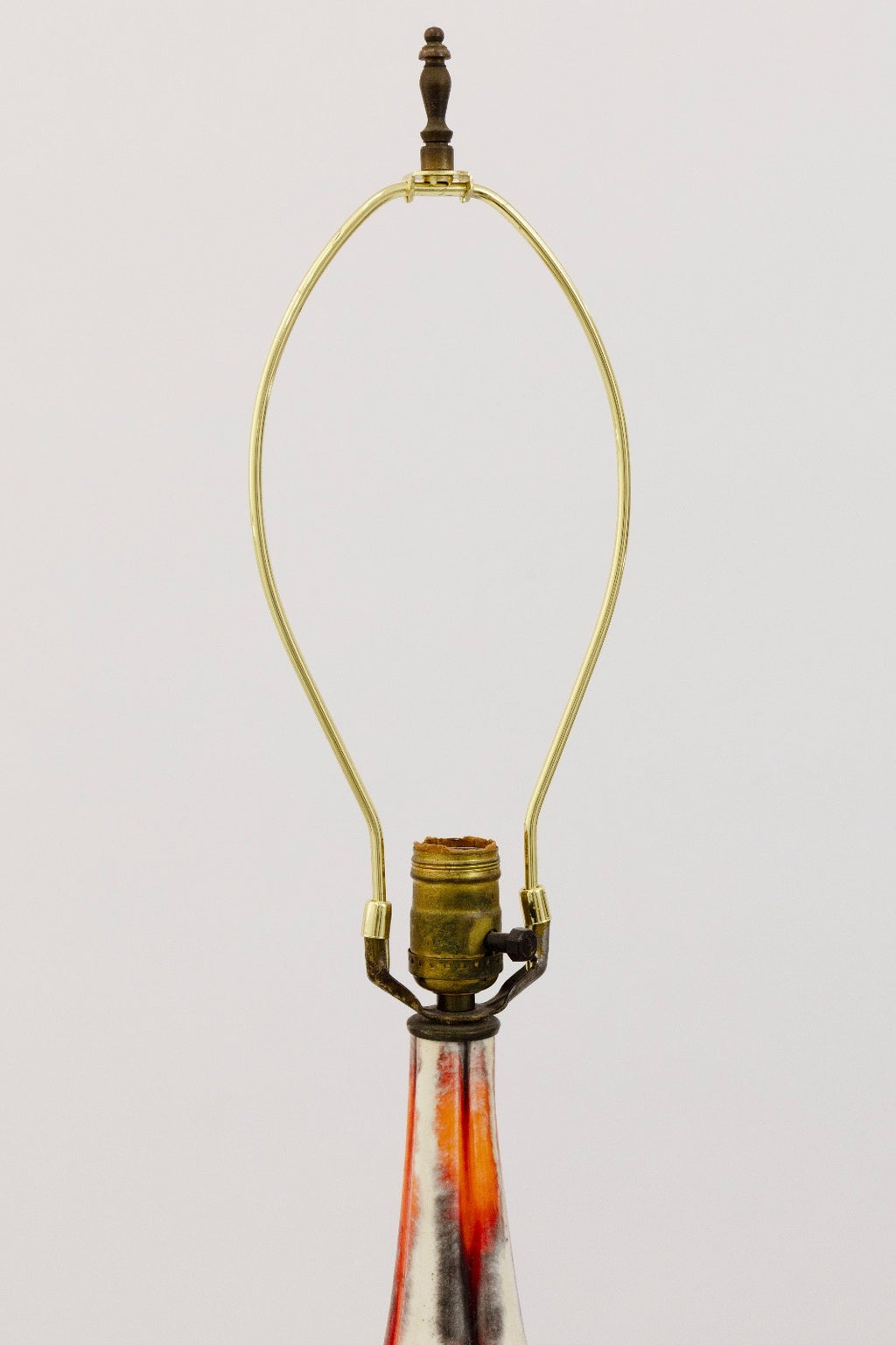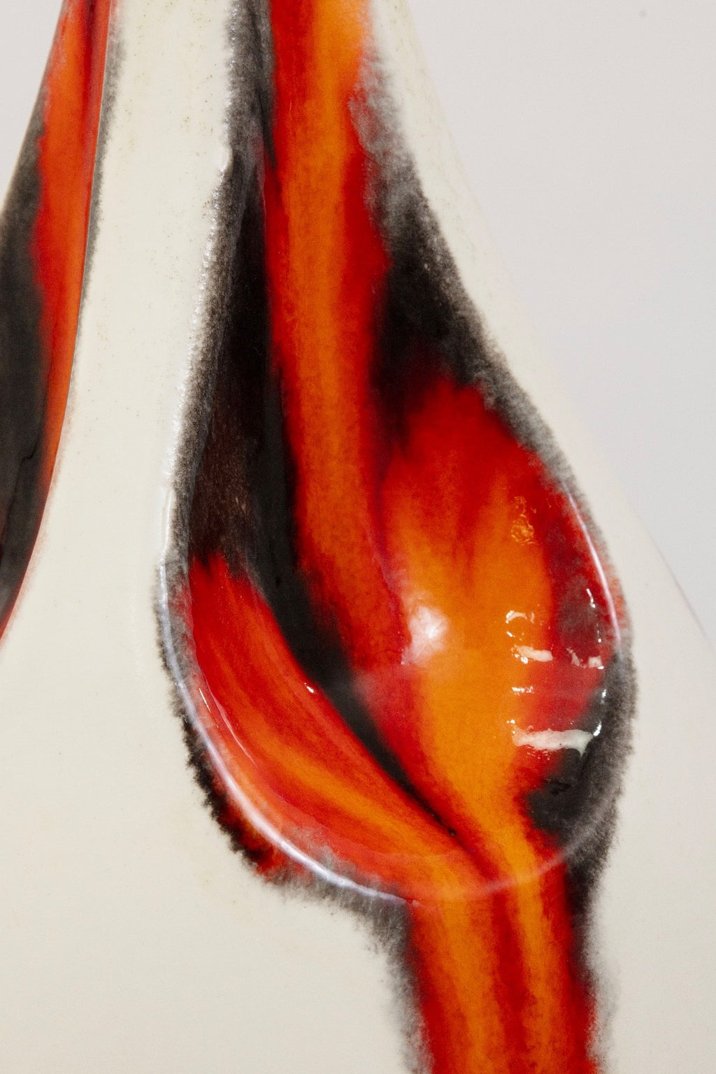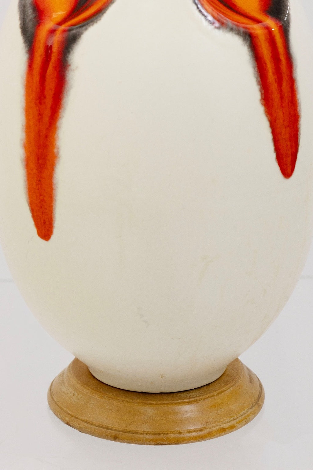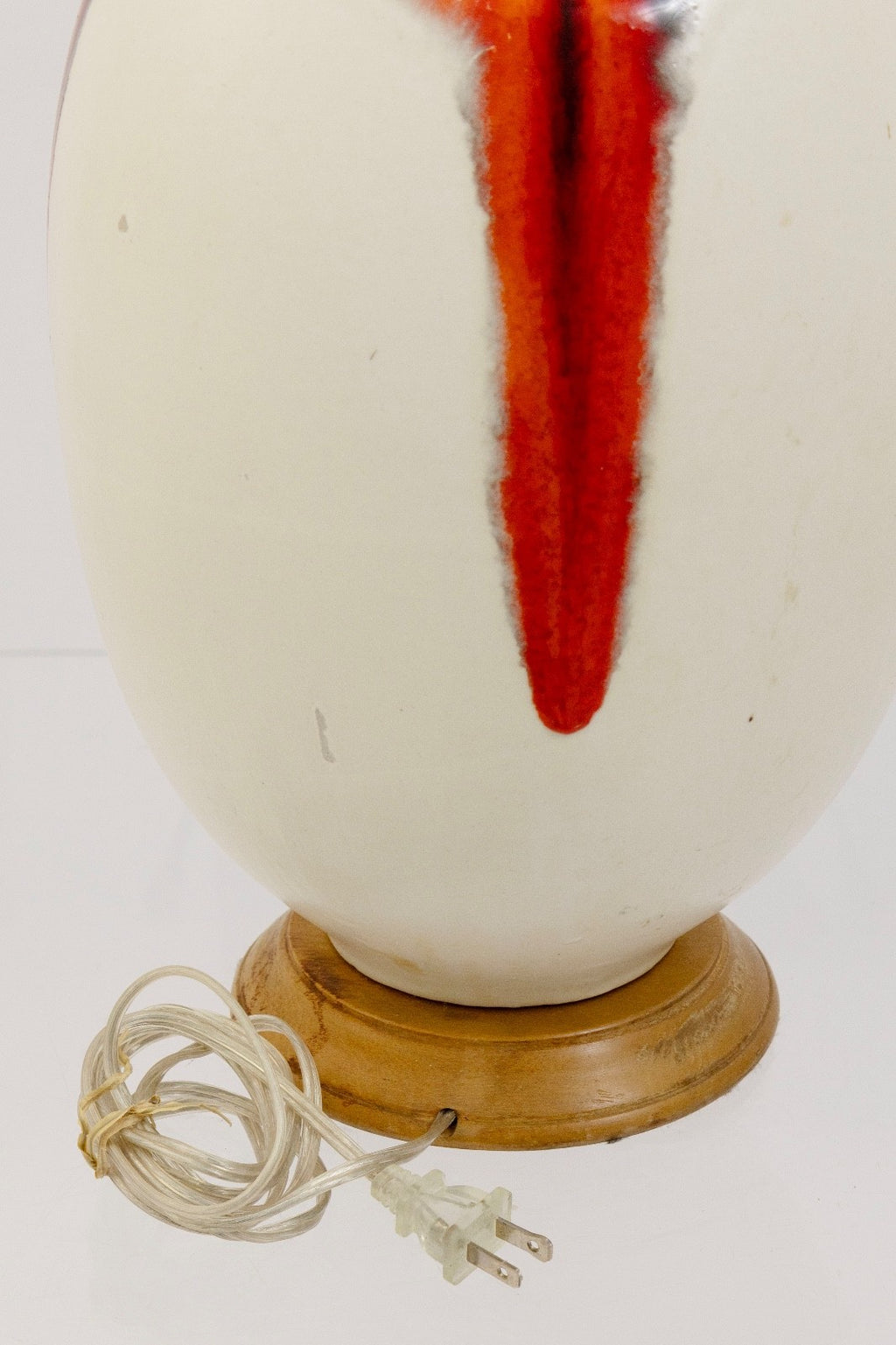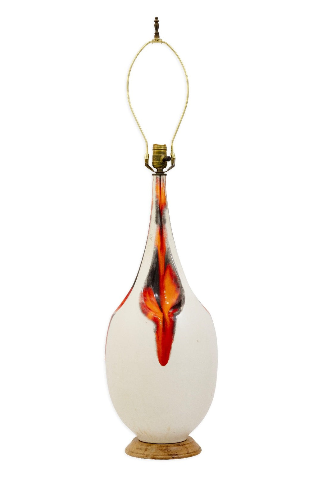 This ceramic table lamp brings Mid Century character with their sculptural silhouettes and drip-glaze detailing. The lamp features an off white body accented by strokes of orange and charcoal glaze that flow down the surface, creating a sense of movement and artistry. The elongated teardrop form sits on a wooden base, adding a simple contrast to the ceramic finish. The lamps is in good condition and measures at 39.5 inches in height and have a diameter of 10 inches.