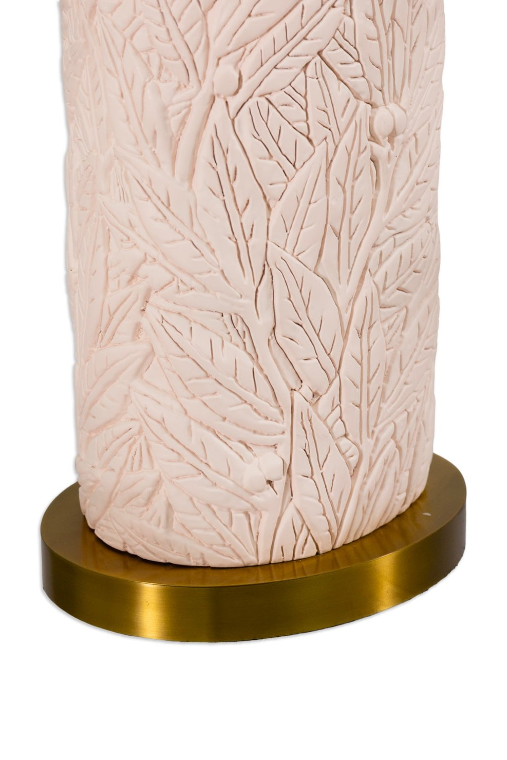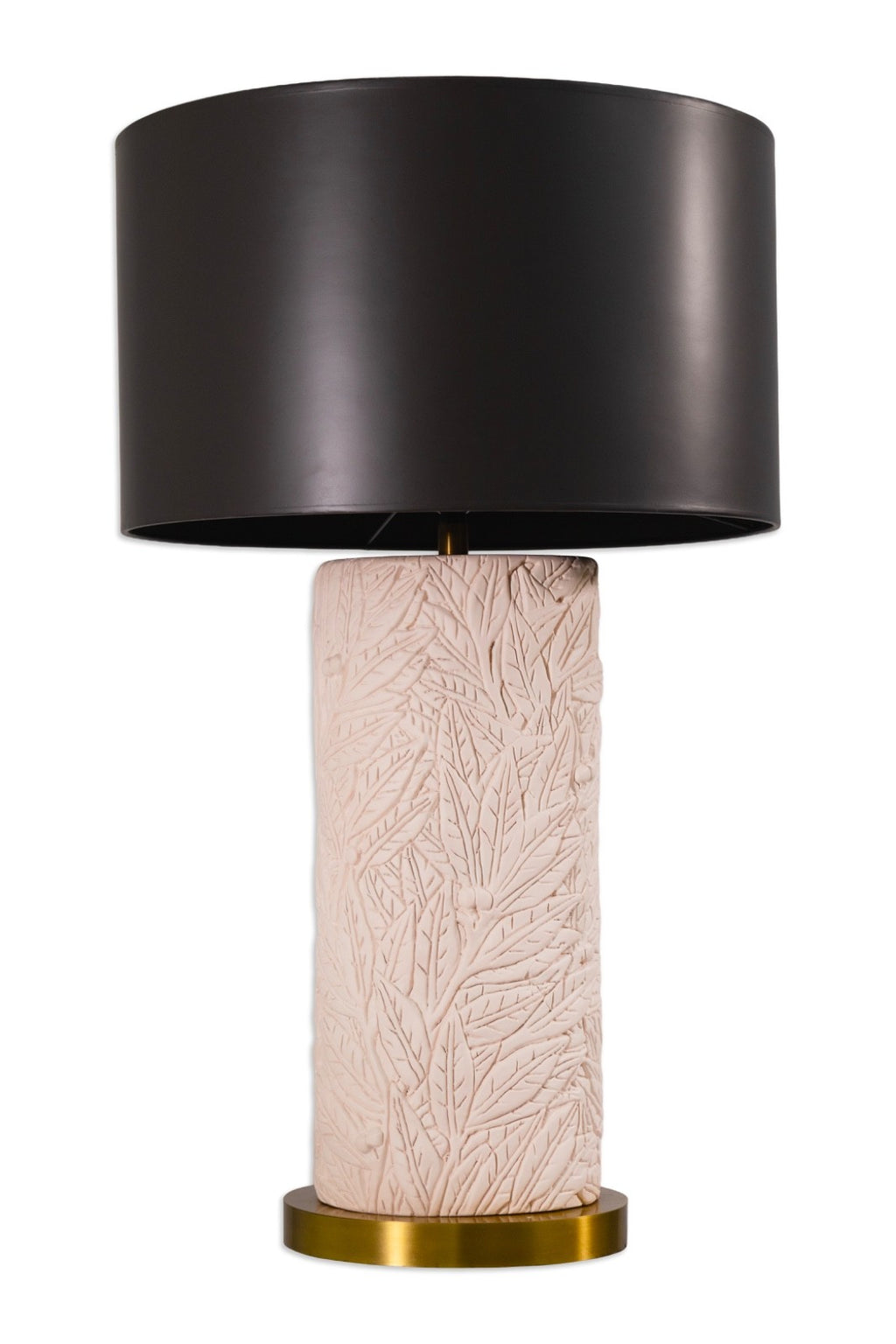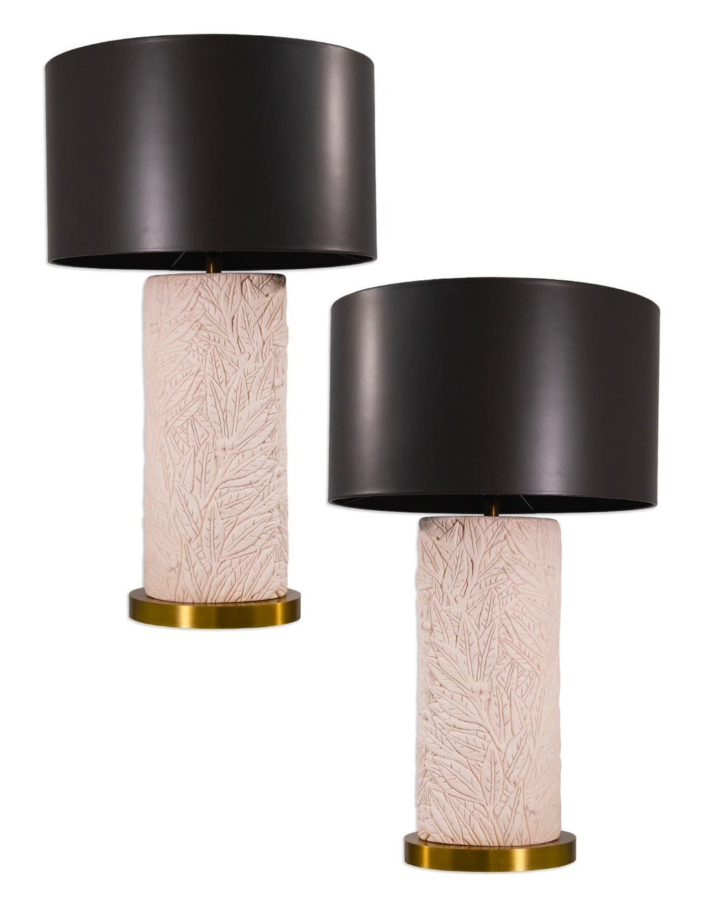 A stylish pair of table lamps featuring textured pink ceramic bases adorned with an intricate flower and leaf relief pattern. Each lamp is topped with a sleek black vinyl drum shade that adds a bold contrast to the soft pastel tone of the base. Resting on a brushed brass circular base, these lamps beautifully blend organic texture with contemporary sophistication, making them ideal for bedrooms, living spaces, or entryways. The lamps are in good condition and measure 31.5 inches in height and a diameter of 19 inches.