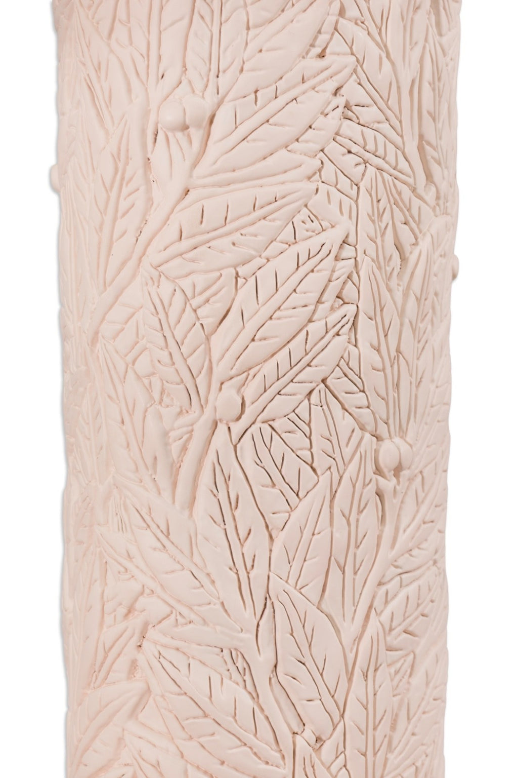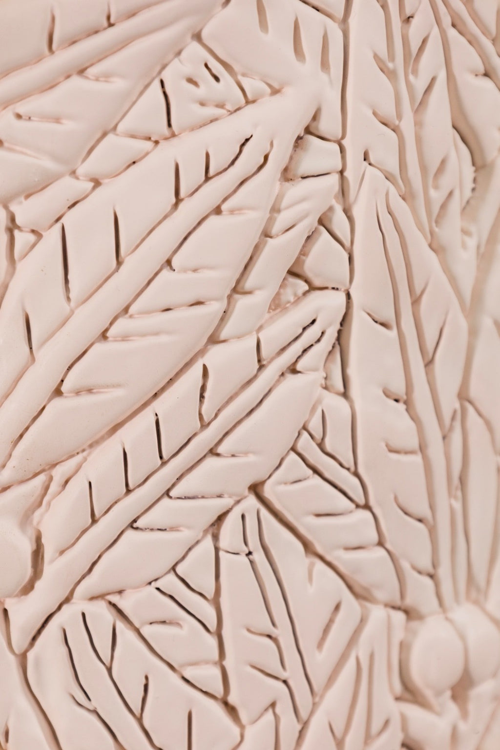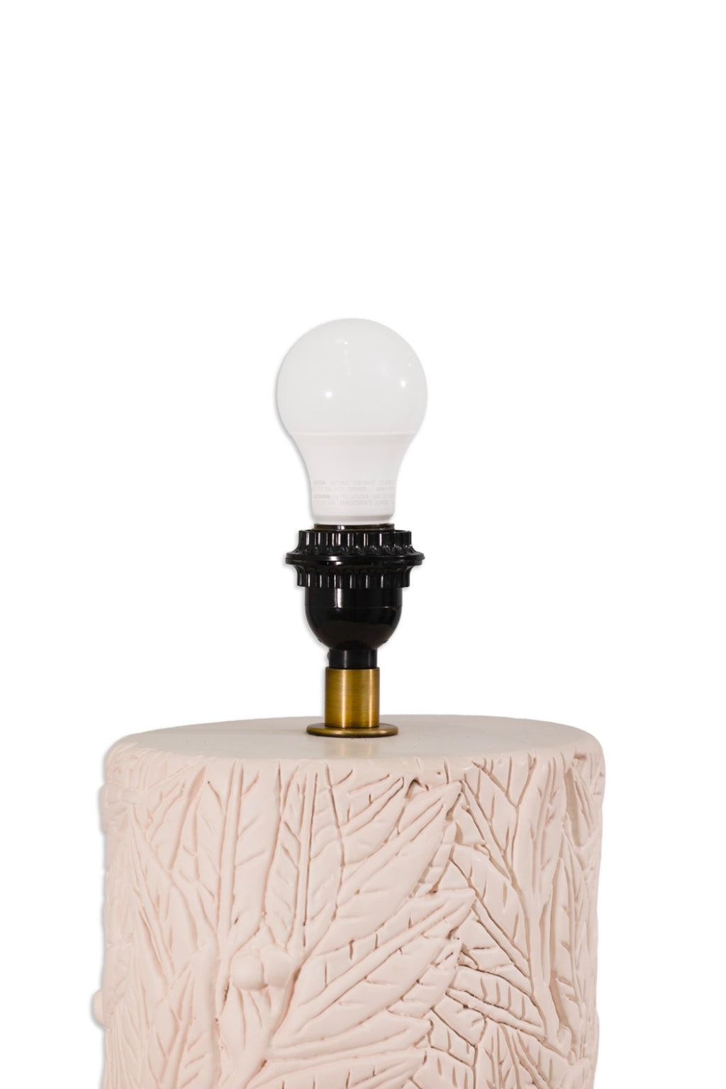 A stylish pair of table lamps featuring textured pink ceramic bases adorned with an intricate flower and leaf relief pattern. Each lamp is topped with a sleek black vinyl drum shade that adds a bold contrast to the soft pastel tone of the base. Resting on a brushed brass circular base, these lamps beautifully blend organic texture with contemporary sophistication, making them ideal for bedrooms, living spaces, or entryways. The lamps are in good condition and measure 31.5 inches in height and a diameter of 19 inches.