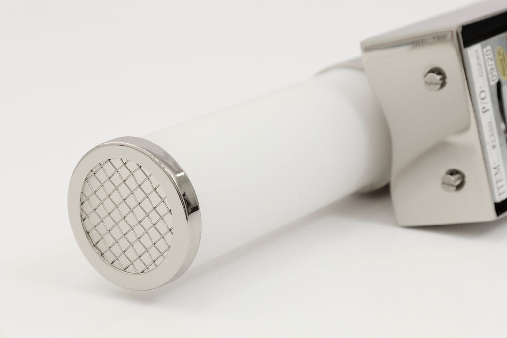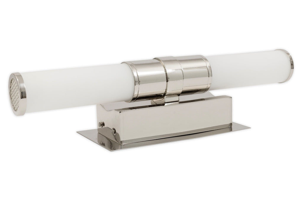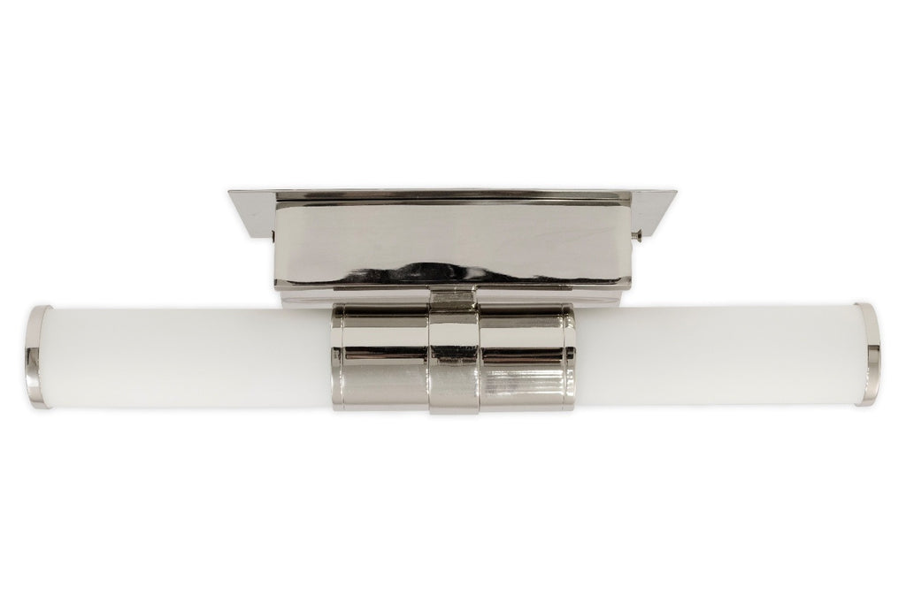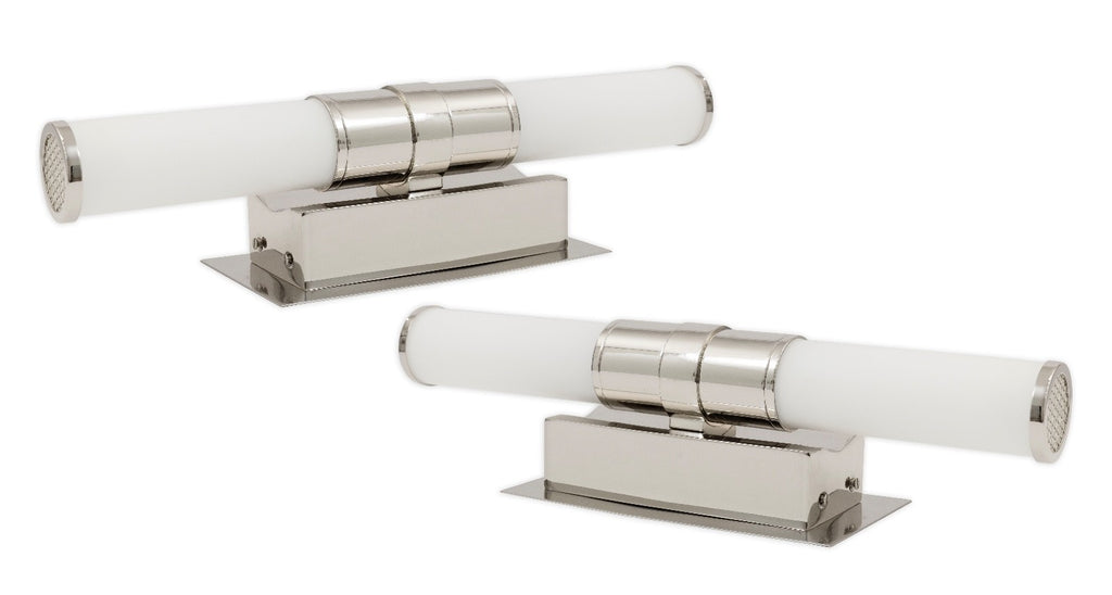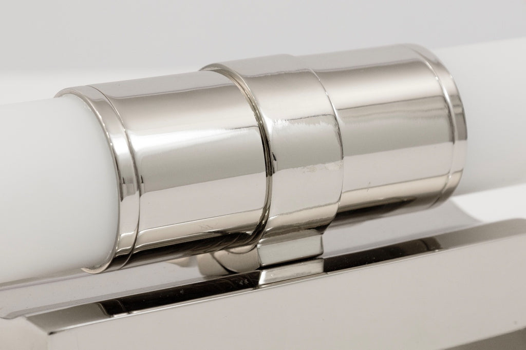 This pair of Robert Abbey Roderick wall sconces brings a clean, contemporary presence with their streamlined cylindrical form and polished metal finish. Each sconce features a frosted white glass tube shade secured by a sleek metal collar, creating a soft, even glow ideal for hallways, bathrooms, or modern living spaces. The rectangular backplate and crisp geometric lines lend a refined architectural feel, while the horizontal orientation adds balance and symmetry when displayed as a pair. Stylish and versatile, these sconces offer an elegant lighting solution that complements both minimalist and modern interiors. The scones are in good condition and when flat like shown above measure 4 inches in height, 16.5 inches in width and 5 inches in depth.