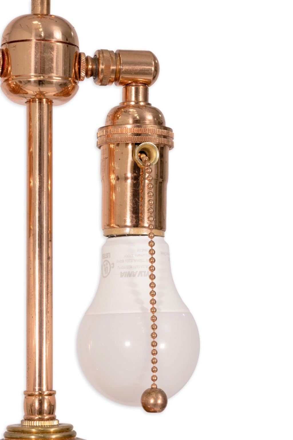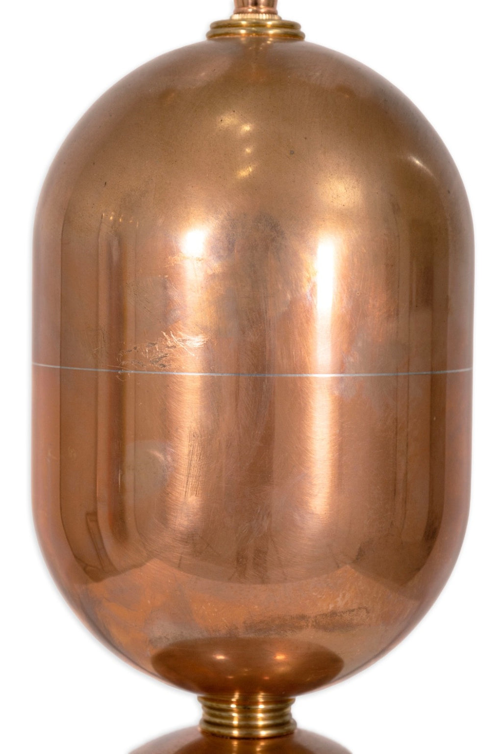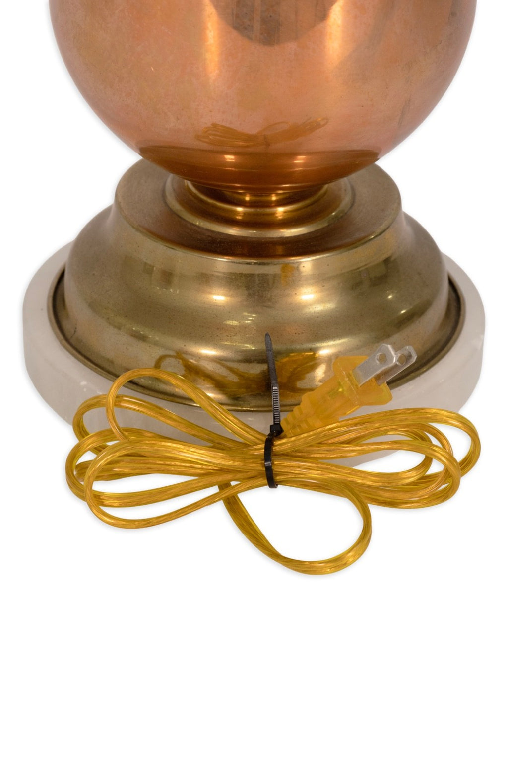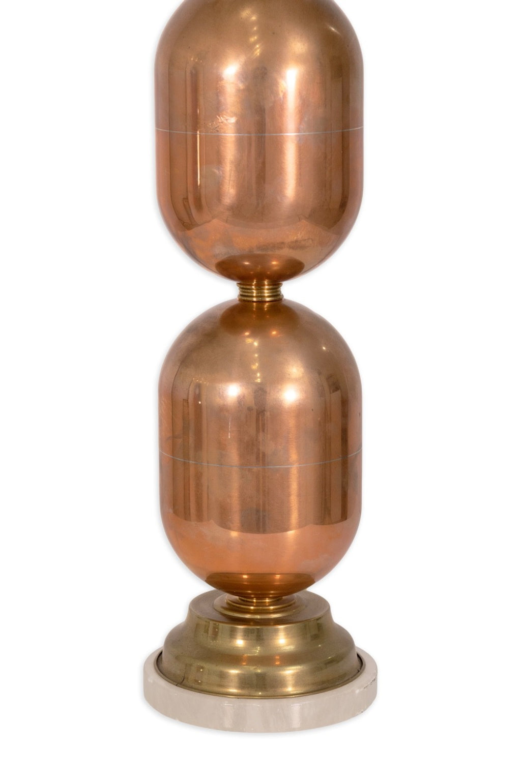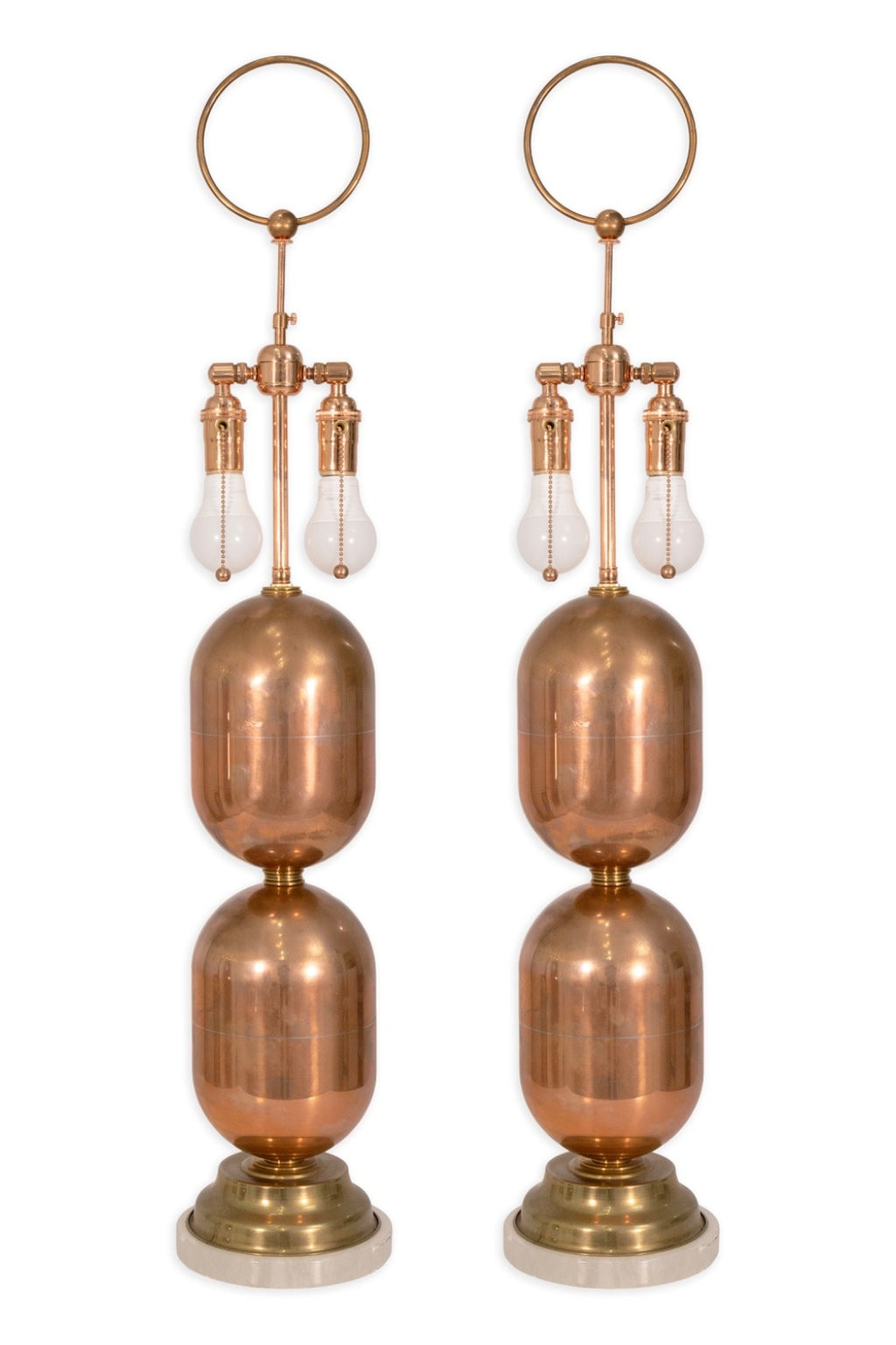 This striking pair of Spanish table lamps features a sculptural design composed of stacked polished copper forms resting on elegant stone pedestal bases. The gleaming copper surfaces create a warm, reflective glow, beautifully contrasted by the smooth, cool tone of the stone. Each lamp is fitted with dual sockets and pull chains, offering both function and refined style. A perfect statement for Mid Century or contemporary interiors, these lamps showcase exceptional craftsmanship and timeless material harmony. The Lamps are in good condition with some signs of wear consistent with age. The lamps measure 38 inches in height and have a diameter of 7 inches.