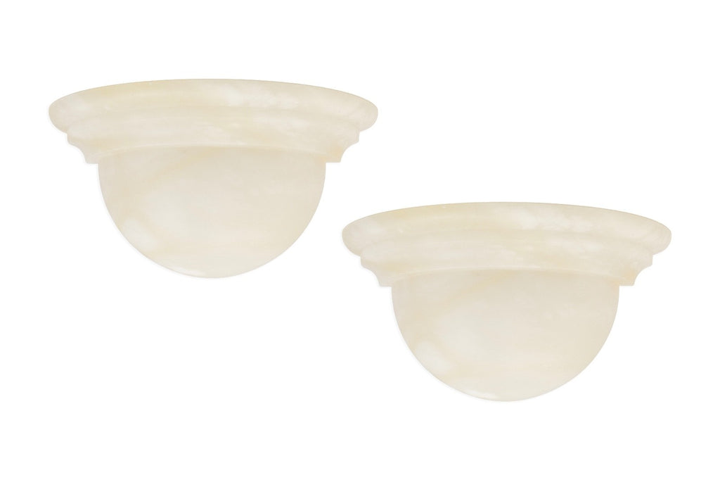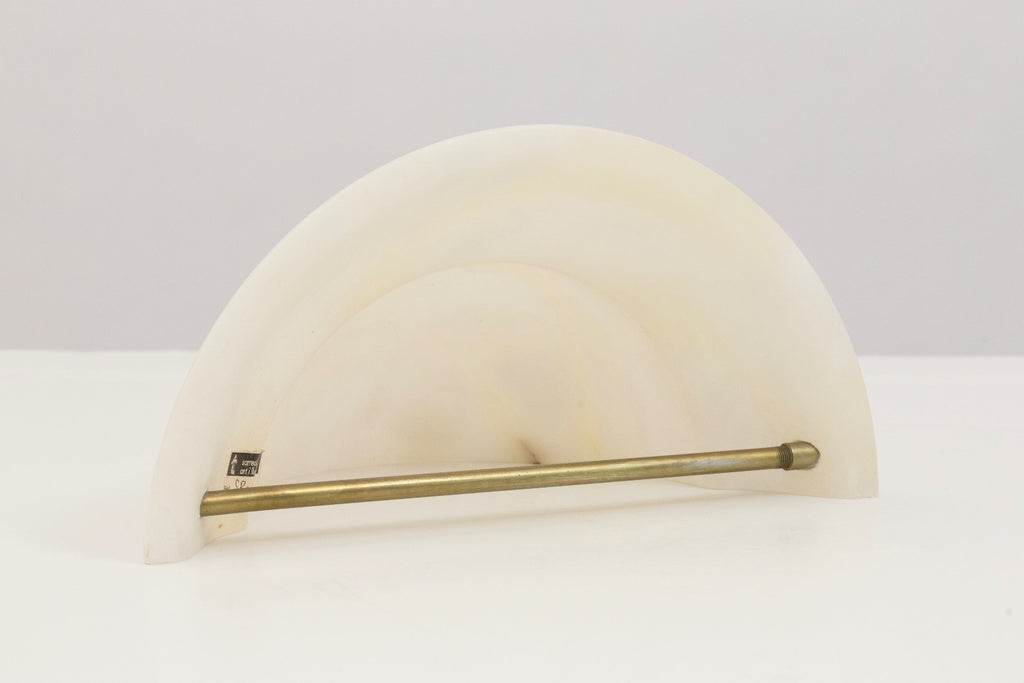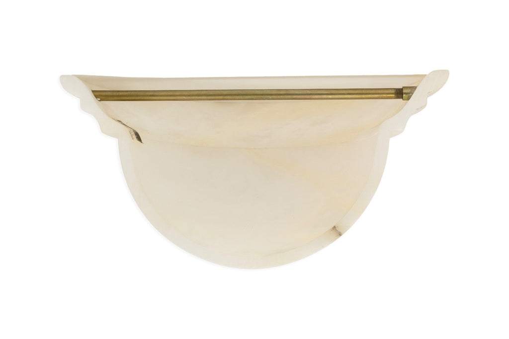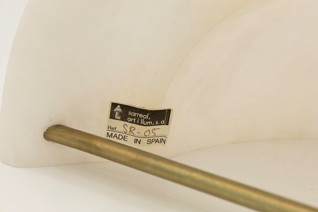 This pair of Spanish Sarreal Art Illum wall sconces showcases the timeless beauty of hand carved alabaster with softly sculpted bowl forms. Each sconce features a gently flared lip and smooth, luminous surface that highlights the natural veining and warm translucence of the stone. When illuminated, the alabaster diffuses light evenly, creating an ambient glow that adds depth and atmosphere to any space. Elegant yet understated, these sconces reflect the refined craftsmanship and sculptural sensibility associated with Sarreal Art Illum, making them well suited for both classic and modern interiors. The sconces are both in good condition and measure at 6.75 inches in height, 13 inches in width and 6.5 inches in depth.