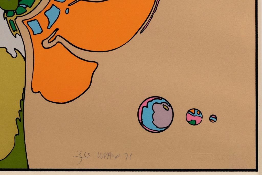 A quintessential example of Peter Max’s psychedelic Pop Art style from the early 1970s, Crab Nebular Man depicts a futuristic, winged figure rendered in bold, vibrant hues of orange, green, pink, and blue against a neutral ground. The composition radiates Max’s cosmic and countercultural sensibility, blending surrealism and celestial imagery with fluid, graphic outlines. The figure’s wing-like extensions and surrounding planetary forms evoke themes of space exploration and transcendence—hallmarks of Max’s “Cosmic” period.