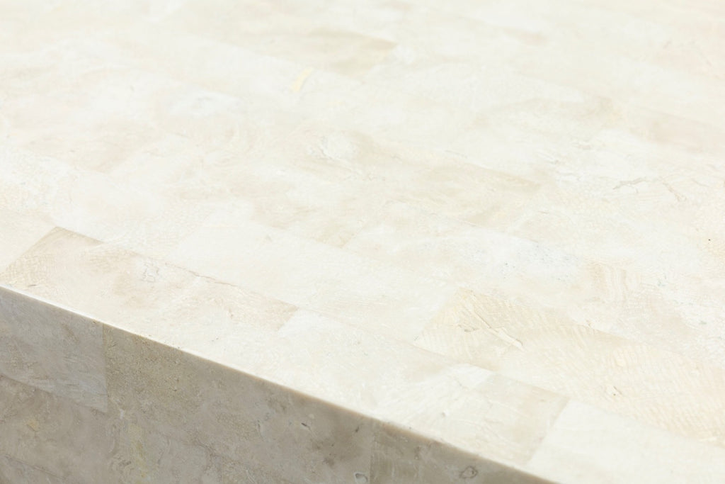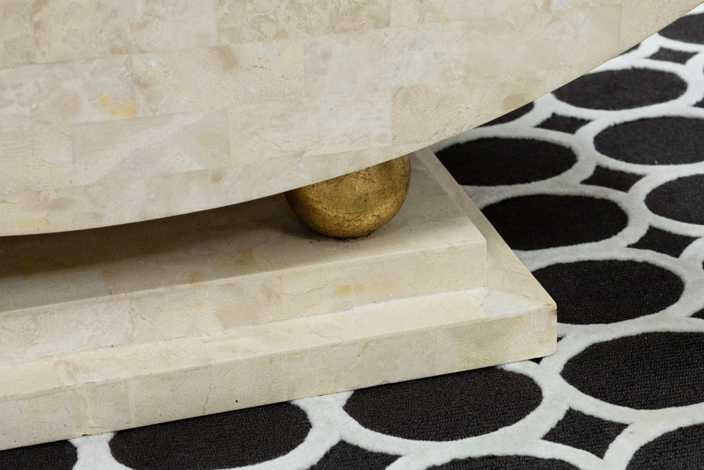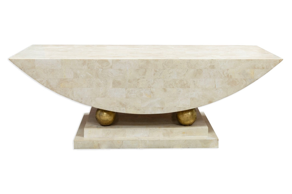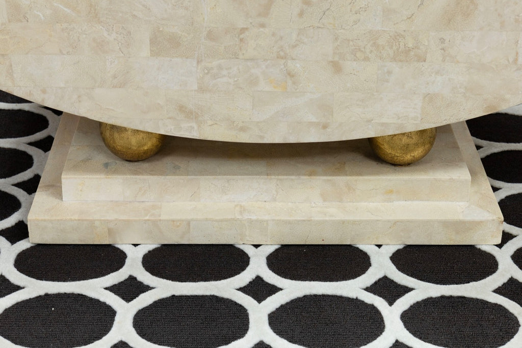 This post modern coffee table showcases a bold architectural form crafted from polished tesselated stone in soft, neutral tones. The table rests on a stepped stone plinth supported by spherical elements finished in a brass tone, introducing warmth and contrast without overpowering the overall composition. Its timeless materials and sculptural base make it well suited for design-forward interiors seeking a distinctive focal point. The table is in good condition and measures 15 inches in height, 42.5 inches in width and a depth of 18 inches.