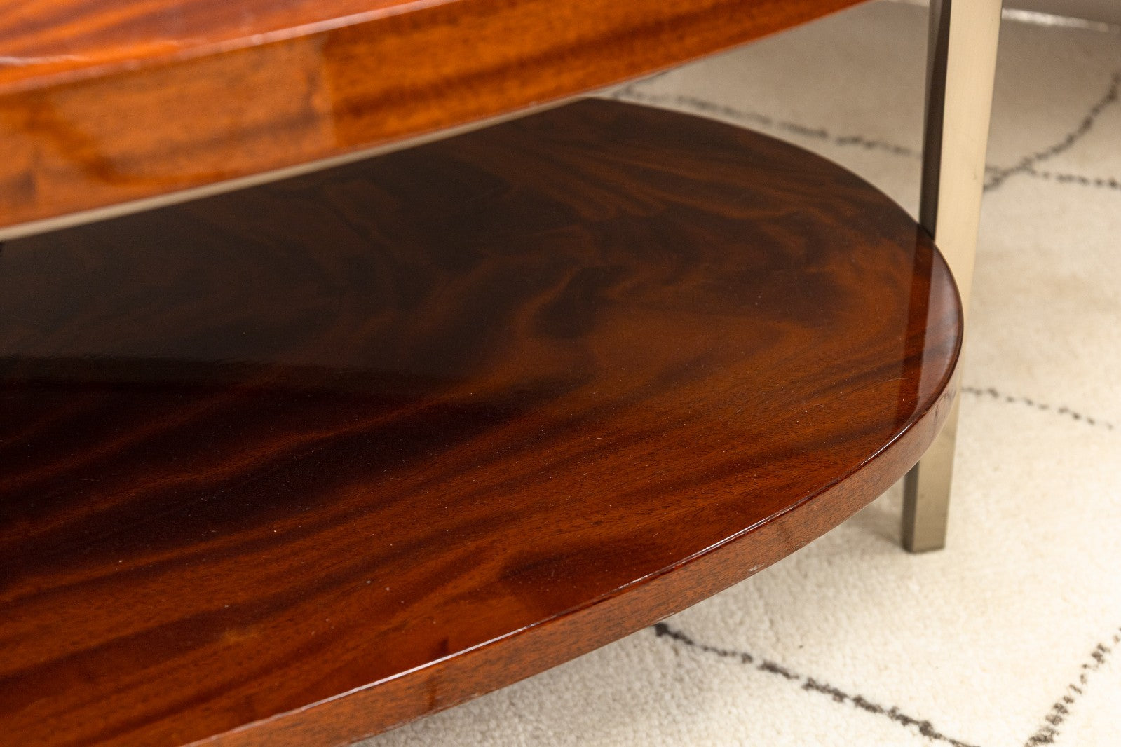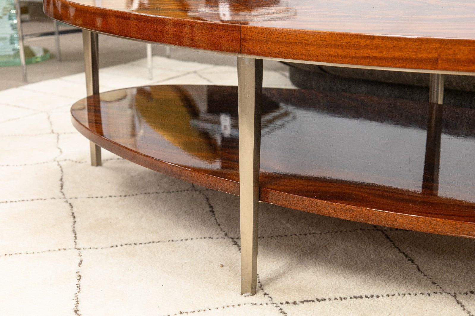 A vintage Greg Sheres Italian mahogany Verite collection cocktail coffee table. This chic coffee table designed by Sheres features a stunning mahogany table top. This mahogany is finished with a beautiful glossy effect, highlighting the beautiful grain patterning of the Italian mahogany. This table has a two tier design, and four metal support legs. It is in very good condition overall, with some very small scratches and scuffs common with used furniture. This table measures 16.25 inches tall, 53.5 inches long, and 27.75 inches wide.