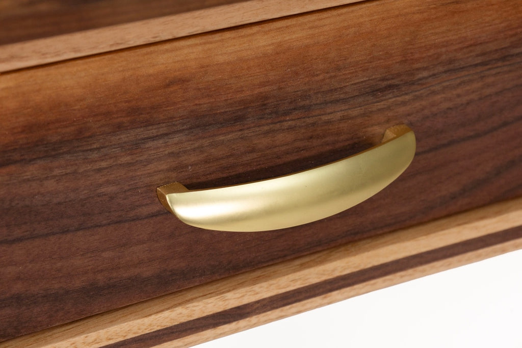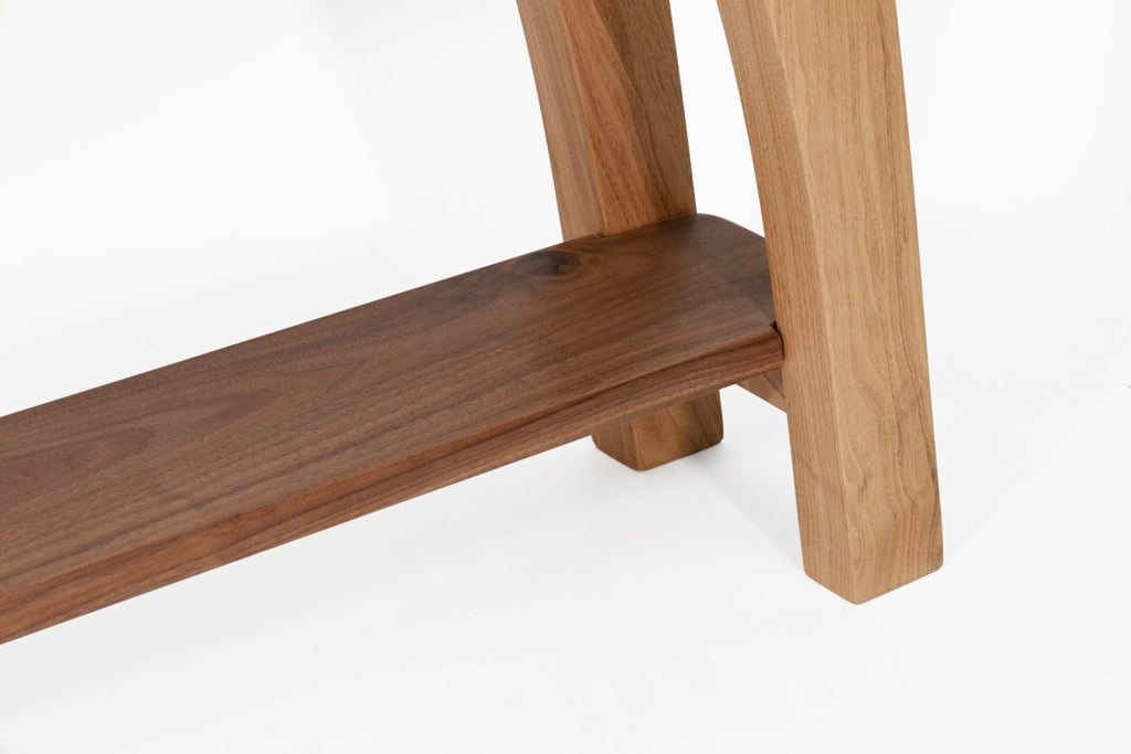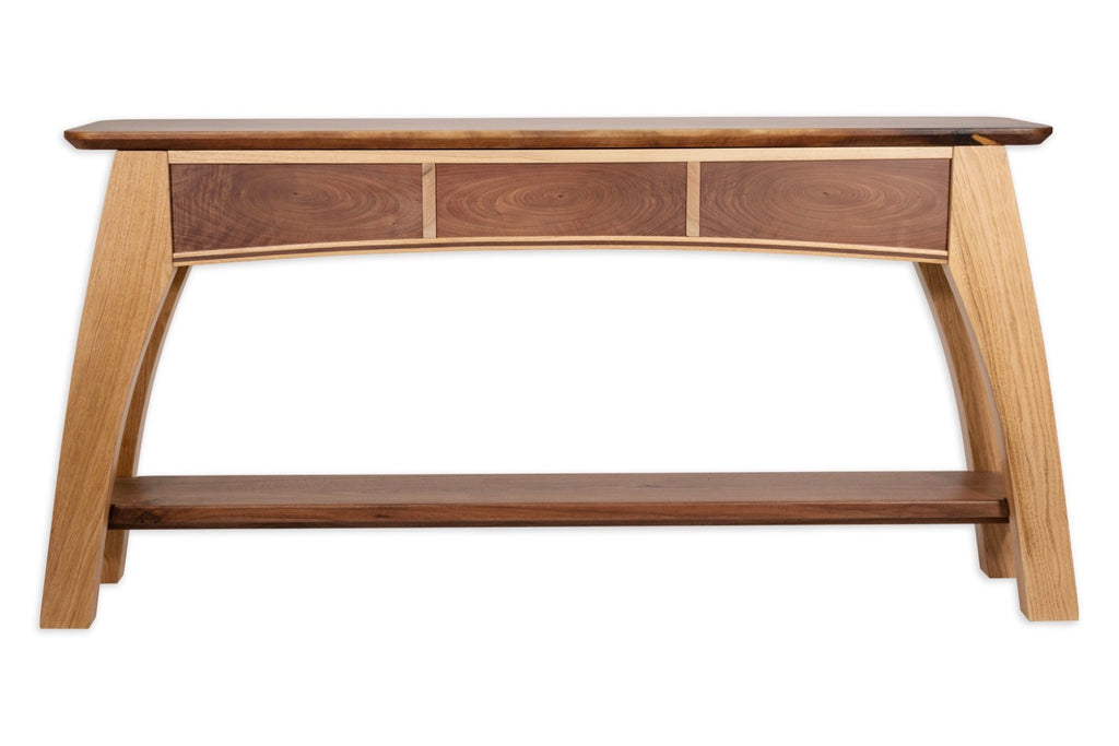 This beautifully handcrafted console table showcases the natural harmony between rich walnut and warm butternut woods. The gently curved legs and beveled edges highlight expert craftsmanship, while the contrasting tones bring depth and visual balance to the design. Three smoothly operating drawers provide convenient storage, and the lower shelf adds both stability and function. Perfect for an entryway, living room, or hallway, this custom-made piece blends modern simplicity with timeless artistry, emphasizing the beauty of fine woodworking and natural materials. The table is in great condition and measures at 31.25 inches in height, 58.5 inches in width and 13.5 inches in depth.