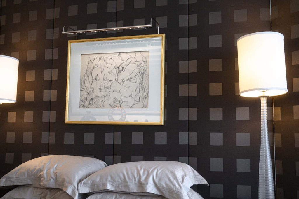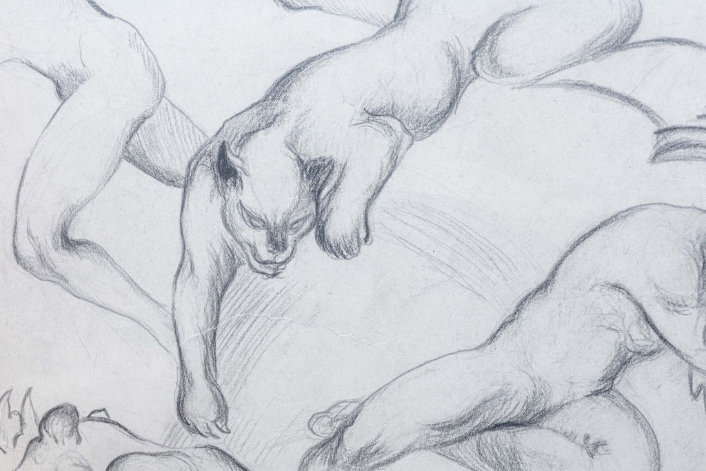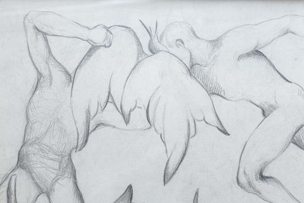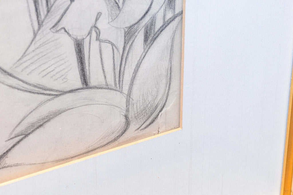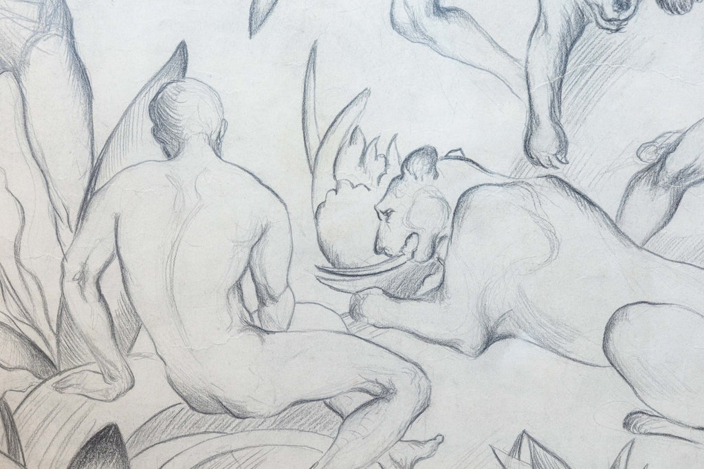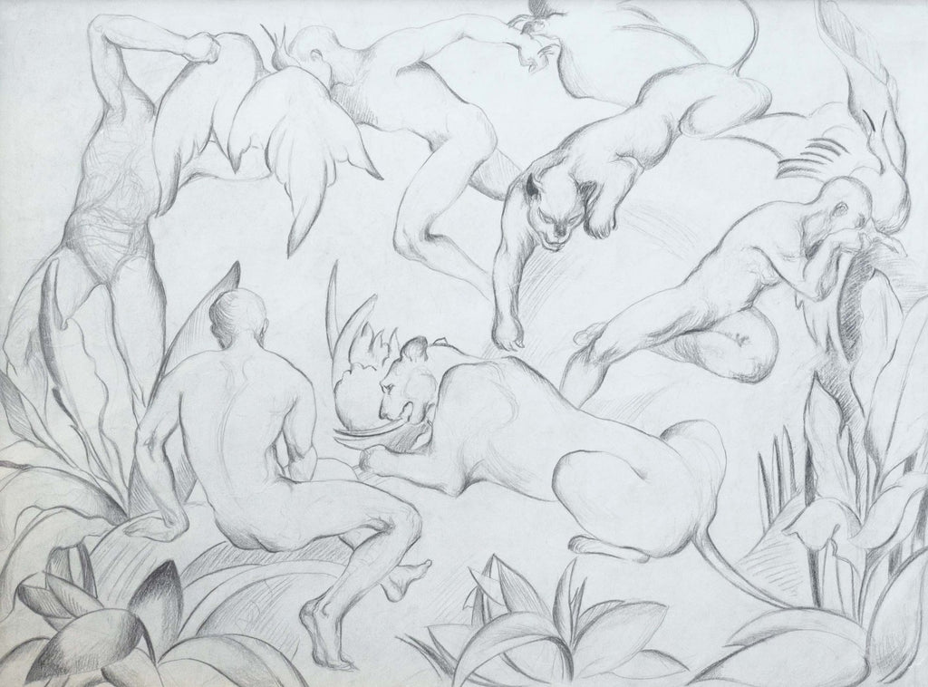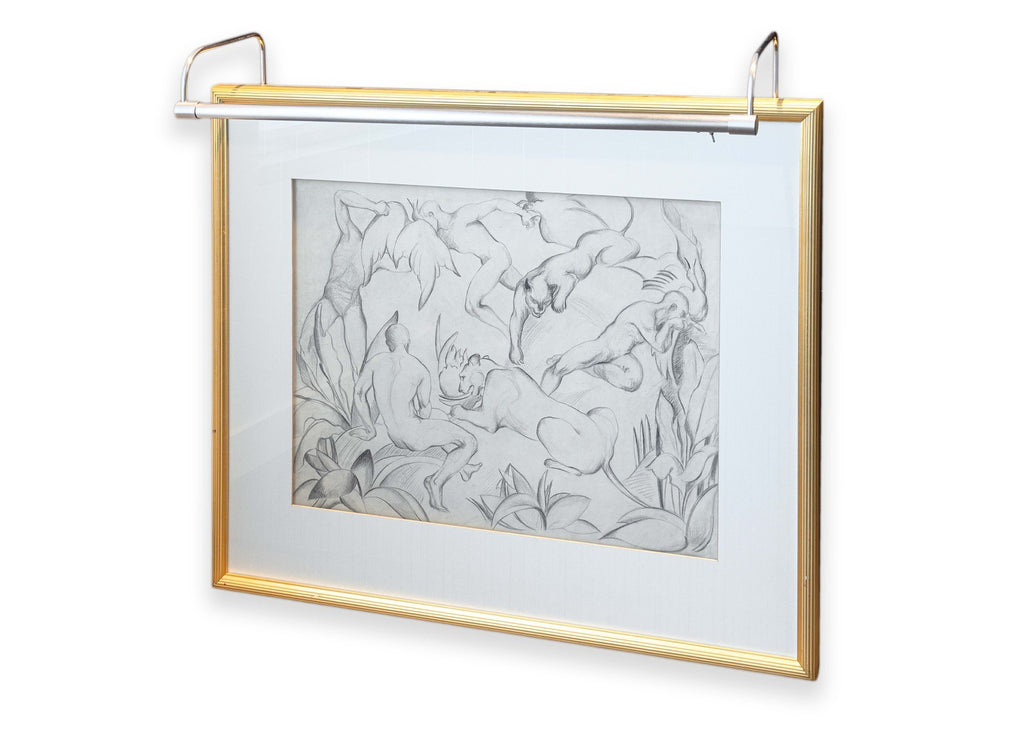 A modern graphite drawing on paper by American artist William Hentschel (1892–1962). This dynamic composition features a series of nude male figures interwoven with panthers and lush tropical foliage, rendered in strong yet fluid graphite lines. Hentschel’s study reveals both his mastery of anatomy and his interest in stylized, rhythmic design, echoing the Art Deco sensibility and decorative modernism of the period. A noted designer, painter, and educator, Hentschel was a central figure in Louisville’s art scene and served as a longtime instructor at the University of Louisville. His works often bridged fine art and design, integrating figuration with ornamental abstraction. This drawing embodies his approach, balancing academic draftsmanship with imaginative, decorative flourish. From a private collection; purchased from Duke Gallery in 1997. Dimensions: 28”h x 33.5”w x 1.5”d (framed). In very good condition with slight tear on edge (see photo for reference).