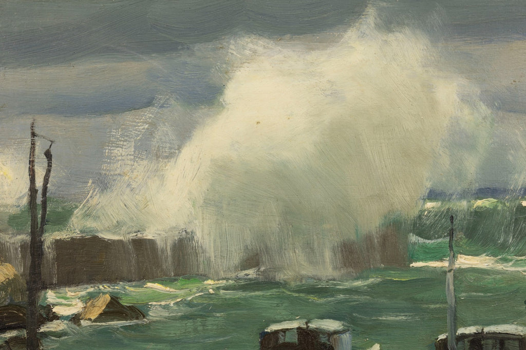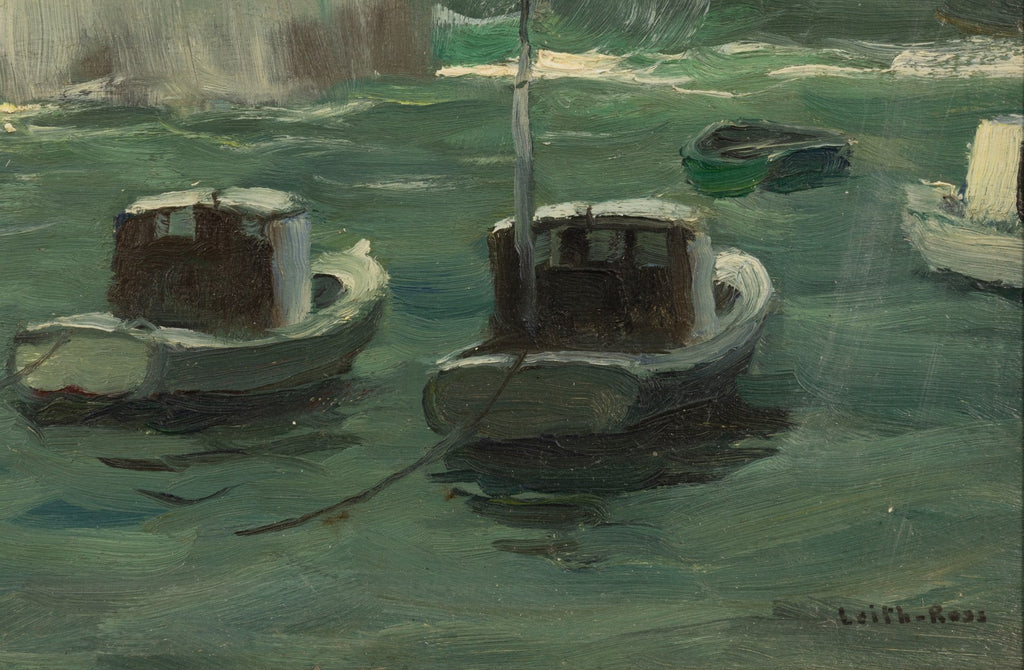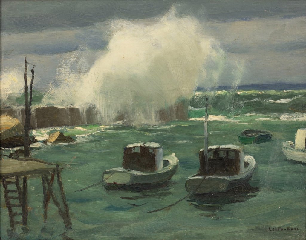 An oil on board by British-American artist Harry Leith-Ross. Signed lower right. This painting depicts a coastal scene with moored boats in the foreground and waves breaking against a pier. The composition emphasizes movement in the water through visible brushwork and layered tones of green and blue. A representative example of Leith-Ross’s coastal subjects, suitable for collectors of New Hope School painters and early 20th-century American marine scenes.From a private collection in Metro Detroit. Dimension: 13.75”h x 16”w x 2”d (framed). In very good condition. Surface shows age-appropriate wear consistent with period. Full condition reports available upon request.Harry “Tony” Leith-Ross (1886–1973) was a British-born American painter associated with the New Hope Art Colony and recognized for his marine and landscape subjects. He studied at the Royal College of Art in London before emigrating to the United States, where he became active in prominent art circles. Leith-Ross was a member of the National Academy of Design and exhibited widely at institutions including the Pennsylvania Academy of the Fine Arts, the Art Institute of Chicago, and the National Academy of Design. His work received multiple awards in national exhibitions, and he later served as an instructor at the Art Students League of New York, contributing to American representational painting in the early 20th century.