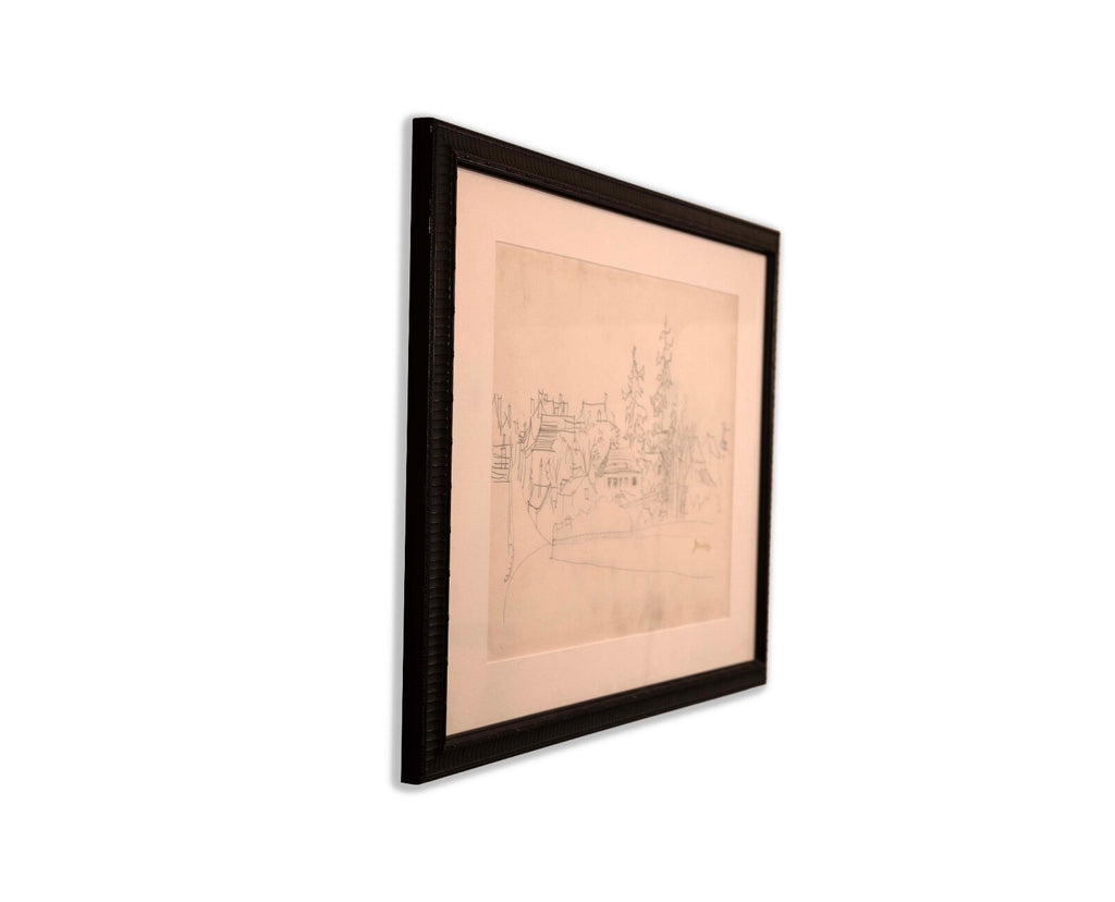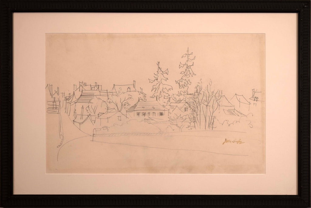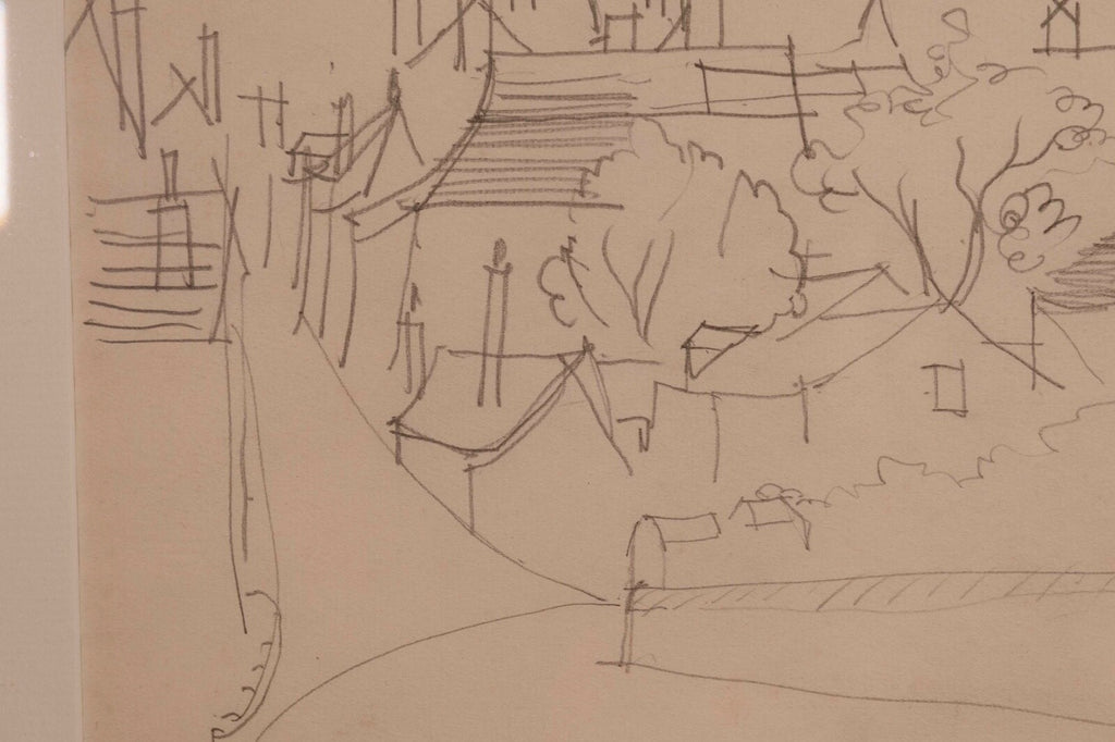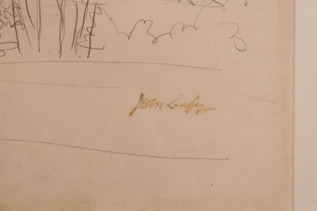This untitled graphite on paper drawing, signed by Jean Dufy, captures the charming essence of a neighborhood with its fluid, sketch-like lines and loose, expressive style. The composition is delicate and airy, suggesting the lively atmosphere of a quaint village or suburban area, with trees and buildings intermingled. Dufy's signature is subtly placed at the bottom, adding authenticity to the piece which is framed elegantly, making it a serene yet evocative addition to any collection. Dimensions: 26.5"w x 1"d x 18"h