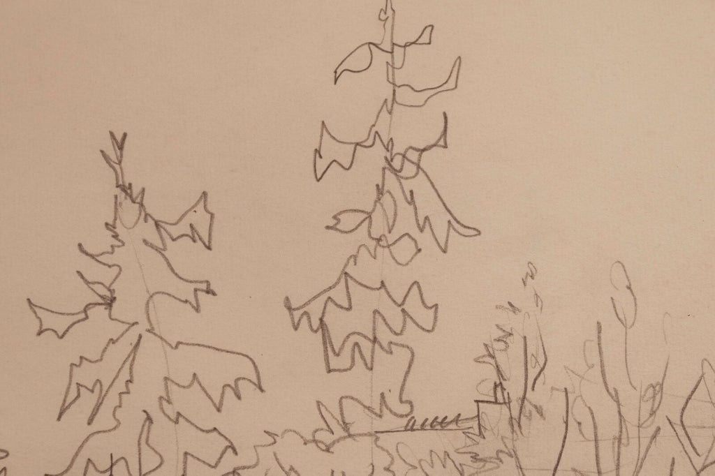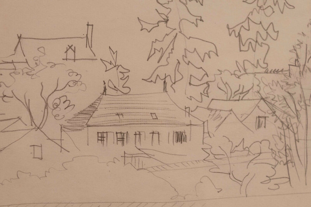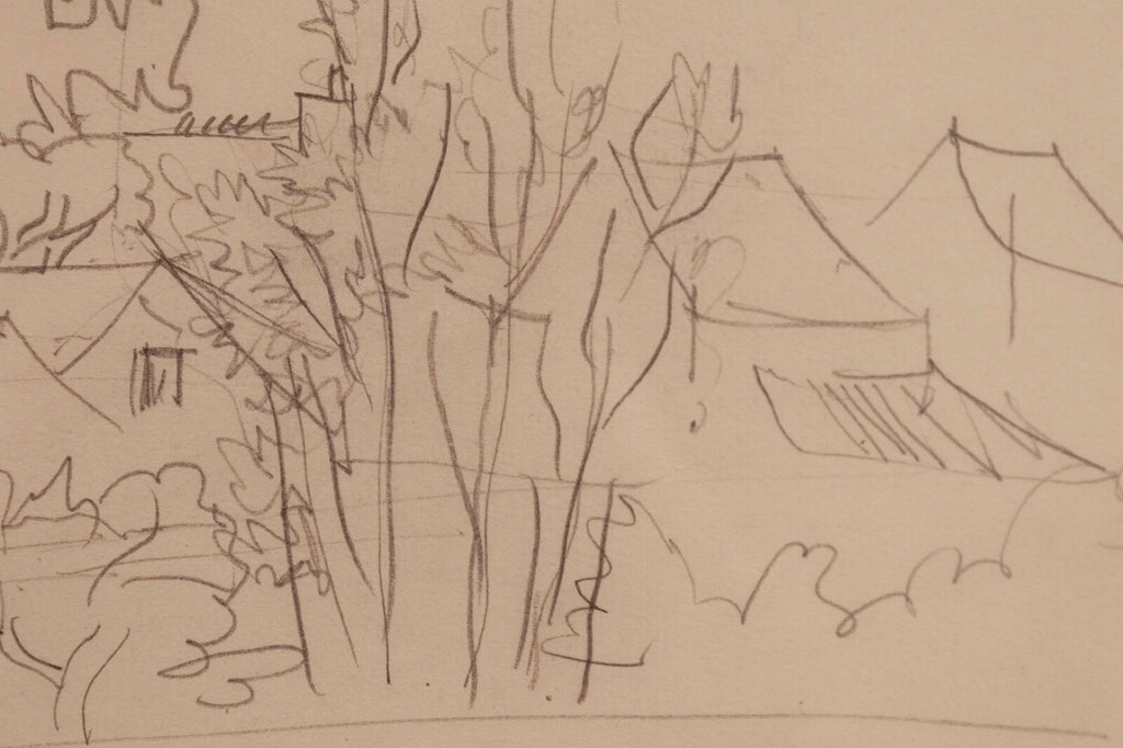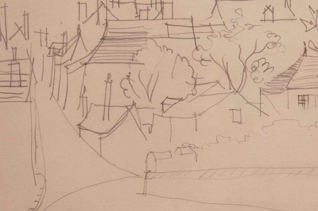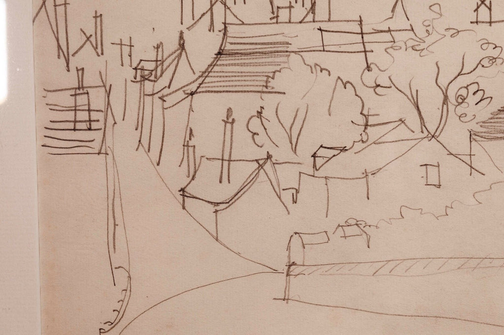 This untitled graphite on paper drawing, signed by Jean Dufy, captures the charming essence of a neighborhood with its fluid, sketch-like lines and loose, expressive style. The composition is delicate and airy, suggesting the lively atmosphere of a quaint village or suburban area, with trees and buildings intermingled. Dufy's signature is subtly placed at the bottom, adding authenticity to the piece which is framed elegantly, making it a serene yet evocative addition to any collection. Dimensions: 26.5"w x 1"d x 18"h