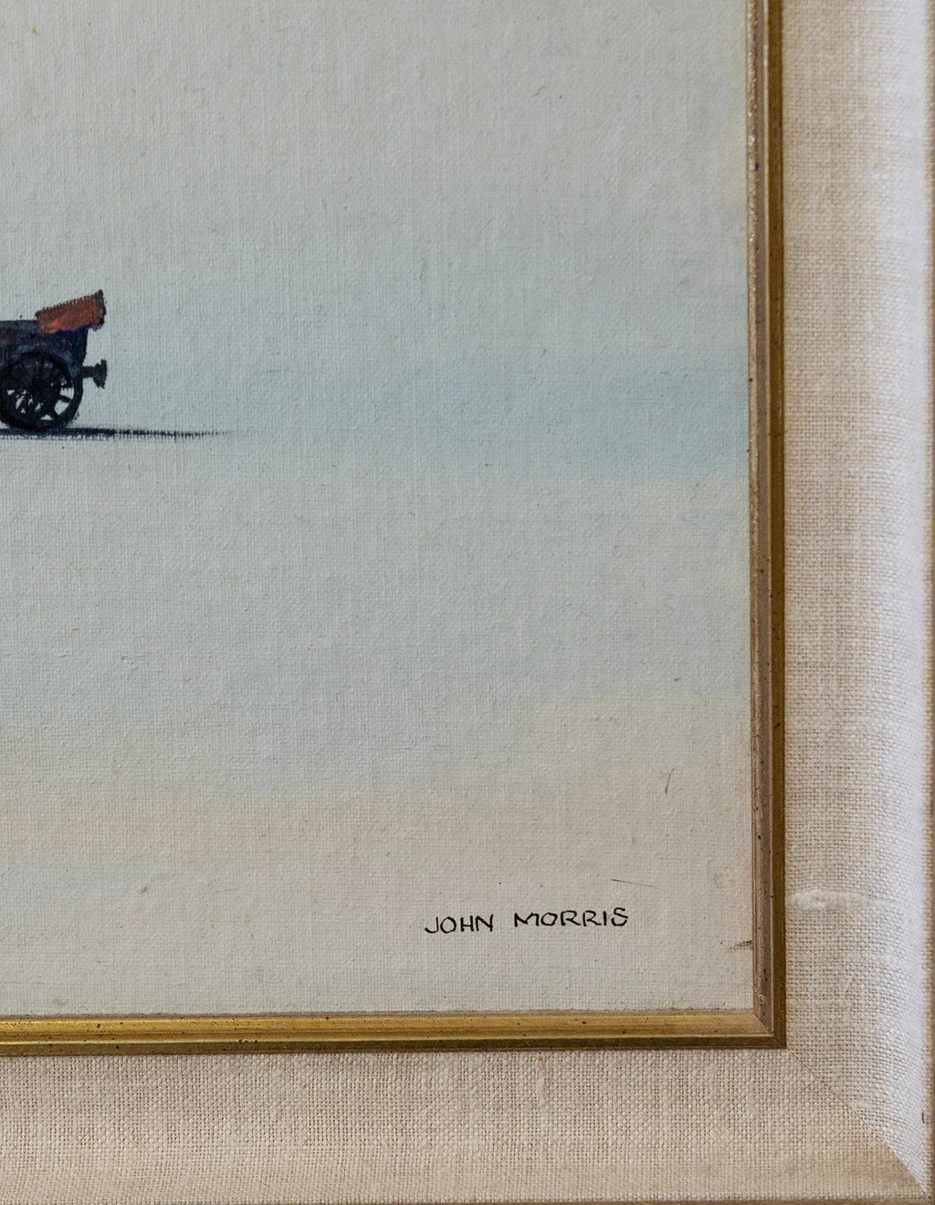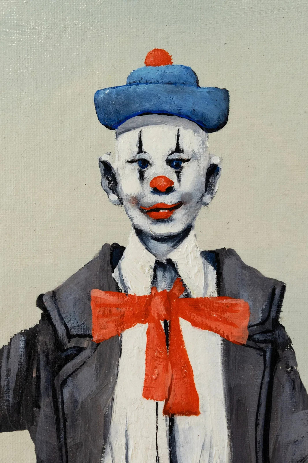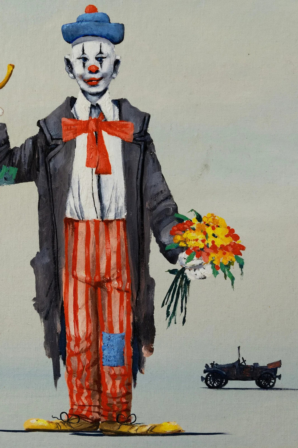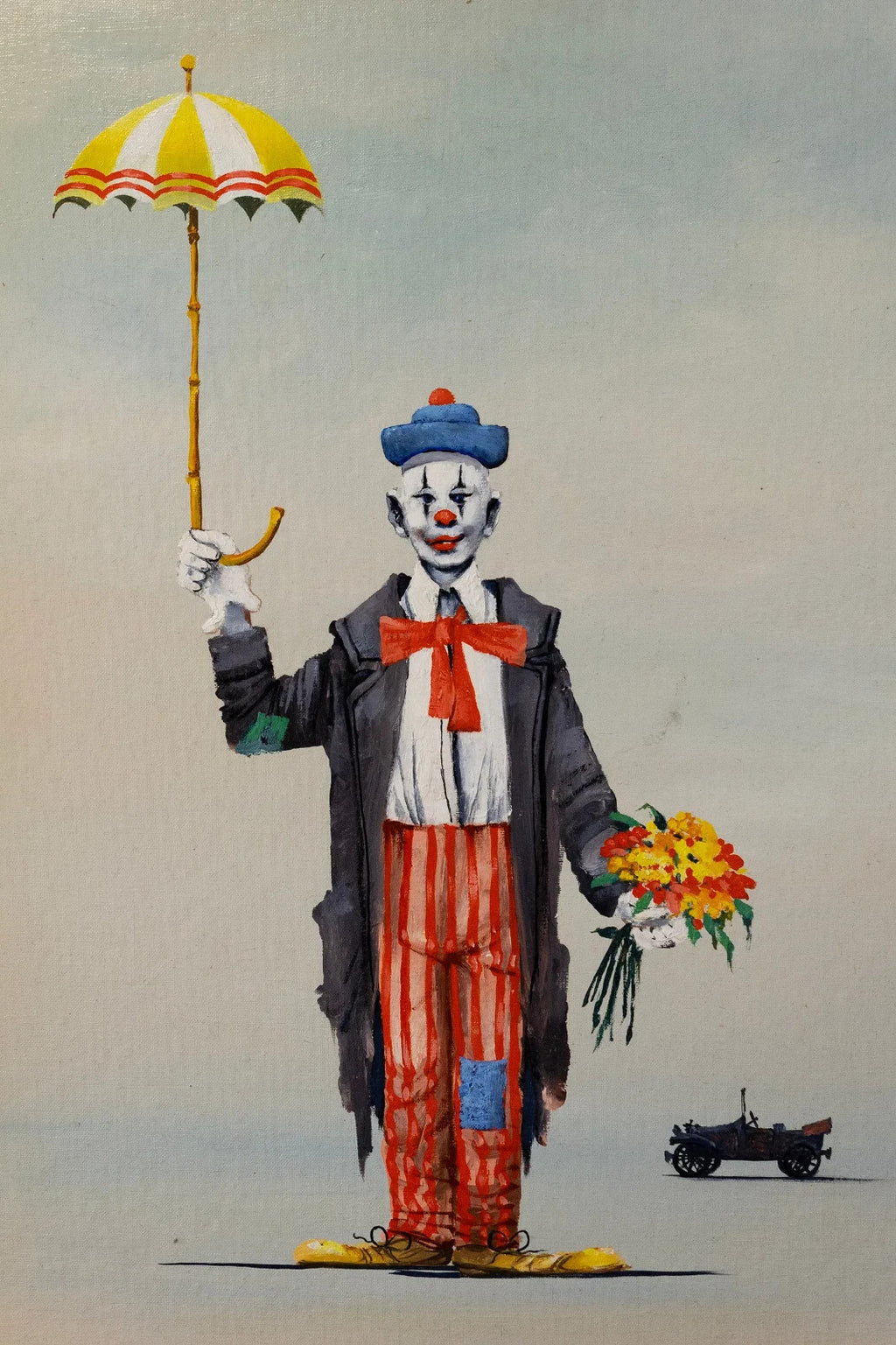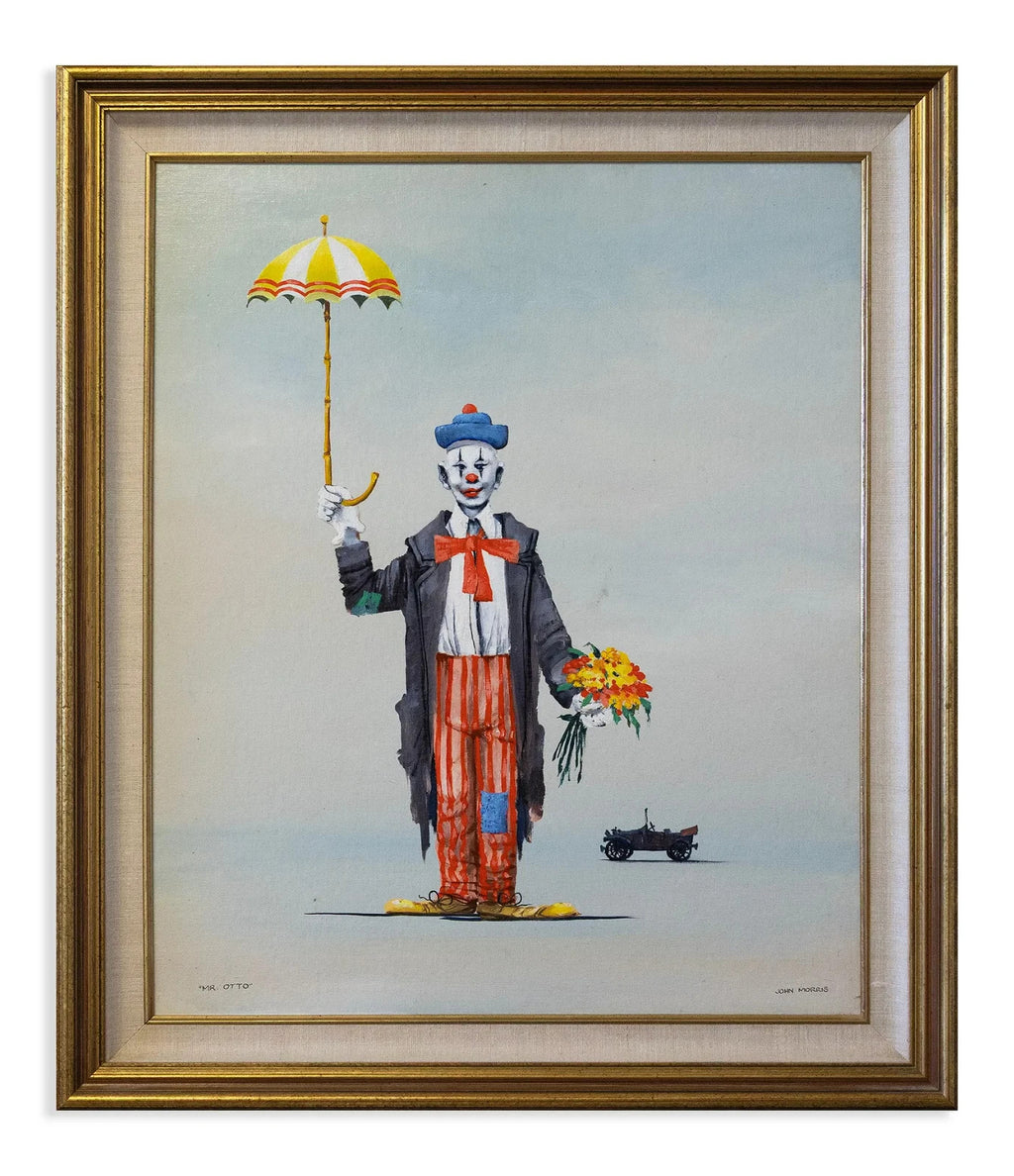 A midcentury modern surrealist oil painting on canvas titled “Mr. Otto” by John Morris. Hand signed lower right and titled lower left. Circa 1950s. A whimsical composition that features a clown-like figure dressed in bold red-and-white striped pants and a blue beret, holding a yellow umbrella and a bouquet of flowers. The sparse, dreamlike background and miniature car at the figure’s feet lend a surreal and symbolic quality. Rendered with crisp lines and delicate color balance, the work reflects Morris’s ability to infuse character studies with narrative depth and emotional nuance.Provenance: From the collection of Northwood University in Midland, Michigan; proceeds of the sale will go towards the University’s endowment. Dimensions: 48.5”h x 57.5”w x 2”d (framed). In very good vintage condition. Full condition reports are available upon request.John Morris (1920–1991) was an American impressionist painter from Laguna Beach, California. He began his career as a teenage portraitist and served as an official WWII combat artist, with work exhibited at the National Gallery in Washington, D.C.—a rare honor. Morris established an art center in Palm Springs in 1958, mentoring numerous figures from the film industry before devoting himself fully to painting. His work is held in the collections of the Santa Barbara Museum, Honolulu Academy of Art, and the Museum of Modern Art in Rio de Janeiro, among others. He has been collected by notable figures such as Mrs. Aristotle Onassis, Bing Crosby, and Frederick Loewe. In 2006, his work was posthumously honored by inclusion in the Vatican galleries.