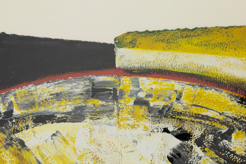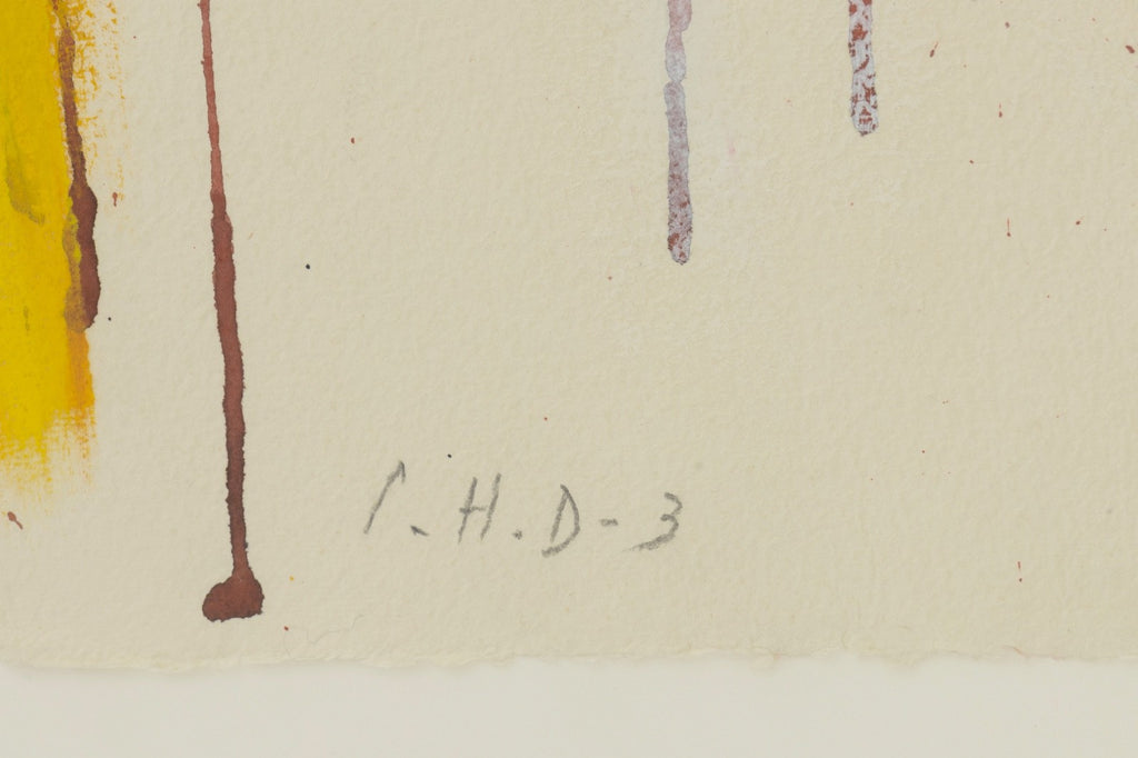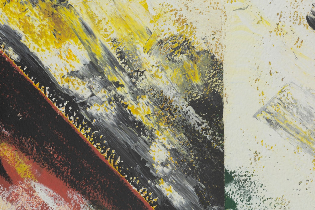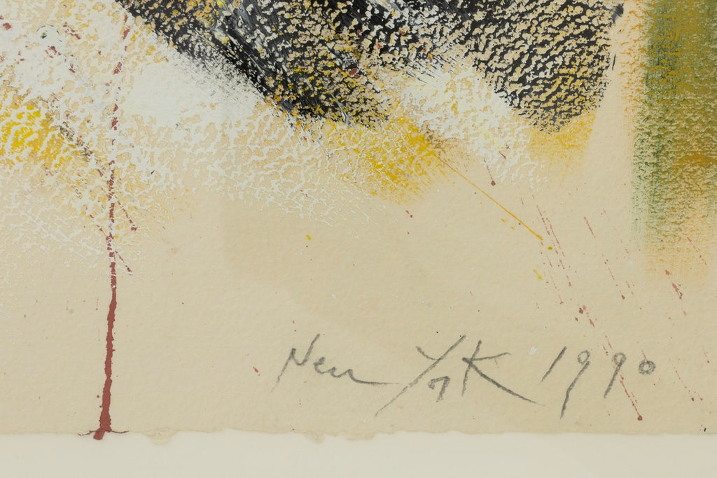 Abstract expressionist painting on paper titled "New York" by Argentine artist Perez Celis, created in 1990. Hand signed, titled and dated along the lower margin. The composition features sweeping gestural forms and layered areas of pigment rendered in black, yellow, red, and white. A large arcing shape moves across the surface, creating a sense of motion and structure, while areas of splattered and dripping paint add texture and spontaneity. The work appears on two joined sheets of paper. Perez Celis was known for expressive abstract compositions that often referenced architectural forms and cultural themes from Latin America and the cities where he worked. This painting reflects the artist’s energetic brushwork and bold color contrasts during a period when he was actively exhibiting internationally. A signed work from this period provides collectors with an example of Celis’ abstract expressionist style and his connection to the New York art scene of the late 20th century.