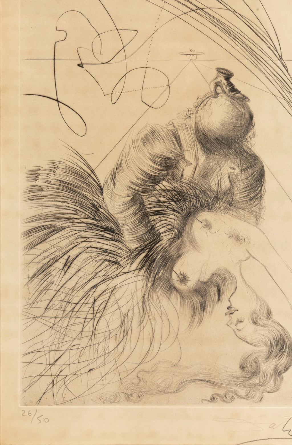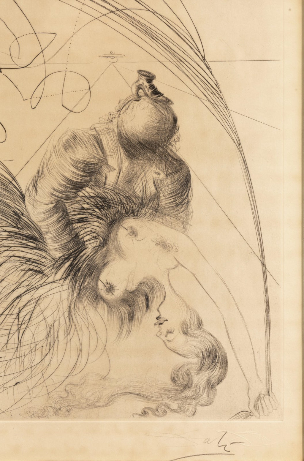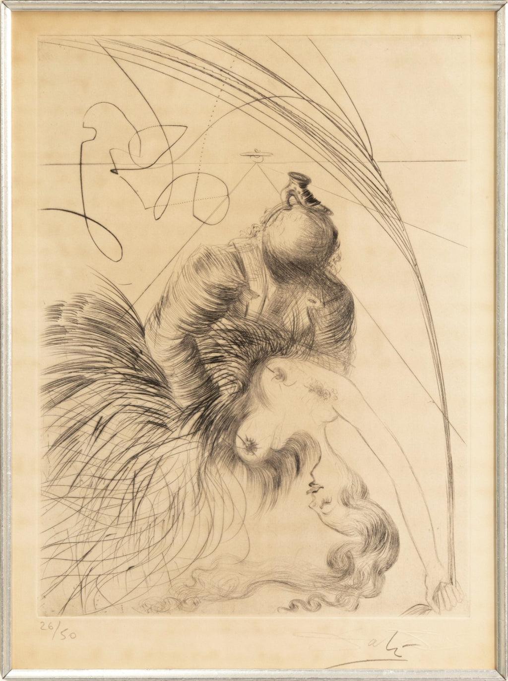 A drypoint etching on paper titled “Femme a la Chaussure (Woman with Shoe)” from the “Venus aux Fourrures (Venus in Furs)” series by Salvador Dali. Hand signed in pencil on the lower right with an annotation of 26/50 on the lower left with the blindstamp Dali. Published by Pierre Argillet, Paris in 1968. Certificate of Authenticity included from Dali expert, Bruce Hochman. Reference: Field 68-6. The intaglio depicts a reclining female figure rendered in fine, linear detail, accompanied by a male figure positioned above. The composition incorporates sweeping arcs and abstract linear elements characteristic of Dali’s late 1960s graphic work; it reflects Dali’s continued engagement with figurative and surreal subject matter in etching.Provenance: From a private collection. Dimensions: 26.5”h x 22.75”w x 1”d (framed). Overall very good condition. The sheet appears clean and well preserved. Full condition reports available upon request.Salvador Dali (1904–1989) was a Spanish painter, printmaker, and writer and a central figure of the Surrealist movement. Known for his detailed draftsmanship and dreamlike imagery, he became one of the most widely recognized artists of the twentieth century. Dali exhibited internationally throughout his career, with major retrospectives organized by institutions including the Museum of Modern Art, New York, and the Centre Pompidou, Paris. In 1982, he was granted the title Marqués de Dali de Pubol by King Juan Carlos I of Spain. His works are held in major museum collections worldwide, and the Teatro-Museo Dalí in Figueres, Spain, was established to preserve and present his legacy.