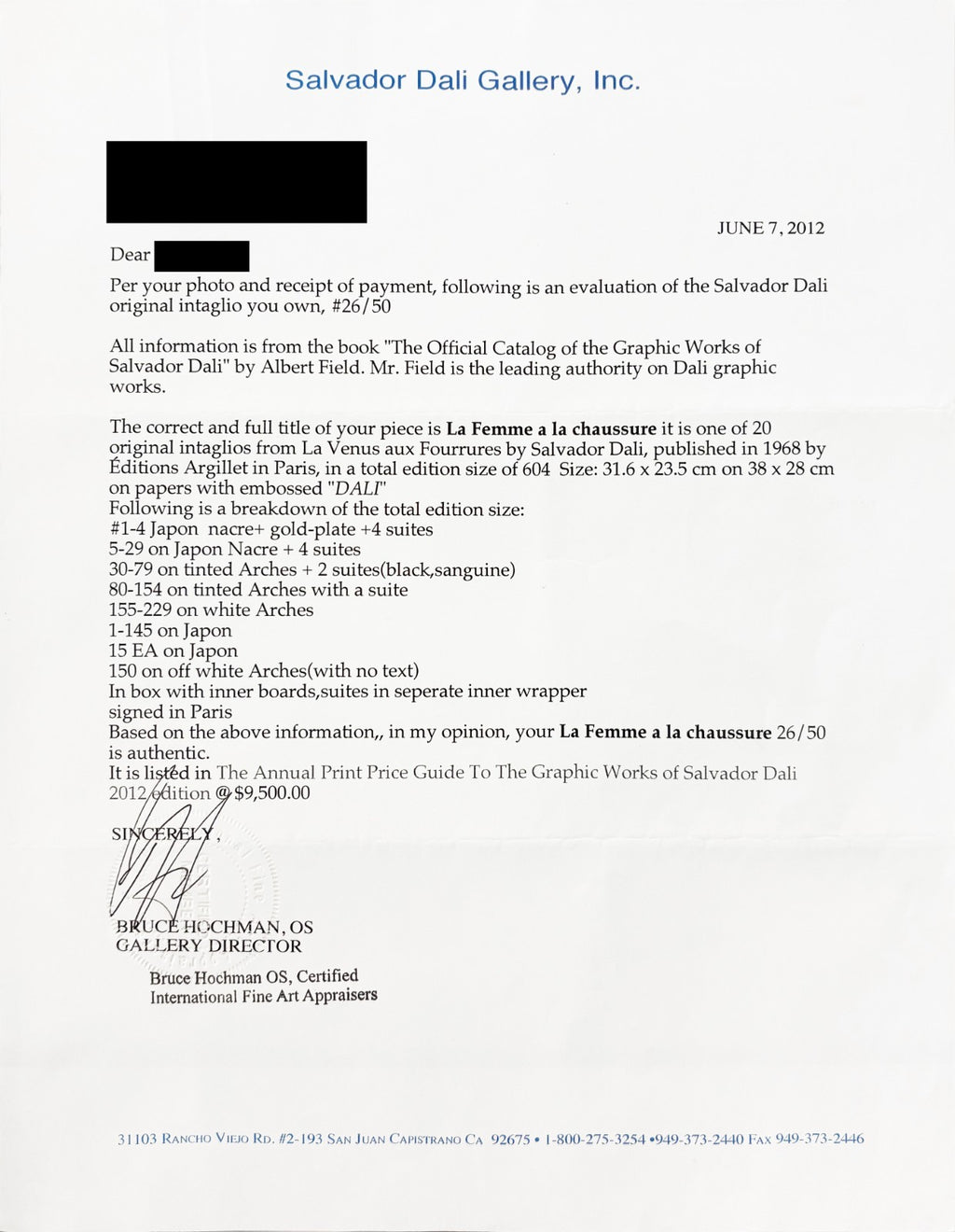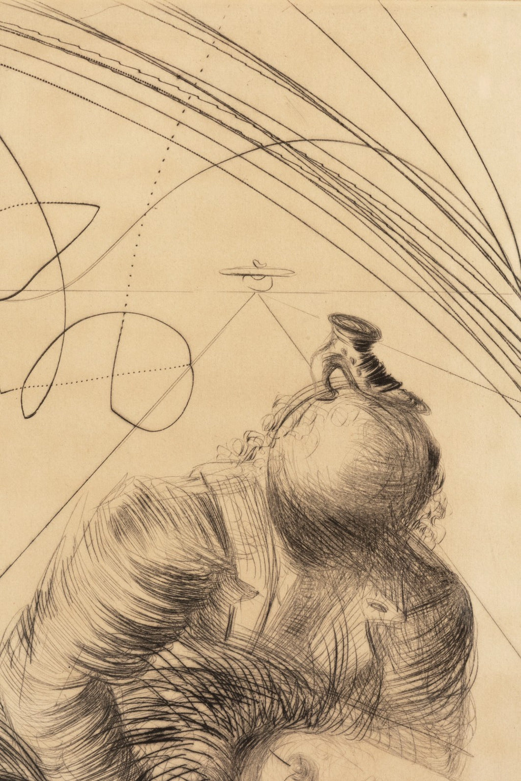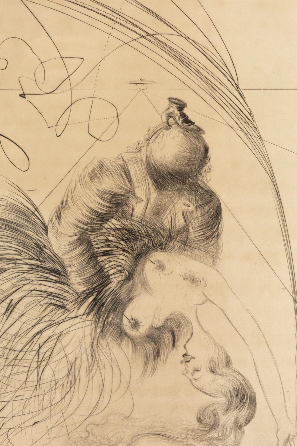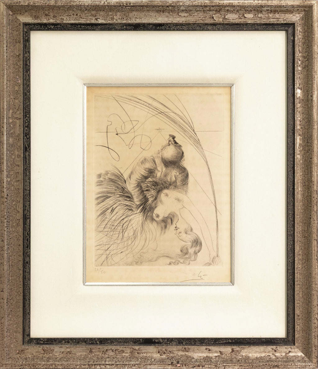 A drypoint etching on paper titled “Femme a la Chaussure (Woman with Shoe)” from the “Venus aux Fourrures (Venus in Furs)” series by Salvador Dali. Hand signed in pencil on the lower right with an annotation of 26/50 on the lower left with the blindstamp Dali. Published by Pierre Argillet, Paris in 1968. Certificate of Authenticity included from Dali expert, Bruce Hochman. Reference: Field 68-6. The intaglio depicts a reclining female figure rendered in fine, linear detail, accompanied by a male figure positioned above. The composition incorporates sweeping arcs and abstract linear elements characteristic of Dali’s late 1960s graphic work; it reflects Dali’s continued engagement with figurative and surreal subject matter in etching.Provenance: From a private collection. Dimensions: 26.5”h x 22.75”w x 1”d (framed). Overall very good condition. The sheet appears clean and well preserved. Full condition reports available upon request.Salvador Dali (1904–1989) was a Spanish painter, printmaker, and writer and a central figure of the Surrealist movement. Known for his detailed draftsmanship and dreamlike imagery, he became one of the most widely recognized artists of the twentieth century. Dali exhibited internationally throughout his career, with major retrospectives organized by institutions including the Museum of Modern Art, New York, and the Centre Pompidou, Paris. In 1982, he was granted the title Marqués de Dali de Pubol by King Juan Carlos I of Spain. His works are held in major museum collections worldwide, and the Teatro-Museo Dalí in Figueres, Spain, was established to preserve and present his legacy.