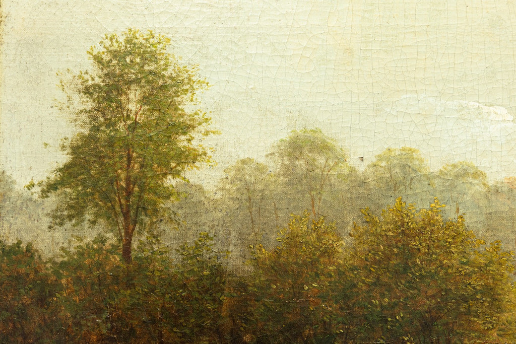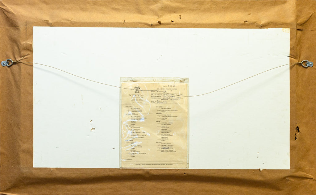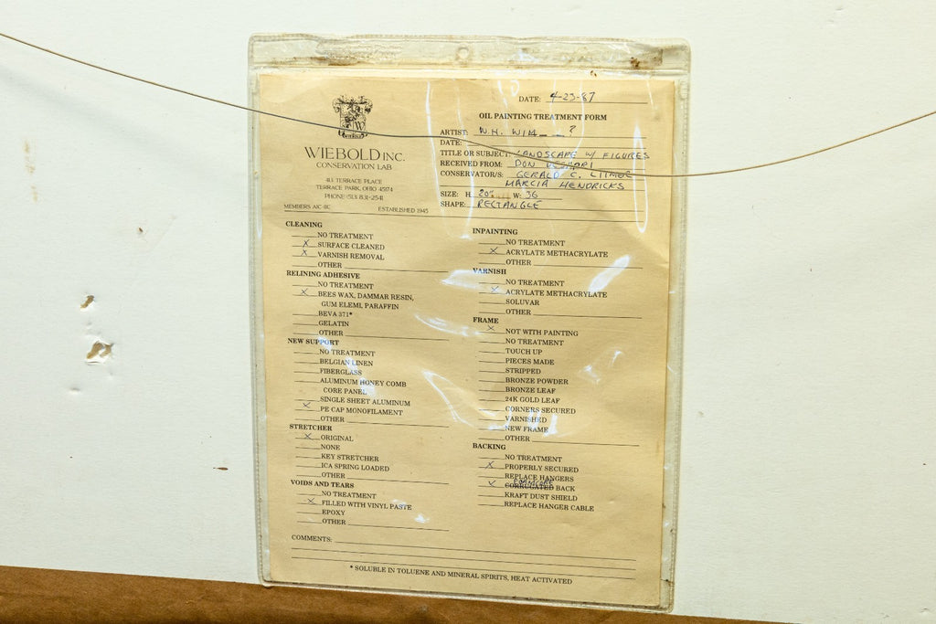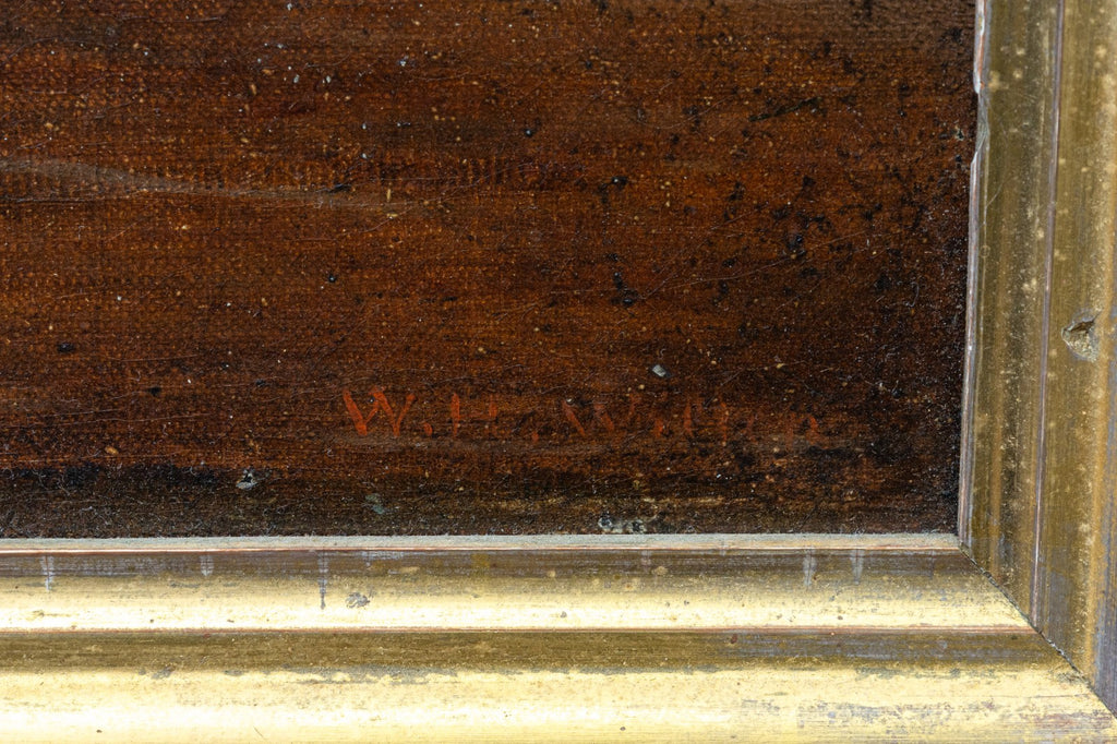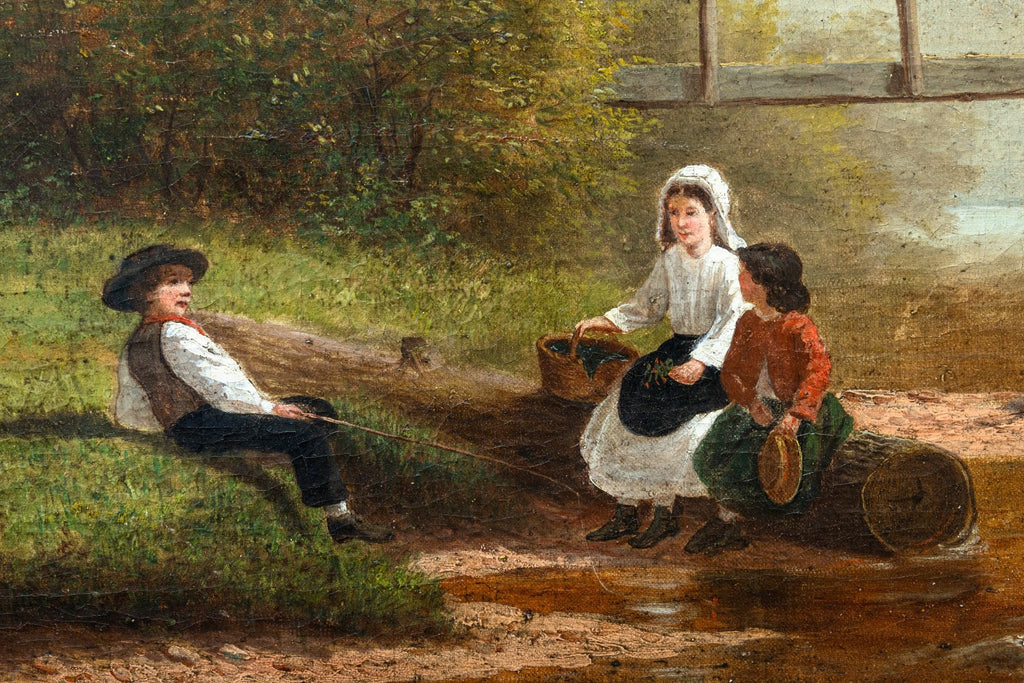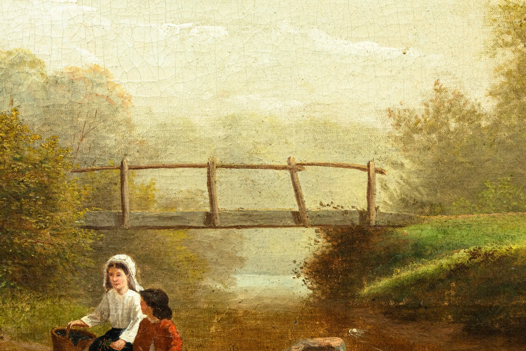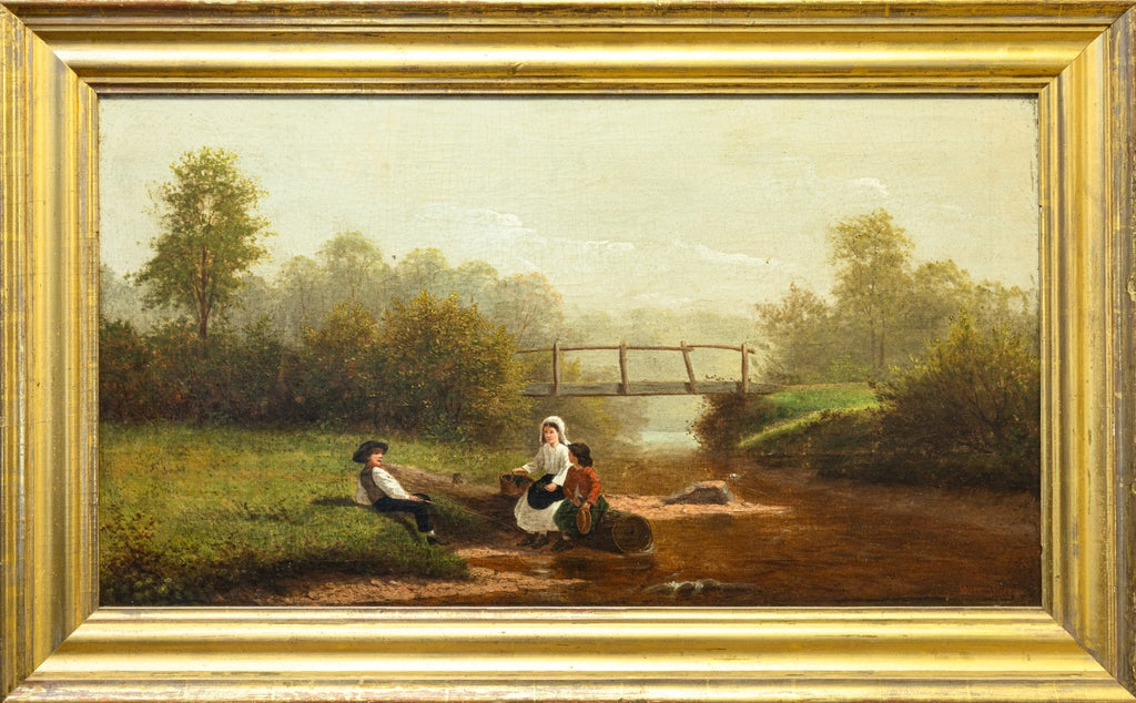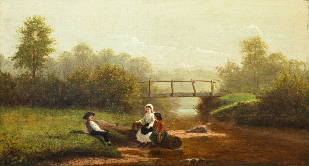 A late 19th century American Realism genre scene Untitled (Landscape with Children) by William H. Wilcox. Signed lower right. A tranquil rural scene with pastoral grace and charming details. In the foreground, three children—two girls and a boy—sit near the edge of a gently flowing creek, engaged in quiet conversation. One girl wears a white bonnet and dress, while the others are in more rustic attire, their baskets and hats resting beside them. Behind them, a rustic wooden footbridge arches over the stream, leading into a lush landscape of trees and bushes bathed in soft, diffused light. The artist’s delicate brushwork and warm palette evoke a serene, nostalgic atmosphere that celebrates the simplicity and beauty of country life. Provenance: Collection of Bloomfield Fine Arts Gallery, formally in Birmingham, Michigan. Dimensions: 26”h x 42”w x 2”d (framed). In good vintage condition. Full condition reports are available upon request. William H. Willcox (1831–1929) was an American painter renowned for his detailed landscapes, coastal scenes, and portraits, primarily active in Pennsylvania and New York. His works often depict serene natural settings and historical locales, reflecting a meticulous attention to detail and composition. Willcox's paintings have been featured in various exhibitions and are held in esteemed collections. Notably, his 1875 oil painting Skating on the Schuylkill, illustrating over 100 skaters on the frozen river, was part of the Dick Button Skating Collection and auctioned by Brunk Auctions in 2019. Throughout his career, Willcox's artworks have been sought after in the art market, with pieces like The Wissahickon in October (1898) and View in Cromwell, Connecticut with Middletown in the Distance (1889) achieving significant attention at auctions. While specific awards and museum exhibitions during his lifetime are not extensively documented, Willcox's legacy endures through his contributions to American landscape painting and the continued appreciation of his work by collectors and art enthusiasts.